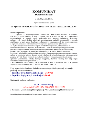 KOMUNIKAT Dyrektora Szkoły z dnia 31 grudnia 2014r. wprowadzona zostaje opłata za wydanie DUPLIKATU ŚWIADECTWA I LEGITYMACJI SZKOLNY Podstawa prawna: Zgodnie z rozporządzeniem MINISTRA ROZPORZĄDZENIE MINISTRA EDUKACJI NARODOWEJ z dnia 11 marca 2008 r. (Dz.U. 67 poz. 412) zmieniające rozporządzenie w sprawie zasad wydawania oraz wzorów świadectw, dyplomów państwowych i innych druków szkolnych, sposobu dokonywania ich sprostowań i wydawania duplikatów, a także zasad legalizacji dokumentów przeznaczonych do obrotu prawnego z zagranicą oraz zasad odpłatności za wykonywanie tych czynności § 19 ust. 3: Za wydanie duplikatu świadectwa, odpisu świadectwa dojrzałości, odpisu aneksu do świadectwa dojrzałości, dyplomu, zaświadczenia i indeksu oraz za legalizację dokumentu przeznaczonego do obrotu prawnego z zagranicą pobiera się opłatę w wysokości równej kwocie opłaty skarbowej od legalizacji dokumentu (tj. 26 zł). Za wydanie duplikatu legitymacji szkolnej lub legitymacji przedszkolnej dla dziecka niepełnosprawnego pobiera się opłatę w wysokości równej kwocie opłaty skarbowej od poświadczenia własnoręczności podpisu (tj 9 zł). Opłatę wnosi się na rachunek bankowy wskazany odpowiednio przez dyrektora przedszkola, szkoły, komisji okręgowej, kuratora oświaty lub inny organ dokonujący odpowiedniej czynności."; - ROZPORZĄDZENIE MINISTRA FINANSÓW z dnia 28 września 2007 r. w sprawie zapłaty - opłaty skarbowej (Dz.U. Nr 225, poz. 1635, z 2007 r.). Przy wyrabianiu duplikatu świadectwa szkolnego lub legitymacji szkolnej prosimy o wpłacanie kwot: - duplikat świadectwa szkolnego – 26,00 zł - duplikat legitymacji szkolnej – 9,00 zł Należność wpłacać na konto: PKO Gorzów Wlkp. nr konta 05 1020 1954 00007402 0151 1278 z dopiskiem - „opłata za duplikat legitymacji ” lub „opłata za duplikat świadectwa” Dowód wpłaty należy dołączyć do podania o wydanie duplikatu.
