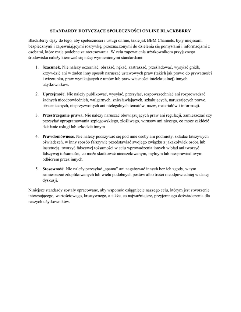 STANDARDY DOTYCZĄCE SPOŁECZNOŚCI ONLINE BLACKBERRY BlackBerry dąży do tego, aby społeczności i usługi online, takie jak BBM Channels, były miejscami bezpiecznymi i zapewniającymi rozrywkę, przeznaczonymi do dzielenia się pomysłami i informacjami z osobami, które mają podobne zainteresowania. W celu zapewnienia użytkownikom przyjaznego środowiska należy kierować się niżej wymienionymi standardami: 1. Szacunek. Nie należy oczerniać, obrażać, nękać, zastraszać, prześladować, wysyłać gróźb, krzywdzić ani w żaden inny sposób naruszać ustawowych praw (takich jak prawo do prywatności i wizerunku, praw wynikających z umów lub praw własności intelektualnej) innych użytkowników. 2. Uprzejmość. Nie należy publikować, wysyłać, przesyłać, rozpowszechniać ani rozprowadzać żadnych nieodpowiednich, wulgarnych, zniesławiających, szkalujących, naruszających prawo, obscenicznych, nieprzyzwoitych ani nielegalnych tematów, nazw, materiałów i informacji. 3. Przestrzeganie prawa. Nie należy naruszać obowiązujących praw ani regulacji, zamieszczać czy przesyłać oprogramowania szpiegowskiego, złośliwego, wirusów ani niczego, co może zakłócić działanie usługi lub szkodzić innym. 4. Prawdomówność. Nie należy podszywać się pod inne osoby ani podmioty, składać fałszywych oświadczeń, w inny sposób fałszywie przedstawiać swojego związku z jakąkolwiek osobą lub instytucją, tworzyć fałszywej tożsamości w celu wprowadzenia innych w błąd ani tworzyć fałszywej tożsamości, co może skutkować nieoczekiwanym, mylnym lub niesprawiedliwym odbiorem przez innych. 5. Stosowność. Nie należy przesyłać „spamu” ani nagabywać innych bez ich zgody, w tym zamieszczać zduplikowanych lub wielu podobnych postów albo treści nieodpowiedniej w danej dyskusji. Niniejsze standardy zostały opracowane, aby wspomóc osiągnięcie naszego celu, którym jest stworzenie interesującego, wartościowego, kreatywnego, a także, co najważniejsze, przyjemnego doświadczenia dla naszych użytkowników.