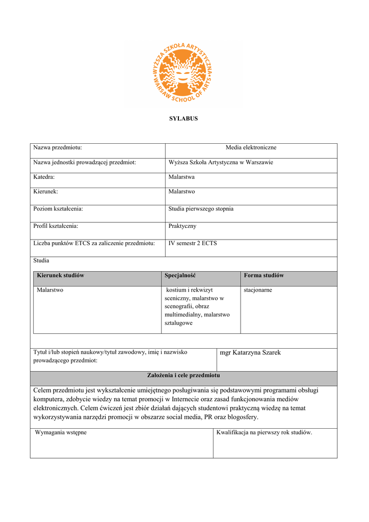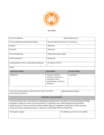 SYLABUS Nazwa przedmiotu: Media elektroniczne Nazwa jednostki prowadzącej przedmiot: Wyższa Szkoła Artystyczna w Warszawie Katedra: Malarstwa Kierunek: Malarstwo Poziom kształcenia: Studia pierwszego stopnia Profil kształcenia: Praktyczny Liczba punktów ETCS za zaliczenie przedmiotu: IV semestr 2 ECTS Studia Kierunek studiów Specjalność Forma studiów Malarstwo kostium i rekwizyt sceniczny, malarstwo w scenografii, obraz multimedialny, malarstwo sztalugowe stacjonarne Tytuł i/lub stopień naukowy/tytuł zawodowy, imię i nazwisko prowadzącego przedmiot: mgr Katarzyna Szarek Założenia i cele przedmiotu Celem przedmiotu jest wykształcenie umiejętnego posługiwania się podstawowymi programami obsługi komputera, zdobycie wiedzy na temat promocji w Internecie oraz zasad funkcjonowania mediów elektronicznych. Celem ćwiczeń jest zbiór działań dających studentowi praktyczną wiedzę na temat wykorzystywania narzędzi promocji w obszarze social media, PR oraz blogosfery. Wymagania wstępne Kwalifikacja na pierwszy rok studiów. Zamierzony efekt kształcenia Symbol efektu kształcenia na poziomie kierunku K_W04 K_U02 K_U15 K_U20 K_U23 K_K03 K_K04 K_K11 Opis efektów kształcenia na poziomie przedmiotu Rozumie podstawowe zagadnienia technologiczne na temat promocji w Internecie oraz zasad funkcjonowania mediów elektronicznych. Umie kreatywnie wykorzystać własną wyobraźnię i ekspresję artystyczną w celu wykorzystywania narzędzi edytora tekstu, arkusza kalkulacyjnego oraz promocji w obszarze social media, PR i blogosfery. Umie posługiwać się podstawowymi programami obsługi komputera, prezentacji multimedialnej, edytorami tekstu oraz sprzętami służącymi do rejestracji obrazu i dźwięku. Umie świadomie i odpowiedzialnie wykonać prezentację swojego projektu w formie prezentacji multimedialnej i strony internetowej. świadomego zastosowania form zachowań związanego z publicznymi prezentacjami własnych dokonań twórczych Jest zdolny do uczenia i pogłębiania swojej wiedzy dotyczących najnowszych technologii w mediach elektronicznych i wykorzystania jej w promocji swoich prac i projektów w obszarze social media, PR lub blogosfery. Potrafi efektywnie wykorzystać wyobraźnię, intuicję, twórczą postawę i samodzielne myślenie w celu samodzielnej promocji własnych osiągnięć zawodowych, znajomość terminologii dotyczących social media, Public Relations oraz blogosfery. Jest zdolny do prezentowania swoich projektów w przystępnej formie z wykorzystaniem współczesnych technologii prezentacyjnych poznanych na zajęciach. 2 Weryfikacja efektu kształcenia Zaliczenia przedmiotu na podstawie: • prezentacja pracy wykonanej podczas trwania semestruportfolio artystyczne; • prezentacja autoreferatu, • frekwencja ; Liczba godzin dydaktycznych i formy zajęć i punkty ECTS: Liczba godzin dydaktycznych (w tym): Przedmioty Forma zajęć: (W - wykład, Ć - ćwiczenia, K konwersatorium) Razem W Ć W+Ć 30 10 20 Media elektroniczne Rok I Rok II Semestr I W Ć K ECTS Semestr II R W K Ć K ECTS Rok III Semestr III R W Ć K ECTS Semestr IV R W Ć 10 20 K Rok IV Semestr V ECTS R 2 Zo W Ć K ECTS Semestr VI R W Ć K ECTS Semestr VII R W Ć K ECTS R R – rygor (egzamin, - E, zaliczenie z oceną –Zo, zaliczenie – Z) Treści programowe nauczania [ treść zajęć] SEMESTR IV Wykład 1-2 Wprowadzenie do zagadnień związanych z Public Relations. Co to jest PR, media relations, event, CSR. Rola Public Relations w promocji i marketingu. Struktura w działach marketingu firm. Wykład 3-4 Blogosfera i inne miejsca publikacyjne w Internecie. Czym jest blog i jaką formę promocji daje blogosfera. Serwisy blogowe. Omówienie najpopularniejszych portali i ich właściwości. Wykład 5-6 Sytuacje kryzysowe w działaniach promocyjnych. Omówienie przykładów i sposobów rozwiązywania kryzysów komunikacyjnych w obszarze social media oraz PR. Wykład 7-8 Czym jest Social media. Rodzaje serwisów internetowych. Facebook, Twitter, Nasza Klasa, Blip, Youtube. Omówienie najważniejszych funkcji serwisów. Wykład 9-10 Sztuka Budowania relacji z mediami, omówienie zasad kontaktów z mediami, stopnie budowania relacji z mediami. Zasady pisania dobrych komunikatów dla prasy; Język w komunikacji pisemnej. Ćwiczenie 1-2 Zasady tworzenia blogów, omówienie poszczególnych narzędzi używanych przy budowaniu bloga. Tworzenie kont w obszarze social media, ćwiczenia dotyczące promocji w Internecie. Ćwiczenie 3-6 Pisanie notek prasowych, przygotowanie Press packów, Dobór materiałów graficznych. Ćwiczenie 7-14 Modelowe budowanie kampanii w Internecie na przykładzie wystawy prac studentów (konkurs Gaja). Logistyka, Pubic Relations, Social Media. Ćwiczenie 15-16 Zajęcia praktyczne z obsługi programu Excel. Ćwiczenie 17-20 Sztuka autoprezentacji. Indywidualne ćwiczenia z wystąpień publicznych. Gestykulacja, mimika, mowa ciała. Analiza i ocena zachowawcza Zagadnienia programowe nauczania: Narzędzie/ metody dydaktyczne: Ćwiczenia prowadzone w pracowniach komputerowych, uzupełnione dyskusją ze studentami, pracą grupową. Forma i sposób zaliczenia oraz wymagania egzaminacyjne: Każdy ze studentów zobowiązany jest do zaliczenia przedmiotu na podstawie napisania 15 notatek (min min 700 znaków, każdy tekst) dotyczący zagadnień związanych z tematyką wizażu, charakteryzacji, grafiki. Wielkość tekstu: min 700 znaków. Metody i kryteria oceny: Aktywność na ćwiczeniach, zapoznanie się z literaturą i zagadnieniami dotyczącymi tematyki wizażu, charakteryzacji i 3 grafiki. Wymagania końcowe: Zaliczenie z oceną; studenci mają prawo do dwóch nieusprawiedliwionych nieobecności. Całkowity nakład pracy studenta potrzebny do osiągnięcia założonych efektów w godzinach oraz punktach ECTS Media elektroniczne Godziny kontaktowe z nauczycielem akademickim Liczba godzin (kontakto we i samodziel na praca studenta) 1 pun kt EC TS= 25h 1 pun kt EC TS= 30h