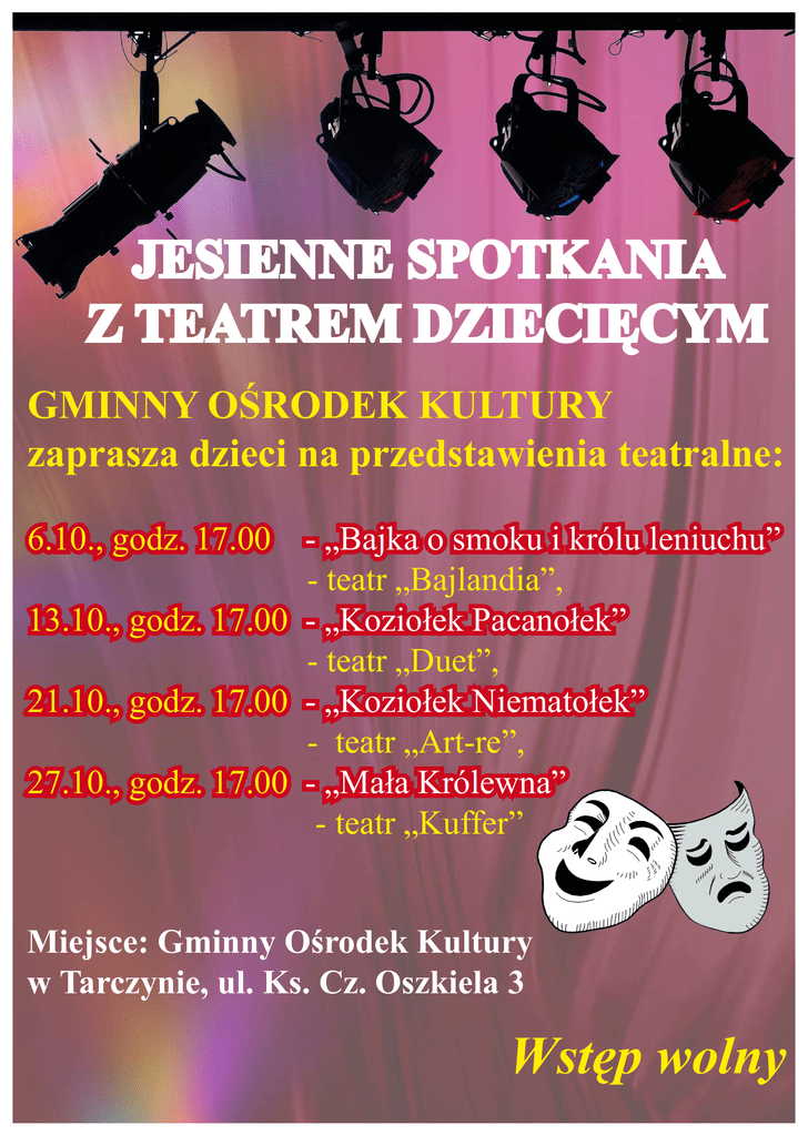 JESIENNE SPOTKANIA Z TEATREM DZIECIĘCYM GMINNY OŚRODEK KULTURY zaprasza dzieci na przedstawienia teatralne: 6.10., godz. 17.00 - „Bajka o smoku i królu leniuchu” - teatr „Bajlandia”, 13.10., godz. 17.00 - „Koziołek Pacanołek” - teatr „Duet”, 21.10., godz. 17.00 - „Koziołek Niematołek” - teatr „Art-re”, 27.10., godz. 17.00 - „Mała Królewna” - teatr „Kuffer” Miejsce: Gminny Ośrodek Kultury w Tarczynie, ul. Ks. Cz. Oszkiela 3 Wstęp wolny