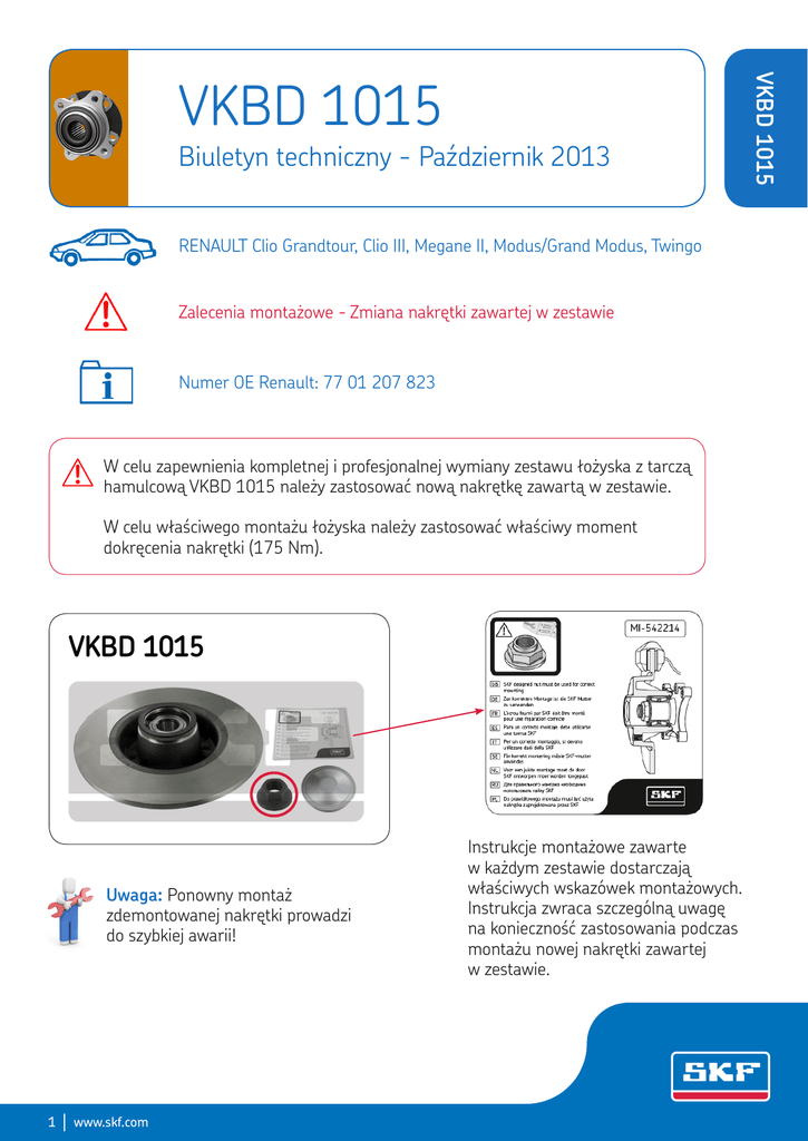 Biuletyn techniczny - Październik 2013 RENAULT Clio Grandtour, Clio III, Megane II, Modus/Grand Modus, Twingo Zalecenia montażowe - Zmiana nakrętki zawartej w zestawie Numer OE Renault: 77 01 207 823 W celu zapewnienia kompletnej i profesjonalnej wymiany zestawu łożyska z tarczą hamulcową VKBD 1015 należy zastosować nową nakrętkę zawartą w zestawie. W celu właściwego montażu łożyska należy zastosować właściwy moment dokręcenia nakrętki (175 Nm). Uwaga: Ponowny montaż zdemontowanej nakrętki prowadzi do szybkiej awarii! 1 www.skf.com Instrukcje montażowe zawarte w każdym zestawie dostarczają właściwych wskazówek montażowych. Instrukcja zwraca szczególną uwagę na konieczność zastosowania podczas montażu nowej nakrętki zawartej w zestawie. VKBD 1015 VKBD 1015 Poprzedni wzór nakrętki Nowy wzór nakrętki Moment dokręcenia: 175 Nm Uwaga: Naklejka ostrzegawcza umieszczona na pudełku informuje, że nakrętka niezbedna podczas montażu znajduję sie w środku. ® SKF to zastrzeżony znak handlowy SKF Group. © SKF Group 2013 Treść niniejszej publikacji jest własnością wydawcy i nie może być reprodukowane (nawet częściowo) bez uprzedniego pisemnego pozwolenia. Zapewniono dokładność informacji zawartych w niniejszej publikacji ale wydawca nie przyjmuje żadnej odpowiedzialności za jakiekolwiek szkody lub straty pośrednie, bezpośrednie lub wtórne wynikające z wykorzystania informacji tu zawartych. 2 www.skf.com