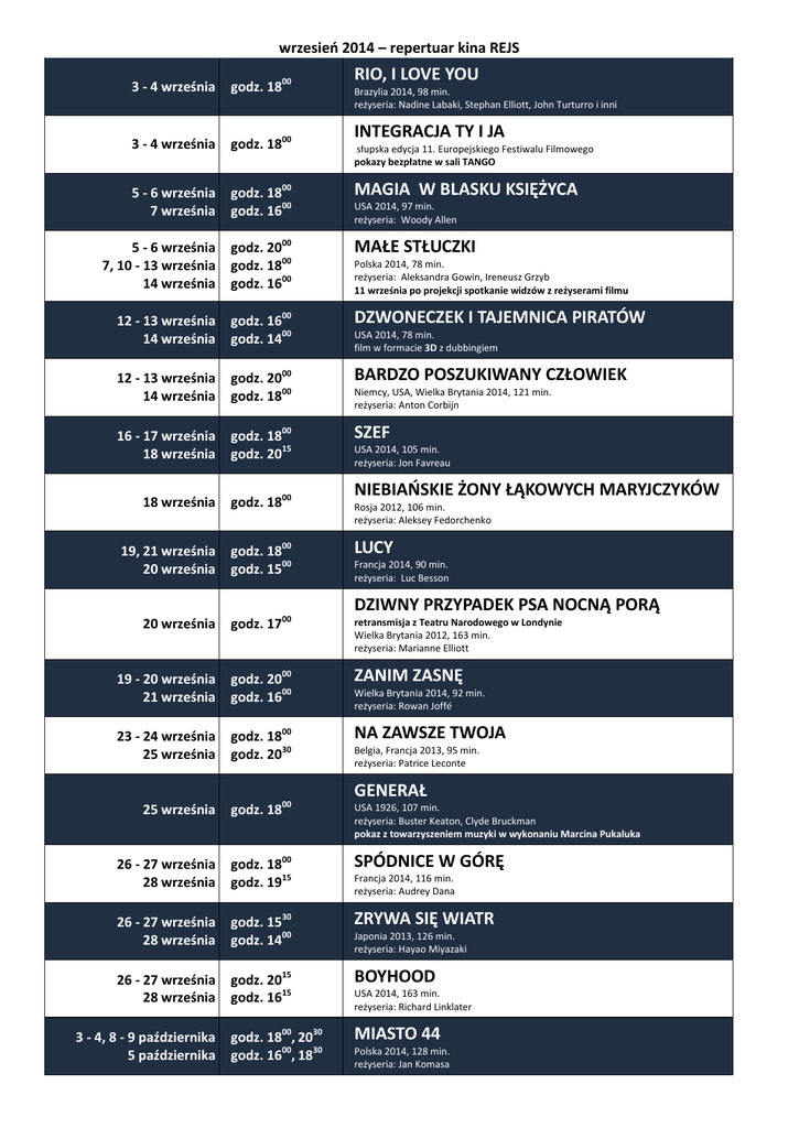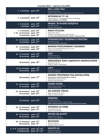 wrzesień 2014 – repertuar kina REJS RIO, I LOVE YOU 3 - 4 września godz. 1800 3 - 4 września godz. 1800 5 - 6 września 7 września godz. 1800 godz. 1600 MAGIA W BLASKU KSIĘŻYCA 5 - 6 września 7, 10 - 13 września 14 września godz. 2000 godz. 1800 godz. 1600 MAŁE STŁUCZKI 12 - 13 września 14 września godz. 1600 godz. 1400 DZWONECZEK I TAJEMNICA PIRATÓW 12 - 13 września 14 września godz. 2000 godz. 1800 BARDZO POSZUKIWANY CZŁOWIEK 16 - 17 września 18 września godz. 1800 godz. 2015 SZEF 18 września godz. 1800 19, 21 września 20 września godz. 1800 godz. 1500 20 września 00 godz. 17 Brazylia 2014, 98 min. reżyseria: Nadine Labaki, Stephan Elliott, John Turturro i inni INTEGRACJA TY I JA słupska edycja 11. Europejskiego Festiwalu Filmowego pokazy bezpłatne w sali TANGO USA 2014, 97 min. reżyseria: Woody Allen Polska 2014, 78 min. reżyseria: Aleksandra Gowin, Ireneusz Grzyb 11 września po projekcji spotkanie widzów z reżyserami filmu USA 2014, 78 min. film w formacie 3D z dubbingiem Niemcy, USA, Wielka Brytania 2014, 121 min. reżyseria: Anton Corbijn USA 2014, 105 min. reżyseria: Jon Favreau NIEBIAŃSKIE ŻONY ŁĄKOWYCH MARYJCZYKÓW Rosja 2012, 106 min. reżyseria: Aleksey Fedorchenko LUCY Francja 2014, 90 min. reżyseria: Luc Besson DZIWNY PRZYPADEK PSA NOCNĄ PORĄ retransmisja z Teatru Narodowego w Londynie Wielka Brytania 2012, 163 min. reżyseria: Marianne Elliott 19 - 20 września 21 września godz. 2000 godz. 1600 ZANIM ZASNĘ 23 - 24 września 25 września godz. 1800 godz. 2030 NA ZAWSZE TWOJA 25 września godz. 1800 26 - 27 września 28 września godz. 1800 godz. 1915 SPÓDNICE W GÓRĘ 26 - 27 września 28 września godz. 1530 godz. 1400 ZRYWA SIĘ WIATR 26 - 27 września 28 września godz. 2015 godz. 1615 BOYHOOD godz. 1800, 2030 godz. 1600, 1830 MIASTO 44 3 - 4, 8 - 9 października 5 października Wielka Brytania 2014, 92 min. reżyseria: Rowan Joffé Belgia, Francja 2013, 95 min. reżyseria: Patrice Leconte GENERAŁ USA 1926, 107 min. reżyseria: Buster Keaton, Clyde Bruckman pokaz z towarzyszeniem muzyki w wykonaniu Marcina Pukaluka Francja 2014, 116 min. reżyseria: Audrey Dana Japonia 2013, 126 min. reżyseria: Hayao Miyazaki USA 2014, 163 min. reżyseria: Richard Linklater Polska 2014, 128 min. reżyseria: Jan Komasa