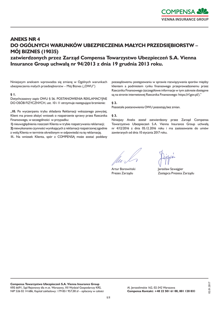 ANEKS NR 4 DO OGÓLNYCH WARUNKÓW UBEZPIECZENIA MAŁYCH PRZEDSIĘBIORSTW – MÓJ BIZNES (19035) zatwierdzonych przez Zarząd Compensa Towarzystwo Ubezpieczeń S.A. Vienna Insurance Group uchwałą nr 94/2013 z dnia 19 grudnia 2013 roku. § 1. Dotychczasowy zapis OWU § 56. POSTANOWIENIA REKLAMACYJNE DO OSÓB FIZYCZNYCH, ust. 10 i 11 otrzymuje następujące brzmienie: „10. Po wyczerpaniu trybu składania Reklamacji wskazanego powyżej, Klient ma prawo złożyć wniosek o rozpatrzenie sprawy przez Rzecznika Finansowego, w szczególności w przypadku: 1) nieuwzględnienia roszczeń Klienta w trybie rozpatrywania reklamacji; 2) niewykonanie czynności wynikających z reklamacji rozpatrzonej zgodnie z wolą Klienta w terminie określonym w odpowiedzi na tę reklamację. 11. Na wniosek Klienta, spór z COMPENSĄ może zostać poddany pozasądowemu postępowaniu w sprawie rozwiązywania sporów między klientem a podmiotem rynku finansowego przeprowadzonemu przez Rzecznika Finansowego (szczegółowe informacje w tym zakresie dostępne są na stronie internetowej Rzecznika Finansowego: https://rf.gov.pl/).” § 2. Pozostałe postanowienia OWU pozostają bez zmian. § 3. Niniejszy Aneks został zatwierdzony przez Zarząd Compensa Towarzystwo Ubezpieczeń S.A. Vienna Insurance Group uchwałą nr 4/12/2016 z dnia 05.12.2016 roku i ma zastosowanie do umów zawieranych od dnia 10 stycznia 2017 roku. Artur Borowiński Prezes Zarządu Compensa Towarzystwo Ubezpieczeń S.A. Vienna Insurance Group KRS 6691, Sąd Rejonowy dla m.st. Warszawy, XII Wydział Gospodarczy KRS, NIP 526 02 14 686, Kapitał zakładowy: 179 851 957,00 zł – opłacony w całości Jarosław Szwajgier Zastępca Prezesa Zarządu Al. Jerozolimskie 162, 02-342 Warszawa Compensa Kontakt: +48 22 501 61 00, 801 120 000 1/1 02.01.2017 Niniejszym aneksem wprowadza się zmianę w Ogólnych warunkach ubezpieczenia małych przedsiębiorstw – Mój Biznes („OWU”)