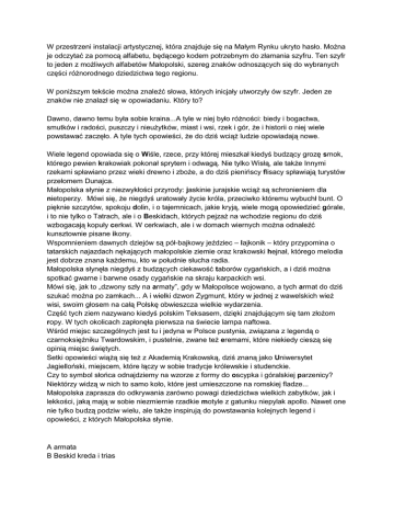 W przestrzeni instalacji artystycznej, która znajduje się na Małym Rynku ukryto hasło. Można je odczytać za pomocą alfabetu, będącego kodem potrzebnym do złamania szyfru. Ten szyfr to jeden z możliwych alfabetów Małopolski, szereg znaków odnoszących się do wybranych części różnorodnego dziedzictwa tego regionu. W poniższym tekście można znaleźć słowa, których inicjały utworzyły ów szyfr. Jeden ze znaków nie znalazł się w opowiadaniu. Który to? Dawno, dawno temu była sobie kraina...A tyle w niej było różności: biedy i bogactwa, smutków i radości, puszczy i nieużytków, miast i wsi, rzek i gór, że i historii o niej wiele powstawać zaczęło. A tyle tych opowieści, że do dziś wciąż ludzie opowiadają nowe. Wiele legend opowiada się o Wiśle, rzece, przy której mieszkał kiedyś budzący grozę smok, którego pewien krakowiak pokonał sprytem i odwagą. Nie tylko Wisłą, ale także Innymi rzekami spławiano przez wieki drewno i zboże, a do dziś pienińscy flisacy spławiają turystów przełomem Dunajca. Małopolska słynie z niezwykłości przyrody: jaskinie jurajskie wciąż są schronieniem dla nietoperzy. Mówi się, że niegdyś uratowały życie króla, przeciwko któremu wybuchł bunt. O pięknie szczytów, spokoju dolin, i o tajemnicach, jakie kryją, wiele mogą opowiedzieć górale, i to nie tylko o Tatrach, ale i o Beskidach, których pejzaż na wchodzie regionu do dziś wzbogacają kopuły cerkwi. W cerkwiach, ale i w domach wiernych można odnaleźć kunsztownie pisane ikony. Wspomnieniem dawnych dziejów są pół-bajkowy jeździec – lajkonik – który przypomina o tatarskich najazdach nękających małopolskie ziemie oraz krakowski hejnał, którego melodia jest dobrze znana każdemu, kto w południe słucha radia. Małopolska słynęła niegdyś z budzących ciekawość taborów cygańskich, a i dziś można spotkać gwarne i barwne osady cygańskie na skraju karpackich wsi. Mówi się, jak to „dzwony szły na armaty”, gdy w Małopolsce wojowano, a tych armat do dziś szukać można po zamkach... A i wielki dzwon Zygmunt, który w jednej z wawelskich wież wisi, swoim głosem na całą Polskę obwieszcza wielkie wydarzenia. Część tych ziem nazywano kiedyś polskim Teksasem, dzięki znajdującym się tam złożom ropy. W tych okolicach zapłonęła pierwsza na świecie lampa naftowa. Wśród miejsc szczególnych jest tu i jedyna w Polsce pustynia, związana z legendą o czarnoksiężniku Twardowskim, i pustelnie, zwane też eremami, które niekiedy cieszą się opinią miejsc świętych. Setki opowieści wiążą się też z Akademią Krakowską, dziś znaną jako Uniwersytet Jagielloński, miejscem, które łączy w sobie tradycje królewskie i studenckie. Czy to symbol słońca odnajdziemy na wzorze z formy do oscypka i góralskiej parzenicy? Niektórzy widzą w nich to samo koło, które jest umieszczone na romskiej fladze... Małopolska zaprasza do odkrywania zarówno powagi dziedzictwa wielkich zabytków, jak i lekkości, jaką mają w sobie niezmiernie rzadkie motyle z gatunku niepylak apollo. Nawet one nie tylko budzą podziw wielu, ale także inspirują do powstawania kolejnych legend i opowieści, z których Małopolska słynie. A armata B Beskid kreda i trias C cerkiew D dolina E erem F flisak G góral H hejnał I ikona J jaskinie krasowe K krakowiak L lajkonik tatarzy M motyl N nietoperz O oscypek Ó ósemka P parzenica R ropa w trzeciorzędzie S smok T tabor U uniwersytet W Wisła Z Zygmunt