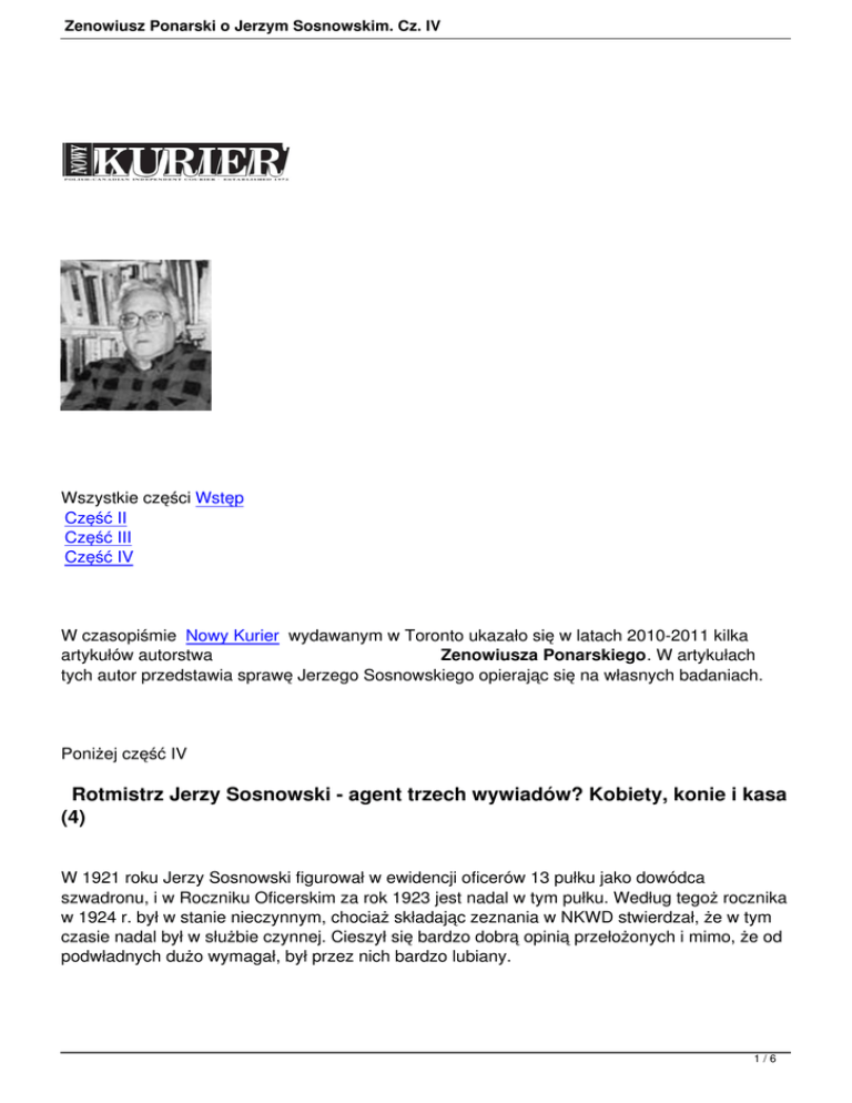 Zenowiusz Ponarski o Jerzym Sosnowskim. Cz. IV Wszystkie części Wstęp Część II Część III Część IV W czasopiśmie Nowy Kurier wydawanym w Toronto ukazało się w latach 2010-2011 kilka artykułów autorstwa Zenowiusza Ponarskiego. W artykułach tych autor przedstawia sprawę Jerzego Sosnowskiego opierając się na własnych badaniach. Poniżej część IV Rotmistrz Jerzy Sosnowski - agent trzech wywiadów? Kobiety, konie i kasa (4) W 1921 roku Jerzy Sosnowski figurował w ewidencji oficerów 13 pułku jako dowódca szwadronu, i w Roczniku Oficerskim za rok 1923 jest nadal w tym pułku. Według tegoż rocznika w 1924 r. był w stanie nieczynnym, chociaż składając zeznania w NKWD stwierdzał, że w tym czasie nadal był w służbie czynnej. Cieszył się bardzo dobrą opinią przełożonych i mimo, że od podwładnych dużo wymagał, był przez nich bardzo lubiany. 1/6 Zenowiusz Ponarski o Jerzym Sosnowskim. Cz. IV Przeniesiono go później do Dowództwa Korpusu w Warszawie -DOK – 1, na etat instruktora jeździeckiego. Na tym stanowisku dotrwał do końca 1924 roku. Przełożeni wypowiadali się o nim z uznaniem, a przez podwładnych jest nadal lubiany. Jako świetny jeździec zostaje członkiem ekipy olimpijskiej. W styczniu 1925 r. na własną prośbę otrzymał roczny płatny urlop i w tym czasie uczestniczył w międzynarodowych zawodach jeździeckich. Sowiecki historyk, który się nim zajmował napisał; „Prowadził do roku 1925 zwykły tryb życia oficera kawaleryjskiego - stwierdza Gilensen – szkolenia, hulanki, intrygi z kobietami. Lubił konie, wyścigi i był doskonałym jeźdźcem – sportsmenem, posiadaczem licznych nagród. Człowiekiem był śmiałym i zdecydowanym, opanowanym, nie bardzo wybrednym w wyborze środków dla osiągania swych zamierzeń”. Prof. Henryk Ćwięk zauważa: „Po zakończeniu działań zbrojnych kadra oficerska dostała przy działy do różnych garnizonów. W nowej rzeczywistości chcieli poznać smak życia pokojowego, a wiązały się z tym również kontakty z kobietami”. Do tego jak najbardziej słusznego stwierdzenia dodać należy, że odnosi się ono nie tylko niższych rangą oficerów, rzuconych do dużych i małych garnizonów, ale i ich przełożonych, ze stolicy i miast, gdzie były sztaby jednostek. Generałom i pułkownikom z legionów, często nie odpowiadały dawne żony, i stąd wyjazdy do Wilna, na Zawalną. Jak gminna wieść niesie, wystarczało wejść żonatym do konsystorza ewangelicko – reformowanego, i wyjść kawalerem. Można było także od razu wziąć ślub pod palmą - jak powiadano. Znany jest przypadek, że gdy mec. Bolesław Szyszkowski poprosił o rękę pewnej wilnianki, a jej matka zapytała, jak to się ma do tego, że jest żonatym. - Rozwód od ręki dostanę u kalwinów, a ślub odbędzie pod palmą odrzekł mecenas. A usłyszał w odpowiedzi: - Córka nie jest małpą aby ślubować pod palmą. Palma była najprawdziwsza i stała w sali ślubów konsystorza, jako niemy świadek licznych ceremonii ślubnych działaczy państwowych (m.in. Józefa Becka, Hołówki i in,) i wojskowych. Wykazy osób, które otrzymały w ekspresowym tempie rozwód i ślub, znajdują się w wileńskim archiwum. W związku z przygotowywaną o duszpasterzu tego kościoła, ks. Kazimierzu Ostachiewiczu, duchownym Jednoty Wileńskiej krytykującym łatwe udzielanie rozwodów i ślubów, zwróciłem się o udostępnienie tych wykazów. Okazało się,że istnieje zakaz udzielania informacji, który zostanie uchylony po upływie stosownie długiego terminu. I tak musimy poczekać, aby dowiedzieć się, kto i kiedy korzystał z usług usłużnych duchownych z ul. Zawalnej. A duszpasterz za krytykę istniejącej rozwodowej i ślubnej praktyki, został usunięty z wileńskiego konsystorza. Z publikacji „Rotmistrza Sosnowskiego” dowiadujemy się o romantycznej i skandalicznej historii naszego bohatera. Uroczą blondynkę Gabrysię, starszą od siebie o kilka lat odbił od szefa 2/6 Zenowiusz Ponarski o Jerzym Sosnowskim. Cz. IV sztabu pułku i jak pisze Ćwięk; „W chwili słabości Gabrysia zwierzyła mu się, że związek z szefem sztabu nie jest jeszcze zalegalizowany. Wkrótce Sosnowski, zaiste zakochany, zaproponował jej małżeństwo, co wywołało niesamowite zamieszanie … Żona Sosnowskiego była rozwódką, starszą od niego o kilka lat, matką trzynastoletniej córki - napisał. Niestety, niewiele o niej wiemy. Wiadomo, że w Warszawie zamieszkiwała w pobliżu toru mokotowskiego w skromnym, przerobionym z boksów, dwupokojowym mieszkaniu, Rotmistrz cały wolny czas poświęcał ulubionym koniom.... Jak widzimy, nie powiodło się małżonce rotmistrza, dla którego konie były najważniejsze. Janusz Piekałkiewicz, który napisał o nim dosyć obszerny szkic, żonie jego poświęci nie wiele uwagi. Podał on, że w marcu 1926 r. ten 29-letni oficer kawalerii i uczestnik turniejów jeździeckich, wyjechał do Berlina z sześcioma końmi wyścigowymi i żoną o osiemnaście lat starszą. (Dzieje szpiegostwa, W., 1999). Co prawda, miłość nie pyta o wiek, ale skłonny jestem w sprawie różnicy wieku, przyjąć wersję Ćwieka aniżeli Piekałkiewicza. Gabriela mogła być starszą o kilka lat od męża – rotmistrza, a nie o całe – 18-cie lat. Wiek jej można ustalić, na podstawie akt sprawy; w wykazie świadków aktu oskarżenia - Sosnowska Aleksandra Gabriela, zam. Warszawa Polana 66 m.22. Wiadomo, że świadek zobowiązany był podając personalia, wskazać swoje miejsce i datę urodzenia. Przed przyjazdem do stolicy Niemiec, w styczniu 1925 roku Sosnowski który na własną prośbę otrzymał urlop, wykorzystał go do udziału w międzynarodowych zawodach jeździeckich. Początkowo w Paryżu, gdzie nabył konie wyścigowe, a po kilku miesiącach w Berlinie, dokąd przewiózł stajnię, i gdzie uczestniczył w wyścigach jeździeckich. Pod koniec 1925 r. gdy kończył się roczny urlop, p