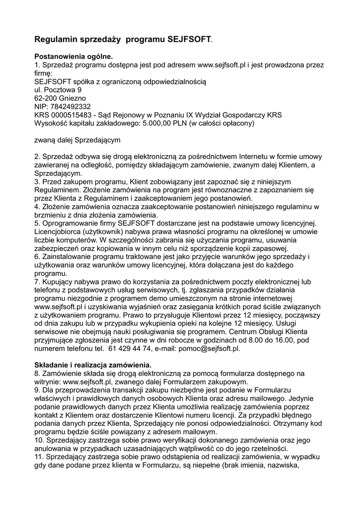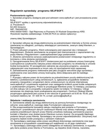 Regulamin sprzedaży programu SEJFSOFT. Postanowienia ogólne. 1. Sprzedaż programu dostępna jest pod adresem www.sejfsoft.pl i jest prowadzona przez firmę: SEJFSOFT spółka z ograniczoną odpowiedzialnością ul. Pocztowa 9 62-200 Gniezno NIP: 7842492332 KRS 0000515483 - Sąd Rejonowy w Poznaniu IX Wydział Gospodarczy KRS Wysokość kapitału zakładowego: 5.000,00 PLN (w całości opłacony) zwaną dalej Sprzedającym 2. Sprzedaż odbywa się drogą elektroniczną za pośrednictwem Internetu w formie umowy zawieranej na odległość, pomiędzy składającym zamówienie, zwanym dalej Klientem, a Sprzedającym. 3. Przed zakupem programu, Klient zobowiązany jest zapoznać się z niniejszym Regulaminem. Złożenie zamówienia na program jest równoznaczne z zapoznaniem się przez Klienta z Regulaminem i zaakceptowaniem jego postanowień. 4. Złożenie zamówienia oznacza zaakceptowanie postanowień niniejszego regulaminu w brzmieniu z dnia złożenia zamówienia. 5. Oprogramowanie firmy SEJFSOFT dostarczane jest na podstawie umowy licencyjnej. Licencjobiorca (użytkownik) nabywa prawa własności programu na określonej w umowie liczbie komputerów. W szczególności zabrania się użyczania programu, usuwania zabezpieczeń oraz kopiowania w innym celu niż sporządzenie kopii zapasowej. 6. Zainstalowanie programu traktowane jest jako przyjęcie warunków jego sprzedaży i użytkowania oraz warunków umowy licencyjnej, która dołączana jest do każdego programu. 7. Kupujący nabywa prawo do korzystania za pośrednictwem poczty elektronicznej lub telefonu z podstawowych usług serwisowych, tj. zgłaszania przypadków działania programu niezgodnie z programem demo umieszczonym na stronie internetowej www.sejfsoft.pl i uzyskiwania wyjaśnień oraz zasięgania krótkich porad ściśle związanych z użytkowaniem programu. Prawo to przysługuje Klientowi przez 12 miesięcy, począwszy od dnia zakupu lub w przypadku wykupienia opieki na kolejne 12 miesięcy. Usługi serwisowe nie obejmują nauki posługiwania się programem. Centrum Obsługi Klienta przyjmujące zgłoszenia jest czynne w dni robocze w godzinach od 8.00 do 16.00, pod numerem telefonu tel. 61 429 44 74, e-mail: [email protected]. Składanie i realizacja zamówienia. 8. Zamówienie składa się drogą elektroniczną za pomocą formularza dostępnego na witrynie: www.sejfsoft.pl, zwanego dalej Formularzem zakupowym. 9. Dla przeprowadzenia transakcji zakupu niezbędne jest podanie w Formularzu właściwych i prawidłowych danych osobowych Klienta oraz adresu mailowego. Jedynie podanie prawidłowych danych przez Klienta umożliwia realizację zamówienia poprzez kontakt z Klientem oraz dostarczenie Klientowi numeru licencji. Za przypadki błędnego podania danych przez Klienta, Sprzedający nie ponosi odpowiedzialności. Otrzymany kod programu będzie ściśle powiązany z adresem mailowym. 10. Sprzedający zastrzega sobie prawo weryfikacji dokonanego zamówienia oraz jego anulowania w przypadkach uzasadniających wątpliwość co do jego rzetelności. 11. Sprzedający zastrzega sobie prawo odstąpienia od realizacji zamówienia, w wypadku gdy dane podane przez klienta w Formularzu, są niepełne (brak imienia, nazwiska, adresu, adresu e-mail lub numeru telefonu), lub gdy dane podane przez Klienta są nieprawidłowe. 12. Zamówienia można składać 24 godziny na dobę, 7 dni w tygodniu. Zamówienia składane w soboty, niedziele i dni ustawowo wolne od pracy realizowane będą w chronologicznej kolejności ich złożenia, w pierwszym dniu roboczym, następującym po dniu, w którym zamówienie zostało złożone. 13. Klientowi zostanie przesłany numer licencji na adres e-mail podany przy składaniu zamówienia wraz z fakturą VAT po potwierdzeniu wpłaty należności za odpowiednią wersję programu. 14. Według wyboru Klienta za zamówiony produkt można zapłacić przelewem bankowym, kartą płatniczą, drukiem wpłat zamieszczonym na stronie internetowej wg systemu płatności przelewy24.pl. 15. W przypadku wybrania płatności w formie przelewu bankowego lub karty płatniczej właściwy kod aktywacyjny zostanie wysłany dopiero po zaksięgowaniu na rachunku bankowym Sprzedającego wpłaty pełnej kwoty za zamówiony produkt. 16. Sprzedający prowadzi sprzedaż w formie elektronicznej wysyłając do Klienta drogą elektroniczną kod aktywacyjny na fakturze do zamówionego programu. 17. Wszystkie ceny pakietów oferowanych na stronie internetowej są podawane w Polskich Złotych i zawierają 23% podatek VAT oraz w euro i dolarach i zawierają 23% podatek VAT. 18. Każdy zakup dokumentowany jest wystawioną przez Sprzedającego fakturą VAT lub odpowiednim rachunkiem wraz z kodem aktywacyjnym. 19. Sprzedający zastrzega sobie prawo do zmiany cen programu znajdującego się w ofercie, wprowadzania zmian w ofercie, oraz przeprowadzania akcji promocyjnych na stronie internetowej. Zmiana cen nie dotyczy zamówień przyjętych do realizacji. 20. Składając zamówienie Klient wyraża zgodę na przetwarzanie swoich danych osobowych przez Sprzedającego wyłącznie w celu realizacji zamówienia i w celach marketingowych. 21. Pod warunkiem wyrażenia zgody przez Klienta, dane Klienta wykorzystane będą przez Sprzedającego tylko i wyłącznie w celu informowania go o nowych produktach i promocjach. 22. Dane osobowe Kupującego chronione są przez Sprzedającego zgodnie z Ustawą o Ochronie Danych Osobowych. 23. Każdy Kupujący, który wypełnił Formularz, ma w każdym czasie możliwość dostępu do dotyczących go danych w celu ich weryfikacji, modyfikacji lub wystąpienia o ich usunięcie. Zwrot zakupionego towaru. 24. Licencje imienne: zgodnie z art. 10, ust. 3 "Ustawy z dnia 02.03.2000 roku o ochronie niektórych praw konsumentów oraz o odpowiedzialności za szkodę wyrządzoną przez produkt niebezpieczny", po opłaceniu przez Klienta licencji imiennej, nie jest możliwy zwrot zamówionego oprogramowania ze względu na prz