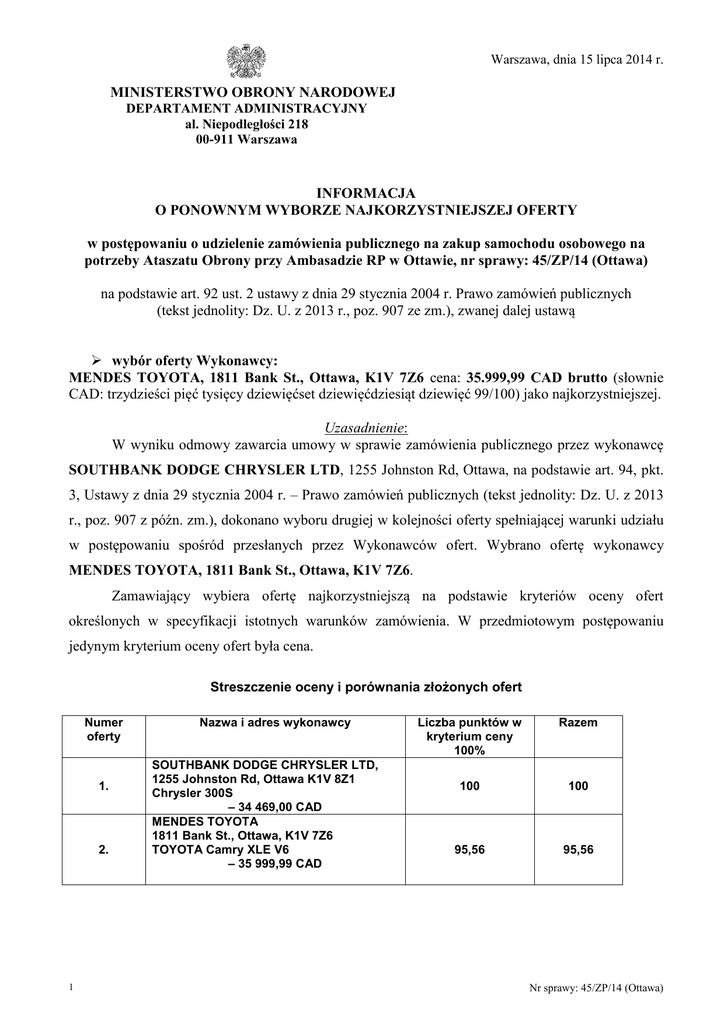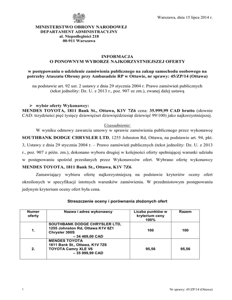 Warszawa, dnia 15 lipca 2014 r. MINISTERSTWO OBRONY NARODOWEJ DEPARTAMENT ADMINISTRACYJNY al. Niepodległości 218 00-911 Warszawa INFORMACJA O PONOWNYM WYBORZE NAJKORZYSTNIEJSZEJ OFERTY w postępowaniu o udzielenie zamówienia publicznego na zakup samochodu osobowego na potrzeby Ataszatu Obrony przy Ambasadzie RP w Ottawie, nr sprawy: 45/ZP/14 (Ottawa) na podstawie art. 92 ust. 2 ustawy z dnia 29 stycznia 2004 r. Prawo zamówień publicznych (tekst jednolity: Dz. U. z 2013 r., poz. 907 ze zm.), zwanej dalej ustawą wybór oferty Wykonawcy: MENDES TOYOTA, 1811 Bank St., Ottawa, K1V 7Z6 cena: 35.999,99 CAD brutto (słownie CAD: trzydzieści pięć tysięcy dziewięćset dziewięćdziesiąt dziewięć 99/100) jako najkorzystniejszej. Uzasadnienie: W wyniku odmowy zawarcia umowy w sprawie zamówienia publicznego przez wykonawcę SOUTHBANK DODGE CHRYSLER LTD, 1255 Johnston Rd, Ottawa, na podstawie art. 94, pkt. 3, Ustawy z dnia 29 stycznia 2004 r. – Prawo zamówień publicznych (tekst jednolity: Dz. U. z 2013 r., poz. 907 z późn. zm.), dokonano wyboru drugiej w kolejności oferty spełniającej warunki udziału w postępowaniu spośród przesłanych przez Wykonawców ofert. Wybrano ofertę wykonawcy MENDES TOYOTA, 1811 Bank St., Ottawa, K1V 7Z6. Zamawiający wybiera ofertę najkorzystniejszą na podstawie kryteriów oceny ofert określonych w specyfikacji istotnych warunków zamówienia. W przedmiotowym postępowaniu jedynym kryterium oceny ofert była cena. Streszczenie oceny i porównania złożonych ofert Numer oferty 1. 2. 1 Nazwa i adres wykonawcy SOUTHBANK DODGE CHRYSLER LTD, 1255 Johnston Rd, Ottawa K1V 8Z1 Chrysler 300S – 34 469,00 CAD MENDES TOYOTA 1811 Bank St., Ottawa, K1V 7Z6 TOYOTA Camry XLE V6 – 35 999,99 CAD Liczba punktów w kryterium ceny 100% Razem 100 100 95,56 95,56 Nr sprawy: 45/ZP/14 (Ottawa)