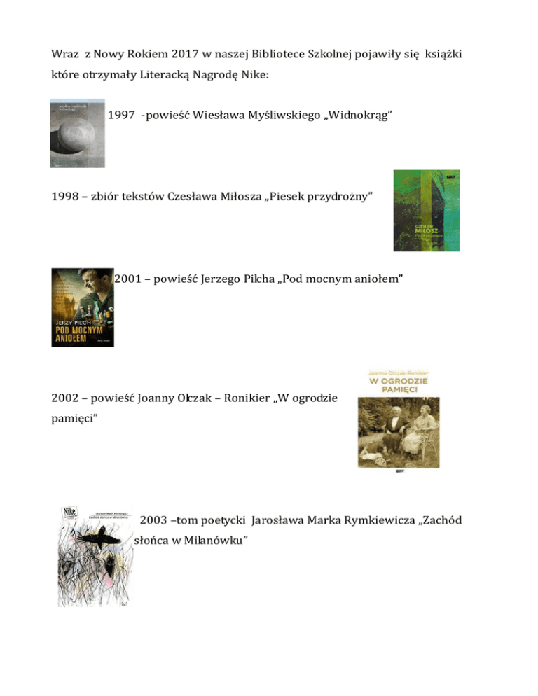 Wraz z Nowy Rokiem 2017 w naszej Bibliotece Szkolnej pojawiły się książki które otrzymały Literacką Nagrodę Nike: 1997 -powieść Wiesława Myśliwskiego „Widnokrąg” 1998 – zbiór tekstów Czesława Miłosza „Piesek przydrożny” 2001 – powieść Jerzego Pilcha „Pod mocnym aniołem” 2002 – powieść Joanny Olczak – Ronikier „W ogrodzie pamięci” 2003 –tom poetycki Jarosława Marka Rymkiewicza „Zachód słońca w Milanówku” 2004 – powieść Wojciecha Kuczoka „Gnój” 2005 – powieść Andrzeja Stasiuka „Jadąc do Babadag” 2006 – powieść Doroty Masłowskiej „Paw królowej” 2007 – powieść Wiesława Myśliwskiego „Traktat o łuskaniu fasoli” 2008 – powieść Olgi Tokarczuk „Bieguni” 2009 – tom poetycki Eugeniusza Tkaczyszyna – Dyckiego „Piosenka o zależnościach i uzależnieniach” 2011 – powieść Mariana Pilota „Pióropusz” 2012 – zbiór esejów Marka Bieńczyka „Książka twarzy” 2013 – powieść Joanny Bator „Ciemność prawie noc” 2014 – autobiografia Karola Modzelewskiego „Zajeździmy kobyłę historii” 2015 – powieść Olgi Tokarczuk „Księgi Jakubowe” 2016 – tom Bronki Nowickiej „Nakarmić kamień”
