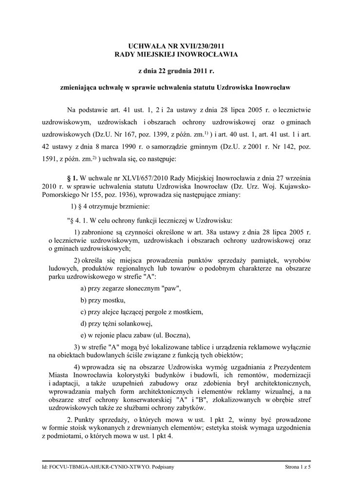 UCHWAŁA NR XVII/230/2011 RADY MIEJSKIEJ INOWROCŁAWIA z dnia 22 grudnia 2011 r. zmieniająca uchwałę w sprawie uchwalenia statutu Uzdrowiska Inowrocław Na podstawie art. 41 ust. 1, 2 i 2a ustawy z dnia 28 lipca 2005 r. o lecznictwie uzdrowiskowym, uzdrowiskach i obszarach ochrony uzdrowiskowej oraz o gminach uzdrowiskowych (Dz.U. Nr 167, poz. 1399, z późn. zm.1) ) i art. 40 ust. 1, art. 41 ust. 1 i art. 42 ustawy z dnia 8 marca 1990 r. o samorządzie gminnym (Dz.U. z 2001 r. Nr 142, poz. 1591, z późn. zm.2) ) uchwala się, co następuje: § 1. W uchwale nr XLVI/657/2010 Rady Miejskiej Inowrocławia z dnia 27 września 2010 r. w sprawie uchwalenia statutu Uzdrowiska Inowrocław (Dz. Urz. Woj. Kujawsko Pomorskiego Nr 155, poz. 1936), wprowadza się następujące zmiany: 1) § 4 otrzymuje brzmienie: "§ 4. 1. W celu ochrony funkcji leczniczej w Uzdrowisku: 1) zabronione są czynności określone w art. 38a ustawy z dnia 28 lipca 2005 r. o lecznictwie uzdrowiskowym, uzdrowiskach i obszarach ochrony uzdrowiskowej oraz o gminach uzdrowiskowych; 2) określa się miejsca prowadzenia punktów sprzedaży pamiątek, wyrobów ludowych, produktów regionalnych lub towarów o podobnym charakterze na obszarze parku uzdrowiskowego w strefie "A": a) przy zegarze słonecznym "paw", b) przy mostku, c) przy alejce łączącej pergole z mostkiem, d) przy tężni solankowej, e) w rejonie placu zabaw (ul. Boczna), 3) w strefie "A" mogą być lokalizowane tablice i urządzenia reklamowe wyłącznie na obiektach budowlanych ściśle związane z funkcją tych obiektów; 4) wprowadza się na obszarze Uzdrowiska wymóg uzgadniania z Prezydentem Miasta Inowrocławia kolorystyki budynków i budowli, ich remontów, modernizacji i adaptacji, a także uzupełnień zabudowy oraz zdobienia brył architektonicznych, wprowadzania małych form architektonicznych i elementów reklamy wizualnej, a na obszarze stref ochrony konserwatorskiej "A" i "B", zlokalizowanych w obrębie stref uzdrowiskowych także ze służbami ochrony zabytków. 2. Punkty sprzedaży, o których mowa w ust. 1 pkt 2, winny być prowadzone w formie stoisk wykonanych z drewnianych elementów; estetyka stoisk wymaga uzgodnienia z podmiotami, o których mowa w ust. 1 pkt 4. Id: FOCVUTBMGAAHUKRCYNIOXTWYO. Podpisany Strona 1 z 5 3. Forma i szata graficzna tablic i urządzeń reklamowych, o których mowa w ust. 1 pkt 3, wymaga uzgodnienia z podmiotami, o których mowa w ust. 1 pkt 4. 4. Dopuszcza się lokalizację punktów sprzedaży pamiątek, wyrobów ludowych, produktów regionalnych lub towarów o podobnym charakterze w innych miejscach niż wymienione w ust. 1 pkt 2 i w innych formach niż określone w ust. 2, jeśli związane są one z imprezami lub festynami organizowanymi lub współorganizowanymi przez Miasto Inowrocław lub miejskie jednostki organizacyjne w czasie ich trwania."; 2) § 5 otrzymuje brzmienie: "§ 5. W poszczególnych strefach ochrony uzdrowiskowej przyjmuje się następujące wskaźniki terenów zieleni, terenów biologicznie czynnych oraz powierzchnię nowo wydzielanych działek: 1) w strefie "A", gdzie odbywa się lecznictwo uzdrowiskowe, procentowy udział terenów zieleni powinien wynosić nie mniej niż 65% powierzchni strefy, a minimalna powierzchnia nowo wydzielanych działek powinna się kształtować w granicach 1000 m² (0,1000 ha); 2) w strefie "B" stanowiącej otulinę strefy "A" procentowy udział terenów zieleni powinien wynosić nie mniej niż 50% powierzchni obszaru, a minimalna powierzchnia nowo wydzielanych działek budowlanych powinna wynosić w granicach 500 m² (0,0500 ha); 3) w strefie "C" procentowy udział terenów biologicznie czynnych powinien wynosić nie mniej niż 45% dla wszystkich rodzajów zabudowy przy wielkościach minimalnych działek: a) siedliskowych 200 m² (0,0200 ha), b) rekreacyjnych 500 m² (0,0500 ha), c) pensjonatowych 1000 m² (0,1000 ha)."; 3) § 6 otrzymuje brzmienie: "§ 6.1. Na terenie Uzdrowiska znajdują się następujące naturalne surowce lecznicze: 1) mineralna woda lecznicza 0,29% chlorkowosodowowapniowa z ujęcia nr 3 (nr świadectwa: HU78/WL/2010); 2) mineralna woda lecznicza 1,29% chlorkowosodowa, siarczkowa, termalna z odwiertu "IL1" (nr świadectwa: HU81/WL/2010). 2. Opis właściwości naturalnych surowców leczniczych, o których mowa w ust. 1: 1) mineralna woda lecznicza 0,29% chlorkowosodowowapniowa z ujęcia nr 3 (nr świadectwa: HU78/WL/2010) skład chemiczny wskazuje, że może ona być wykorzystana do kuracji pitnej. Według danych z piśmiennictwa balneologicznego czynnikiem mającym wpływ na procesy fizjologiczne przy doustnym – kuracyjnym podaniu tego typu wody, jest dominująca w niej zawartość chlorku sodu oraz wapnia. W czasie stosowania odpowiednio dozowanej ilości tej wody można uzyskać wzrost sekrecji soku żołądkowego oraz pobudzenie czynności wątroby i trzustki; 2) mineralna woda lecznicza 1,29% chlorkowosodowa, siarczkowa, termalna z odwiertu „IL1” (nr świadectwa: HU81/WL/2010) analizy składu chemicznego i właściwości fizykochemicznych wody wskazują, że może ona być wykorzystana do Id: FOCVUTBMGAAHUKRCYNIOXTWYO. Podpisany Strona 2 z 5 zabiegów kuracyjnych w formie kąpieli. Czynnikami warunkującymi jej osmotyczne oddziaływanie na organizm w czasie zabiegu są: ogólne stężenie chlorku sodowego oraz związków wapnia i magnezu. Działanie to polega na bezpośrednim wpływie składników kąpieli na skórę, zakończenia nerwów i naczynia krwionośne oraz ogólnym – na cały organizm, przez receptory skóry i autonomiczny układ nerwowy. Dzięki temu działaniu następuje zmniejszenie pobudliwości nerwów czuciowych i ruchowych, poprawa ukrwienia skóry i tkanek przyległych, normalizacja ciśnienia krwi i regulacja jej krążenia. Obecność siarkowodoru i wodorosiarczków w tej wodzie wzmaga zarówno działanie ogólne jak też miejscowe (wskutek efektów keratolitycznych) kąpieli mineralnej. 3. Opis właściwośc