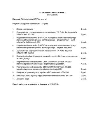 STEROWNIKI i REGULATORY 2 (ES1C620305) Kierunek: Elektrotechnika (APiTM), sem. VI Program szczegółowy laboratorium – 30 godz. 1. Zajęcia organizacyjne 2 godz. 2. Zapoznanie się z oprogramowaniem narzędziowym TIA Portal dla sterowników SIMATIC serii S7-1200 2 godz. Przystosowanie sterownika SIMATIC do rozwiązania zadania sekwencyjnego sterowania fragmentem procesu technologicznego – program liniowy – język schematów drabinkowych (LD) 4 godz. Przystosowanie sterownika SIMATIC do rozwiązania zadania sekwencyjnego sterowania fragmentem procesu technologicznego - program modułowy 4 godz. 5. Zapoznanie się z oprogramowaniem narzędziowym TIA Portal dla paneli SIMATIC HMI Komfort 2 godz. 6. Realizacja wizualizacji i sterownia na panelu operatorskim fragmentem procesu technologicznego 4 godz. 7. Programowanie i testy sterownika OPLC UNITRONICS Vision 260/290 sterowanie procesem sekwencyjno-ciągłym (aplikacja Ladder). 4 godz. 8. Programowanie i testy sterownika OPLC UNITRONICS Vision 260/290 wizualizacja procesu sekwencyjno-ciągłego (aplikacja HMI). 2 godz. Konfiguracja i parametryzacja regulatora PID w sterowniku S7-1200 2 godz. 10. Realizacja układu regulacji ciągłej z wykorzystaniem sterownika S7-1200 2 godz. 11. Zaliczenie zajęć. 2 godz. 3. 4. 9. Zasady zaliczenia przedmiotu są dostępne w USOSWeb. Materiały pomocnicze do laboratorium I. Literatura 1. Broel-Plater B.: Układy wykorzystujące sterowniki PLC: projektowanie algorytmów sterowania, Warszawa, Wydaw. Naukowe PWN, 2008. 2. Flaga S.: Programowanie sterowników PLC w języku drabinkowym, Legionowo, Wydawnictwo BTC, 2010. 3. Kacprzak S.: Programowanie sterowników PLC zgodne z normą IEC61131-3 w praktyce, Legionowo, Wydawnictwo BTC, 2011. 2. Kręglewska U., Ławryńczuk M., Marusak P.: Control Laboratory exercises, Oficyna Wydawnicza PW, Warszawa 2007. 3. Kwaśniewski J.: Sterowniki PLC w praktyce inżynierskiej, Wydawnictwo BTC, Legionowo 2008. 4. Mikulczyński T., Samsonowicz Z.: Automatyzacja dyskretnych procesów produkcyjnych, WNT, Warszawa 1997. 6. Wróbel Z., Sapota G.: Sterowniki programowalne: laboratorium, Uniwersytet Śląski, Katowice 2003. 7. Norma IEC 61131 Sterowniki programowalne. 8. Materiały organizacji PNO Polska – www.profibus.org.pl. II. SIMATIC S7 1. Dokumentacja techniczna firmy Siemens: www.automatyka.siemens.pl - Siemens S7 1200 Easy book v 04/2012, - SIMATIC S7 Programowalny sterownik S7-1200: Podręcznik systemu.”, v 04/2009, - S7-1200 oraz STEP7 Basic V10.5 Ćwiczenia”, 2009. - SIMATIC WinCC Advanced V11.0 SP2, v 12/2011 - S7-1200 Pierwsze kroki, v 08/2010 - Urządzenia HMI, Panele Comfort, v 01/2011. 2. PLC Universal Application Simulator (opisy masek): I Basic Set of Overlay Masks II Supplementary Set of Overlay Masks. III. Unitronics 260/290 1. Dokumentacja techniczna firmy Unitronics: www.elmark.com.pl Prowadzący Kierownik Zespołu Dydaktycznego dr inż. Andrzej Ruszewski dr inż. Lech Grodzki dr inż. Wojciech Trzasko