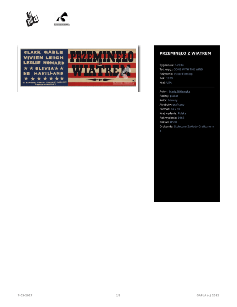 PRZEMINĘŁO Z WIATREM Sygnatura: P-2934 Tyt. oryg.: GONE WITH THE WIND Reżyseria: Victor Fleming Rok: 1939 Kraj: USA Autor: Maria Niklewska Rodzaj: plakat Kolor: barwny Atrybuty: graficzny Format: 34 x 97 Kraj wydania: Polska Rok wydania: 1963 Nakład: 8500 Drukarnia: Stołeczne Zakłady Graficzne nr 4 7-03-2017 1/1 GAPLA (c) 2012