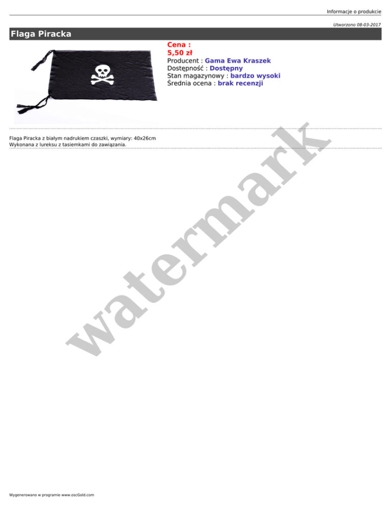 Informacje o produkcie Utworzono 08-03-2017 Flaga Piracka Cena : 5,50 zł Producent : Gama Ewa Kraszek Dostępność : Dostępny Stan magazynowy : bardzo wysoki Średnia ocena : brak recenzji w at er m ar k Flaga Piracka z białym nadrukiem czaszki, wymiary: 40x26cm Wykonana z lureksu z tasiemkami do zawiązania. Wygenerowano w programie www.oscGold.com