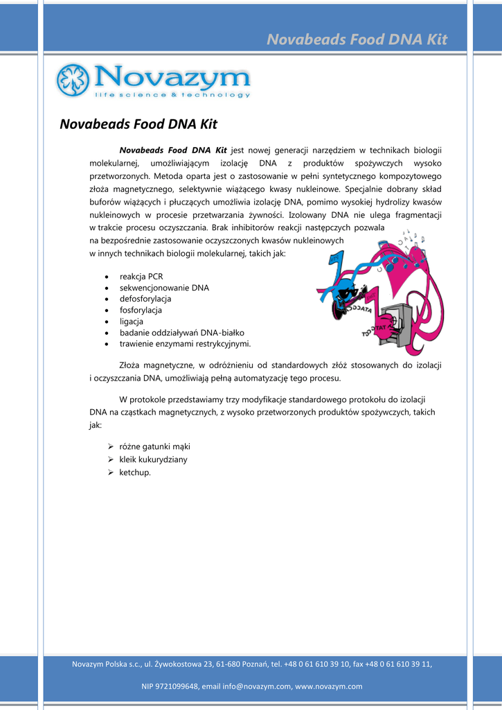 Novabeads Food DNA Kit Novabeads Food DNA Kit Novabeads Food DNA Kit jest nowej generacji narzędziem w technikach biologii molekularnej, umożliwiającym izolację DNA z produktów spożywczych wysoko przetworzonych. Metoda oparta jest o zastosowanie w pełni syntetycznego kompozytowego złoża magnetycznego, selektywnie wiążącego kwasy nukleinowe. Specjalnie dobrany skład buforów wiążących i płuczących umożliwia izolację DNA, pomimo wysokiej hydrolizy kwasów nukleinowych w procesie przetwarzania żywności. Izolowany DNA nie ulega fragmentacji w trakcie procesu oczyszczania. Brak inhibitorów reakcji następczych pozwala na bezpośrednie zastosowanie oczyszczonych kwasów nukleinowych w innych technikach biologii molekularnej, takich jak: reakcja PCR sekwencjonowanie DNA defosforylacja fosforylacja ligacja badanie oddziaływań DNA-białko trawienie enzymami restrykcyjnymi. Złoża magnetyczne, w odróżnieniu od standardowych złóż stosowanych do izolacji i oczyszczania DNA, umożliwiają pełną automatyzację tego procesu. W protokole przedstawiamy trzy modyfikacje standardowego protokołu do izolacji DNA na cząstkach magnetycznych, z wysoko przetworzonych produktów spożywczych, takich jak: różne gatunki mąki kleik kukurydziany ketchup. Novazym Polska s.c., ul. Żywokostowa 23, 61-680 Poznań, tel. +48 0 61 610 39 10, fax +48 0 61 610 39 11, NIP 9721099648, email [email protected], www.novazym.com Novabeads Food DNA Kit Protokół izolacji DNA z mąki Materiały wchodzące w skład zestawu: Cząstki magnetyczne – Magnetic Particles Bufor do lizy - Lysis Buffer Bufor do precypitacji – Precipitation Buffer Bufor wspomagający precypitację – LP Buffer Bufor do wiązania – Binding Buffer Bufor do płukania wstępnego – PreWash Buffer Bufor do płukania właściwego – Wash Buffer Bufor do elucji – TE Buffer RNaza A [10 mg/ml] Materiały dodatkowo wymagane: Etanol 80% statyw magnetyczny worteks Uwagi: Przed przystąpieniem do procedury dokładnie zworteksować cząstki magnetyczne i pozostawić probówkę w temp. pokojowej. Przed podaniem cząstek magnetycznych jeszcze raz dokładnie zworteksować zawartość probówki. Opis metody: 1. W probówce na 2 ml odważyć 100-200 mg mąki (*). Następnie dodać 800 µl Lysis Buffer oraz 10 µl RNazy A. Zworteksować próbę przez kilka sekund, a następnie inkubować w temp. 65 °C przez 10 min. 2. Po inkubacji zwirować próbę 10 min/12000 rpm. Do nowej probówki przenieść supernatant tak, aby nie naruszyć osadu. Dopełnić próbę do maksymalnej objętości probówki Precipitation Buffer. Zworteksować próbę, dodać 100 µl LP Buffer i wymieszać zawartość probówki przez kilkukrotne jej odwrócenie. Próbę inkubować 5 min w temp. -20 °C. 3. Zwirować próbę 10 min/12000 rpm. Supernatant usunąć poprzez energiczne odwrócenie probówki. 4. Do osadu dodać 250 µl Binding Buffer i dokładnie zworteksować, aż do rozpuszczenia się osadu. Do próby dodać 10 µl Magnetic Particles (cząstek magnetycznych). Dokładnie zworteksować zawartość probówki, następnie inkubować 10 min w temp. pokojowej. 5. Probówkę umieścić w statywie magnetycznym. Po zebraniu się cząstek magnetycznych odrzucić supernatant. Novazym Polska s.c., ul. Żywokostowa 23, 61-680 Poznań, tel. +48 0 61 610 39 10, fax +48 0 61 610 39 11, NIP 9721099648, email [email protected], www.novazym.com Novabeads Food DNA Kit Uwaga! Po podaniu każdego z buforów do przemywania (PreWash Buffer , Wash Buffer, 80% Etanol) zawartość probówki wymieszać przez delikatne odwracanie, do czasu całkowitego oderwania się cząstek magnetycznych od ścian probówki. Nie worteksować probówek! 6. Cząstki magnetyczne zawiesić w 1 ml PreWash Buffer. Zawartość i inkubować 3 min w temp. pokojowej. Probówkę umieścić w statywie magnetycznym, a po zebraniu się cząstek magnetycznych odrzucić supernatant. 7. Powtórzyć czynności z punktu 6 z zastosowaniem Wash Buffer. Nie inkubować. Probówkę umieścić w statywie magnetycznym, a po zebraniu się cząstek magnetycznych odrzucić supernatant. 8. Cząstki magnetyczne zawiesić w 1 ml świeżo przygotowanego 80% etanolu. Inkubować 1 min w temp. pokojowej. Probówkę umieścić w statywie magnetycznym. Po zebraniu się cząstek magnetycznych odrzucić supernatant. 9. W celu usunięcia pozostałości etanolu otworzyć probówki i odwrócić statyw do góry dnem. Pozostawić w tej pozycji na bibule przez ok. 5 min. 10. Cząstki magnetyczne zawiesić przez worteksowanie w 50 l TE Buffer. Mieszaninę inkubować w temp. 65 ˚C/ 5 min/ 800 rpm, a następnie przy otwartej probówce w temp. 65 ˚C / 5 min/ 800 rpm. 11. Po inkubacji probówki umieścić w statywie magnetycznym, a po zebraniu się cząstek magnetycznych przenieść supernatant zawierający DNA do nowej probówki. 12. Preparat zawierający wyizolowany DNA można stosować bezpośrednio do reakcji PCR. (*) Ilość mąki zależy przede wszystkim od stopnia jej przetworzenia. Novazym Polska s.c., ul. Żywokostowa 23, 61-680 Poznań, tel. +48 0 61 610 39 10, fax +48 0 61 610 39 11, NIP 9721099648, email [email protected], www.novazym.com Novabeads Food DNA Kit Protokół izolacji DNA z kleiku kukurydzianego Materiały wchodzące w skład zestawu: Cząstki magnetyczne – Magnetic Particles Bufor do lizy - Lysis Buffer Bufor do precypitacji – Precipitation Buffer Bufor do wiązania – Binding Buffer Bufor do płukania wstępnego – PreWash Buffer Bufor do płukania właściwego – Wash Buffer Bufor do elucji – TE Buffer RNaza A [10 mg/ml] Materiały dodatkowo wymagane: Etanol 80% statyw magnetyczny worteks Uwagi: Przed przystąpieniem do procedury dokładnie zworteksować cząstki magnetyczne i pozostawić probówkę w temp. pokojowej. Przed podaniem cząstek magnetycznych jeszcze raz dokładnie zworteksować zawartość probówki. Opis metody: 1. W probówce typu Eppendorf (1,5mL) odważyć 100 mg kleiku kukurydzianego. P