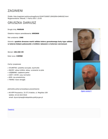 ZAGINIENI Źródło: http://zaginieni.policja.pl/zag/form/r31047316007,GRUSZKA-DARIUSZ.html Wygenerowano: Wtorek, 7 marca 2017, 23:55 GRUSZKA DARIUSZ Drugie imię: MARIAN Ostatnie miejsce zameldowania: WRONIN Rok urodzenia: 1968 Ubranie: spodnie dresowe marki adidas koloru granatowego buty typu adidas w kolorze białym pokoszulek z krótkim rękawem w kolorzez czerwonym Wzrost: 196-200 CM Kolor oczu: CIEMNE Cechy rysopisowe ● SYLWETKA: sylwetka szczupła, wysmukła ● WŁOSY: włosy krótkie, włosy: uczesanie na jeża ● UZĘBIENIE: uzębienie pełne ● USZY / UCHO: uszy normalne ● NOS: nos prostolinijny ● TWARZ: twarz okrągła Jednostka policji prowadząca poszukiwania ● KK KPP Proszowice, 31-571 Kraków, ul. Mogilska 109 telefon: (0-12) 615 5510 email: [email protected] Tweetnij Zgłoś osobę!!!