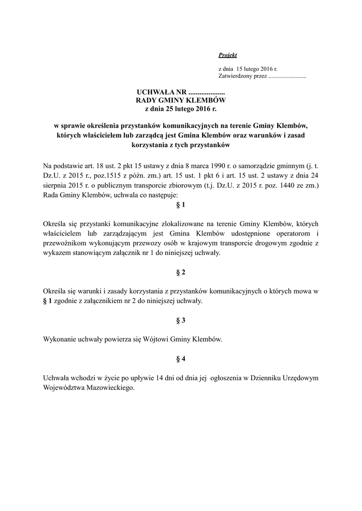 Projekt z dnia 15 lutego 2016 r. Zatwierdzony przez ......................... UCHWAŁA NR .................... RADY GMINY KLEMBÓW z dnia 25 lutego 2016 r. w sprawie określenia przystanków komunikacyjnych na terenie Gminy Klembów, których właścicielem lub zarządcą jest Gmina Klembów oraz warunków i zasad korzystania z tych przystanków Na podstawie art. 18 ust. 2 pkt 15 ustawy z dnia 8 marca 1990 r. o samorządzie gminnym (j. t. Dz.U. z 2015 r., poz.1515 z późn. zm.) art. 15 ust. 1 pkt 6 i art. 15 ust. 2 ustawy z dnia 24 sierpnia 2015 r. o publicznym transporcie zbiorowym (t.j. Dz.U. z 2015 r. poz. 1440 ze zm.) Rada Gminy Klembów, uchwala co następuje: §1 Określa się przystanki komunikacyjne zlokalizowane na terenie Gminy Klembów, których właścicielem lub zarządzającym jest Gmina Klembów udostępnione operatorom i przewoźnikom wykonującym przewozy osób w krajowym transporcie drogowym zgodnie z wykazem stanowiącym załącznik nr 1 do niniejszej uchwały. §2 Określa się warunki i zasady korzystania z przystanków komunikacyjnych o których mowa w § 1 zgodnie z załącznikiem nr 2 do niniejszej uchwały. §3 Wykonanie uchwały powierza się Wójtowi Gminy Klembów. §4 Uchwała wchodzi w życie po upływie 14 dni od dnia jej ogłoszenia w Dzienniku Urzędowym Województwa Mazowieckiego. UZASADNIENIE Przekłada się pod obrady Rady Gminy Klembów projekt uchwały w sprawie wykazu przystanków komunikacyjnych, zlokalizowanych w ciągu dróg gminnych, których właścicielem lub zarządcą jest Gmina Klembów oraz warunków i zasad korzystania z nich. Na podstawie art. 15 ust. 2 ustawy z dnia 24 sierpnia 2015 r. (t.j. Dz.U. z 2015 r. poz. 1440) o publicznym transporcie zbiorowym, określenie przystanków komunikacyjnych i dworców oraz warunków i zasad korzystania następuje w drodze uchwały podjętej przez właściwy organ danej jednostki samorządu terytorialnego. Uzasadnione jest zatem podjęcie przez Rade Gminy Klembów przedmiotowej uchwały. Wnioskodawcą uchwały był Wójt Gminy Klembów. Załącznik Nr 1 do Uchwały Nr XVI. … .2016 Rady Gminy Klembów z dnia 25 lutego 2016 r. Wykaz przystanków komunikacyjnych na drogach gminnych w Gminie Klembów L.p. Miejscowość Nr Najbliższej posesji / Skrzyżowanie Strona Drogi Kategoria Drogi 1 Krusze droga na Chruściele L Gminna 2 Krusze droga na Chruściele P Gminna 3 Pasek ul. Prymasa Tysiąclecia przy posesji nr 7 L Gminna 4 Pasek ul. Prymasa Tysiąclecia przy posesji nr 3 P Gminna 5 Krzywica przy posesji 48 L Gminna 6 Krzywica przy posesji 14 P Gminna 7 Krzywica przy posesji 10 L Gminna 8 Krusze przy skrzyżowaniu z droga wojewódzką L Gminna 9 Krusze przy skrzyżowaniu z droga wojewódzką P Gminna 10 11 Krusze Krusze przy posesji 20A przy posesji 22A P L Gminna Gminna 12 Krusze przy posesji 27 P Gminna 13 14 Krusze Krusze przy posesji 27 A przy posesji szkoły Podstawowej L P Gminna Gminna 15 Ostrówek ul. Kolejowa przy posesji 31 P Gminna 16 Ostrówek ul. Warszawska przy posesji Zespołu Szkół L Gminna 17 18 Roszczep Roszczep przy posesji 20 A przy posesji 18 P L Gminna Gminna 19 Roszczep przy posesji 3 L Gminna 20 Roszczep przy posesji 3 A P Gminna 21 Roszczep przy posesji Nr ewid. 295/3 P Wojewódzka 22 Roszczep przy posesji Nr ewid. 503/1 L Wojewódzka 23 Karolew przy posesji Nr ewid. 108 (przejazd PKP) P Wojewódzka 24 Karolew przy posesji Nr ewid. 286 L Wojewódzka 25 Klembów przy posesji 66 A L Powiatowa 26 Krusze przy posesji 125A P Powiatowa 27 Krusze przy posesji 124 L Powiatowa Załącznik Nr 2 do Uchwały Nr XVI. … .2016 Rady Gminy Klembów z dnia 25 lutego 2016 r. WARUNKI I ZASADY KORZYSTANIA Z PRZYSTANKÓW KOMUNIKACYJNYCH NA TERENIE POWIATU WOŁOMIŃSKIEGO §1 Warunki korzystania z przystanków: 1. Z przystanków komunikacyjnych zlokalizowanych na drogach gminnych Gminy Klembów mogą korzystać operatorzy i przewoźnicy wykonujący regularne przewozy osób w ramach wykonywania publicznego transportu zbiorowego. §2 Zasady korzystania z przystanków: 1. Korzystanie z przystanków może odbywać się wyłącznie w celu realizacji przewozów (wsiadanie i wysiadanie). 2. Operatorzy lub przewoźnicy korzystający z przystanku zobowiązani są do: a) każdorazowego powiadamiania zarządzającego przystankami o zamiarze zmiany rozkładu jazdy w szczególności w przypadkach dotyczących zmian godzin i dni kursowania oraz zmiany ilości przystanków w ramach posiadanego uzgodnienia, b) wprowadzenie powyższych zmian w rozkładzie jazdy uzależnione jest od uzyskania na nie zgody, wydanej przez Gminę Klembów. 3. Operatorzy i przewoźnicy wykonujący przewozy osób w krajowym transporcie drogowym zobowiązani są do: a) zatrzymywania pojazdu na początku zatoki przystankowej, a w przypadku jej braku w taki sposób, aby nie ograniczać przepustowości i nie blokować przystanku dla innych użytkowników, b) podjeżdżania jak najbliżej krawężnika celem umożliwienia wsiadania osobom starszym i niepełnosprawnym, 4. Zabrania się postoju autobusu na przystanku ponad czas potrzebny do obsługi pasażerów. 5. Wykonywanie manewru zawracania i parkowania może odbywać się jedynie w miejscach wyznaczonych. 6. Operator i przewoźnik korzystający z przystanku zobowiązuje się do korzystania z przystanków komunikacyjnych w sposób umożliwiający innym operatorom i przewoźnikom korzystanie z nich na równych prawach. 7. Zabrania się umieszczania na przystankach komunikacyjnych innych informacji niż te, które dotyczą rozkładu jazdy w szczególności reklam w rozumieniu art. 4 ust. 23 ustawy z dnia 21 marca 1985r. r. roku o drogach Publicznych (Dz. U. z 2007 roku nr 19 , póz. 115 z późn. zm.). 8. Operatorzy i przewoźnicy posiadający właściwą zgodę na korzystanie z przystanków komunikacyjnych będących z zarządzie Gminy Klembów, mają obowiązek podać do publicznej wiadomości rozkład jazdy poprzez zamieszczenie stosownej informacji na przystankach komunikacyjnych. 9. Ko