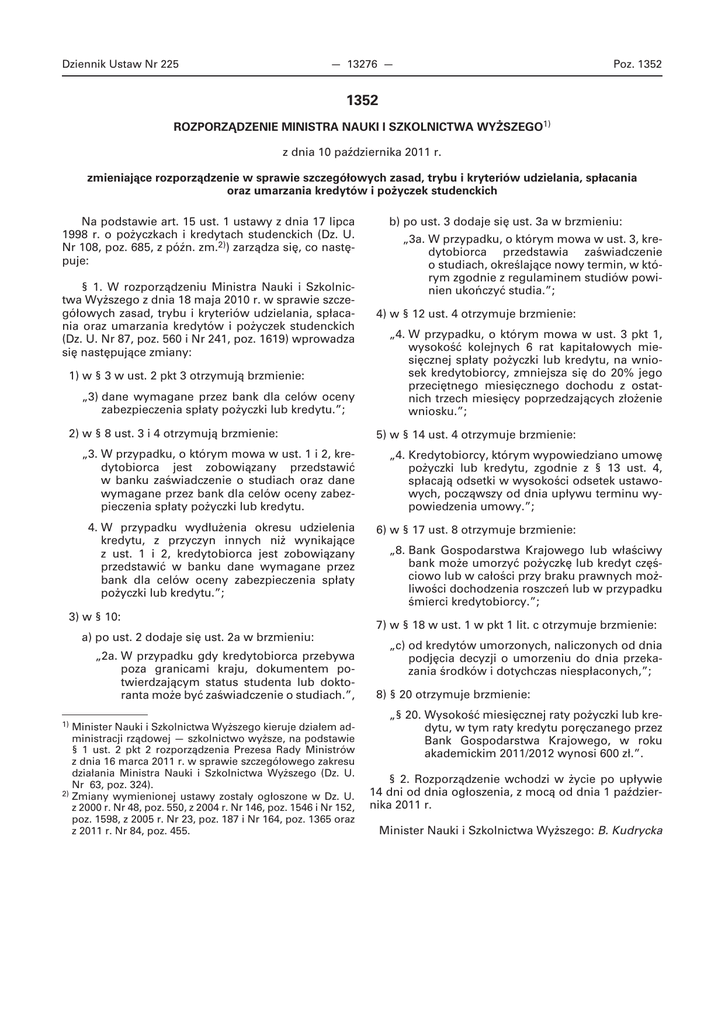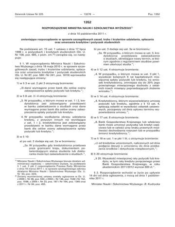 Dziennik Ustaw Nr 225 — 13276 — Poz. 1352 1352 ROZPORZĄDZENIE MINISTRA NAUKI I SZKOLNICTWA WYŻSZEGO1) z dnia 10 października 2011 r. zmieniające rozporządzenie w sprawie szczegółowych zasad, trybu i kryteriów udzielania, spłacania oraz umarzania kredytów i pożyczek studenckich Na podstawie art. 15 ust. 1 ustawy z dnia 17 lipca 1998 r. o pożyczkach i kredytach studenckich (Dz. U. Nr 108, poz. 685, z późn. zm.2)) zarządza się, co następuje: § 1. W rozporządzeniu Ministra Nauki i Szkolnictwa Wyższego z dnia 18 maja 2010 r. w sprawie szczegółowych zasad, trybu i kryteriów udzielania, spłacania oraz umarzania kredytów i pożyczek studenckich (Dz. U. Nr 87, poz. 560 i Nr 241, poz. 1619) wprowadza się następujące zmiany: 1) w § 3 w ust. 2 pkt 3 otrzymują brzmienie: „3) dane wymagane przez bank dla celów oceny zabezpieczenia spłaty pożyczki lub kredytu.”; 2) w § 8 ust. 3 i 4 otrzymują brzmienie: „3. W przypadku, o którym mowa w ust. 1 i 2, kredytobiorca jest zobowiązany przedstawić w banku zaświadczenie o studiach oraz dane wymagane przez bank dla celów oceny zabezpieczenia spłaty pożyczki lub kredytu. 4. W przypadku wydłużenia okresu udzielenia kredytu, z przyczyn innych niż wynikające z ust. 1 i 2, kredytobiorca jest zobowiązany przedstawić w banku dane wymagane przez bank dla celów oceny zabezpieczenia spłaty pożyczki lub kredytu.”; 3) w § 10: a) po ust. 2 dodaje się ust. 2a w brzmieniu: „2a. W przypadku gdy kredytobiorca przebywa poza granicami kraju, dokumentem potwierdzającym status studenta lub doktoranta może być zaświadczenie o studiach.”, 1) Minister Nauki i Szkolnictwa Wyższego kieruje działem administracji rządowej — szkolnictwo wyższe, na podstawie § 1 ust. 2 pkt 2 rozporządzenia Prezesa Rady Ministrów z dnia 16 marca 2011 r. w sprawie szczegółowego zakresu działania Ministra Nauki i Szkolnictwa Wyższego (Dz. U. Nr 63, poz. 324). 2) Zmiany wymienionej ustawy zostały ogłoszone w Dz. U. z 2000 r. Nr 48, poz. 550, z 2004 r. Nr 146, poz. 1546 i Nr 152, poz. 1598, z 2005 r. Nr 23, poz. 187 i Nr 164, poz. 1365 oraz z 2011 r. Nr 84, poz. 455. b) po ust. 3 dodaje się ust. 3a w brzmieniu: „3a. W przypadku, o którym mowa w ust. 3, kredytobiorca przedstawia zaświadczenie o studiach, określające nowy termin, w którym zgodnie z regulaminem studiów powinien ukończyć studia.”; 4) w § 12 ust. 4 otrzymuje brzmienie: „4. W przypadku, o którym mowa w ust. 3 pkt 1, wysokość kolejnych 6 rat kapitałowych miesięcznej spłaty pożyczki lub kredytu, na wniosek kredytobiorcy, zmniejsza się do 20% jego przeciętnego miesięcznego dochodu z ostatnich trzech miesięcy poprzedzających złożenie wniosku.”; 5) w § 14 ust. 4 otrzymuje brzmienie: „4. Kredytobiorcy, którym wypowiedziano umowę pożyczki lub kredytu, zgodnie z § 13 ust. 4, spłacają odsetki w wysokości odsetek ustawowych, począwszy od dnia upływu terminu wypowiedzenia umowy.”; 6) w § 17 ust. 8 otrzymuje brzmienie: „8. Bank Gospodarstwa Krajowego lub właściwy bank może umorzyć pożyczkę lub kredyt częściowo lub w całości przy braku prawnych możliwości dochodzenia roszczeń lub w przypadku śmierci kredytobiorcy.”; 7) w § 18 w ust. 1 w pkt 1 lit. c otrzymuje brzmienie: „c) od kredytów umorzonych, naliczonych od dnia podjęcia decyzji o umorzeniu do dnia przekazania środków i dotychczas niespłaconych,”; 8) § 20 otrzymuje brzmienie: „§ 20. Wysokość miesięcznej raty pożyczki lub kredytu, w tym raty kredytu poręczanego przez Bank Gospodarstwa Krajowego, w roku akademickim 2011/2012 wynosi 600 zł.”. § 2. Rozporządzenie wchodzi w życie po upływie 14 dni od dnia ogłoszenia, z mocą od dnia 1 października 2011 r. Minister Nauki i Szkolnictwa Wyższego: B. Kudrycka