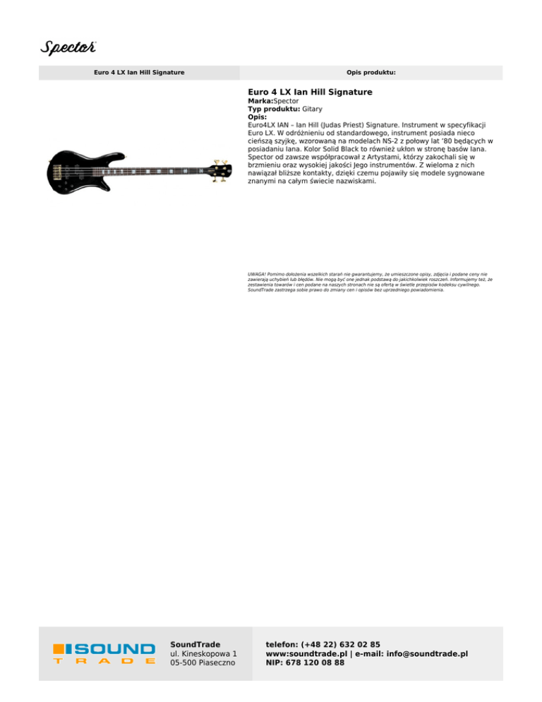 Euro 4 LX Ian Hill Signature Opis produktu: Euro 4 LX Ian Hill Signature Marka:Spector Typ produktu: Gitary Opis: Euro4LX IAN – Ian Hill (Judas Priest) Signature. Instrument w specyfikacji Euro LX. W odróżnieniu od standardowego, instrument posiada nieco cieńszą szyjkę, wzorowaną na modelach NS-2 z połowy lat ’80 będących w posiadaniu Iana. Kolor Solid Black to również ukłon w stronę basów Iana. Spector od zawsze współpracował z Artystami, którzy zakochali się w brzmieniu oraz wysokiej jakości Jego instrumentów. Z wieloma z nich nawiązał bliższe kontakty, dzięki czemu pojawiły się modele sygnowane znanymi na całym świecie nazwiskami. UWAGA! Pomimo dołożenia wszelkich starań nie gwarantujemy, że umieszczone opisy, zdjęcia i podane ceny nie zawierają uchybień lub błędów. Nie mogą być one jednak podstawą do jakichkolwiek roszczeń. Informujemy też, że zestawienia towarów i cen podane na naszych stronach nie są ofertą w świetle przepisów kodeksu cywilnego. SoundTrade zastrzega sobie prawo do zmiany cen i opisów bez uprzedniego powiadomienia. SoundTrade ul. Kineskopowa 1 05-500 Piaseczno telefon: (+48 22) 632 02 85 www:soundtrade.pl | e-mail: [email protected] NIP: 678 120 08 88