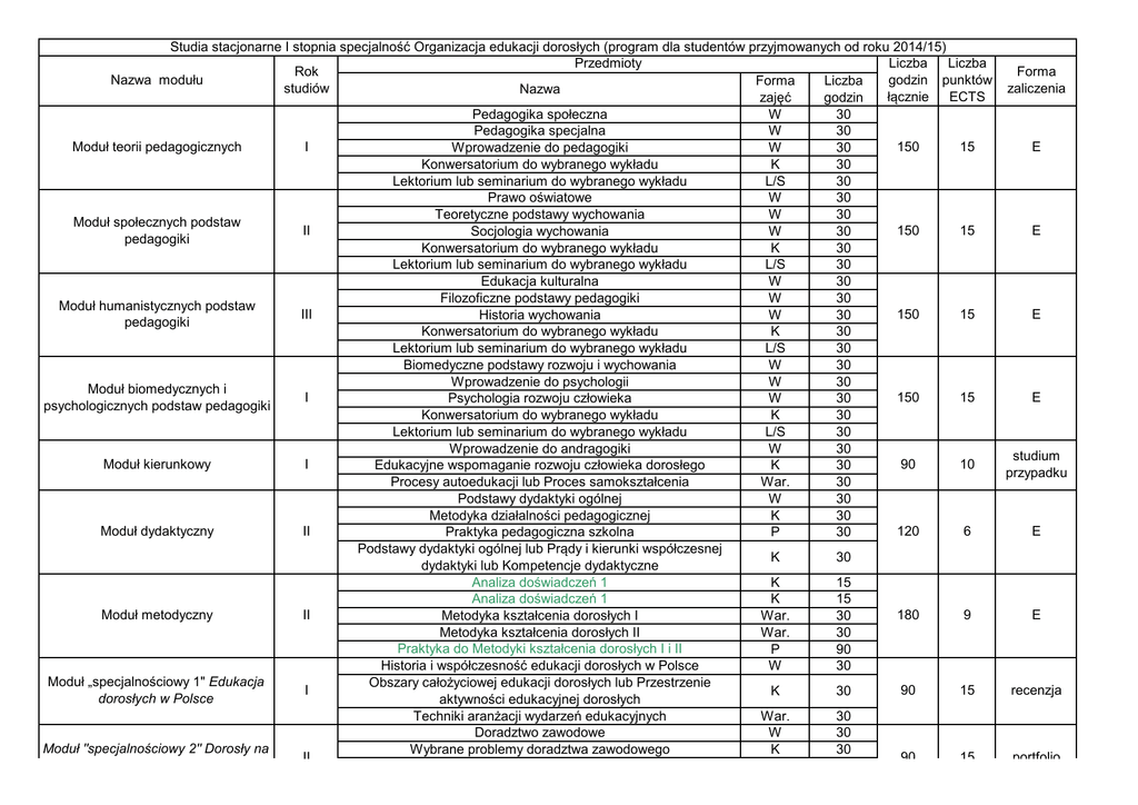 Studia stacjonarne I stopnia specjalność Organizacja edukacji dorosłych (program dla studentów przyjmowanych od roku 2014/15) Przedmioty Liczba Liczba Rok Forma Nazwa modułu godzin punktów Forma Liczba studiów zaliczenia Nazwa ECTS łącznie zajęć godzin Pedagogika społeczna W 30 Pedagogika specjalna W 30 Moduł teorii pedagogicznych I 150 15 E Wprowadzenie do pedagogiki W 30 Konwersatorium do wybranego wykładu K 30 Lektorium lub seminarium do wybranego wykładu L/S 30 Prawo oświatowe W 30 Teoretyczne podstawy wychowania W 30 Moduł społecznych podstaw II 150 15 E Socjologia wychowania W 30 pedagogiki Konwersatorium do wybranego wykładu K 30 Lektorium lub seminarium do wybranego wykładu L/S 30 Edukacja kulturalna W 30 Filozoficzne podstawy pedagogiki W 30 Moduł humanistycznych podstaw III 150 15 E Historia wychowania W 30 pedagogiki Konwersatorium do wybranego wykładu K 30 Lektorium lub seminarium do wybranego wykładu L/S 30 Biomedyczne podstawy rozwoju i wychowania W 30 Wprowadzenie do psychologii W 30 Moduł biomedycznych i I 150 15 E Psychologia rozwoju człowieka W 30 psychologicznych podstaw pedagogiki Konwersatorium do wybranego wykładu K 30 Lektorium lub seminarium do wybranego wykładu L/S 30 Wprowadzenie do andragogiki W 30 studium Moduł kierunkowy I 90 10 Edukacyjne wspomaganie rozwoju człowieka dorosłego K 30 przypadku Procesy autoedukacji lub Proces samokształcenia War. 30 Podstawy dydaktyki ogólnej W 30 Metodyka działalności pedagogicznej K 30 Moduł dydaktyczny II 120 6 E Praktyka pedagogiczna szkolna P 30 Podstawy dydaktyki ogólnej lub Prądy i kierunki współczesnej K 30 dydaktyki lub Kompetencje dydaktyczne Analiza doświadczeń 1 K 15 Analiza doświadczeń 1 K 15 Moduł metodyczny II 180 9 E Metodyka kształcenia dorosłych I War. 30 Metodyka kształcenia dorosłych II War. 30 Praktyka do Metodyki kształcenia dorosłych I i II P 90 Historia i współczesność edukacji dorosłych w Polsce W 30 Moduł „specjalnościowy 1" Edukacja Obszary całożyciowej edukacji dorosłych lub Przestrzenie I 90 15 recenzja K 30 dorosłych w Polsce aktywności edukacyjnej dorosłych Techniki aranżacji wydarzeń edukacyjnych War. 30 Doradztwo zawodowe W 30 Moduł "specjalnościowy 2" Dorosły na Wybrane problemy doradztwa zawodowego K 30 II 90 15 portfolio rynku pracy rynku pracy II Moduł "specjalnościowy 3" E-edukacja dorosłych II Moduł "specjalnościowy 4" Organizacja procesów uczenia się dorosłych III Seminarium dyplomowe Ochrona własności intelektualnej BHP Wychowanie fizyczne Technologia informacyjna Zajęcia ogólnouniwersyteckie Język obcy – egzamin II-III I I I i II I I-III II zajęcia nieobowiązkowe: translatorium (4 ECTS), lektorat, fakultety w tym wykłady monograficzne Razem punkty I-III Człowiek w środowisku pracy lub Dorosły wobec wyzwań edukacji zawodowej Współczesne technologie w edukacji dorosłych Koncepcje uczenia się przez całe życie Innowacyjne techniki szkoleniowe lub Alternatywne formy zajęć edukacyjnych z dorosłymi Specyfika uczenia się dorosłych lub Koncepcje uczenia się dorosłych Logistyka procesów edukacyjnych Marketing w edukacji dorosłych Tematyka do wyboru zgodna ze specjalnością Tematyka do wyboru 90 15 portfolio 90 15 projekt S 30 W K 30 30 S 30 W 30 K War. S 30 30 90 4 90 15 projekt zajęć 90 4 120 30 120 30 16 0,5 0,5 2 2 9 2 ZAL ZAL ZAL ZO ZO E Tematyka do wyboru Tematyka do wyboru Tematyka do wyboru 1594 3 180 Studia stacjonarne I stopnia specjalność Organizacja edukacji dorosłych (program dla studentów przyjętych w 2012/13 i 2013/14) Przedmioty Liczba Liczba Rok Nazwa modułu godzin punktów Forma Liczba studiów Nazwa ECTS łącznie zajęć godzin Pedagogika społeczna W 30 Pedagogika specjalna W 30 Moduł teorii pedagogicznych I 150 15 Wprowadzenie do pedagogiki W 30 Konwersatorium do wybranego wykładu K 30 Lektorium lub seminarium do wybranego wykładu L/S 30 Prawo oświatowe W 30 Teoretyczne podstawy wychowania W 30 Moduł społecznych podstaw II 150 15 Socjologia wychowania W 30 pedagogiki Konwersatorium do wybranego wykładu K 30 Lektorium lub seminarium do wybranego wykładu L/S 30 Edukacja kulturalna W 30 Filozoficzne podstawy pedagogiki W 30 Moduł humanistycznych podstaw III 150 15 Historia wychowania W 30 pedagogiki ZO Forma zaliczenia E E E pedagogiki Moduł biomedycznych i psychologicznych podstaw pedagogiki I Moduł kierunkowy od roku akad. 2014/15 egzamin na II roku st.: Moduł 10 ECTS,seminarium dyplomowe na III r. 12 ECTS (2015/16) I-III Moduł dydaktyczny II Moduł metodyczny II Moduł „specjalnościowy 1" Edukacja dorosłych w Polsce I Moduł "specjalnościowy 2" Dorosły na rynku pracy II Moduł "specjalnościowy 3" E-edukacja dorosłych I Moduł "specjalnościowy 4" Organizacja procesów uczenia się dorosłych III Ochrona własności intelektualnej BHP Wychowanie fizyczne Technologia informacyjna I I I i II I Konwersatorium do wybranego wykładu Lektorium lub seminarium do wybranego wykładu Biomedyczne podstawy rozwoju i wychowania Psychologia społeczna (od 2013/14 Wprowadzenie do psychologii) K L/S W 30 30 30 W 30 Psychologia rozwoju człowieka Konwersatorium do wybranego wykładu Lektorium lub seminarium do wybranego wykładu Wprowadzenie do andragogiki Koncepcje edukacji ustawicznej Edukacyjne wspomaganie rozwoju człowieka dorosłego Seminarium dyplomowe Procesy autoedukacji lub Proces samokształcenia Podstawy dydaktyki ogólnej Metodyka działalności pedagogicznej Praktyka pedagogiczna szkolna Podstawy dydaktyki ogólnej lub Prądy i kierunki współczesnej dydaktyki lub Kompetencje dydaktyczne Analiza doświadczeń 1 Analiza doświadczeń 1 Metodyka kształcenia dorosłych I Metodyka kształcenia dorosłych II Praktyka do Metodyki kształcenia dorosłych I i II Historia i współczesność edukacji dorosłych w Polsce Obszary całożyciowej edukacji dorosłych lub Przestrzenie aktywności edukacyjnej dorosłych Praktyki - wizyty studyjne Doradztwo z