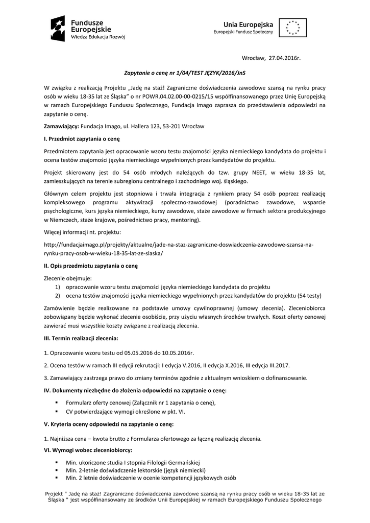 Wrocław, 27.04.2016r. Zapytanie o cenę nr 1/04/TEST JĘZYK/2016/JnS W związku z realizacją Projektu „Jadę na staż! Zagraniczne doświadczenia zawodowe szansą na rynku pracy osób w wieku 18-35 lat ze Śląska” o nr POWR.04.02.00-00-0215/15 współfinansowanego przez Unię Europejską w ramach Europejskiego Funduszu Społecznego, Fundacja Imago zaprasza do przedstawienia odpowiedzi na zapytanie o cenę. Zamawiający: Fundacja Imago, ul. Hallera 123, 53-201 Wrocław I. Przedmiot zapytania o cenę Przedmiotem zapytania jest opracowanie wzoru testu znajomości języka niemieckiego kandydata do projektu i ocena testów znajomości języka niemieckiego wypełnionych przez kandydatów do projektu. Projekt skierowany jest do 54 osób młodych należących do tzw. grupy NEET, w wieku 18-35 lat, zamieszkujących na terenie subregionu centralnego i zachodniego woj. śląskiego. Głównym celem projektu jest stopniowa i trwała integracja z rynkiem pracy 54 osób poprzez realizację kompleksowego programu aktywizacji społeczno-zawodowej (poradnictwo zawodowe, wsparcie psychologiczne, kurs języka niemieckiego, kursy zawodowe, staże zawodowe w firmach sektora produkcyjnego w Niemczech, staże krajowe, pośrednictwo pracy, mentoring). Więcej informacji nt. projektu: http://fundacjaimago.pl/projekty/aktualne/jade-na-staz-zagraniczne-doswiadczenia-zawodowe-szansa-narynku-pracy-osob-w-wieku-18-35-lat-ze-slaska/ II. Opis przedmiotu zapytania o cenę Zlecenie obejmuje: 1) opracowanie wzoru testu znajomości języka niemieckiego kandydata do projektu 2) ocena testów znajomości języka niemieckiego wypełnionych przez kandydatów do projektu (54 testy) Zamówienie będzie realizowane na podstawie umowy cywilnoprawnej (umowy zlecenia). Zleceniobiorca zobowiązany będzie wykonać zlecenie osobiście, przy użyciu własnych środków trwałych. Koszt oferty cenowej zawierać musi wszystkie koszty związane z realizacją zlecenia. III. Termin realizacji zlecenia: 1. Opracowanie wzoru testu od 05.05.2016 do 10.05.2016r. 2. Ocena testów w ramach III edycji rekrutacji: I edycja V.2016, II edycja X.2016, III edycja III.2017. 3. Zamawiający zastrzega prawo do zmiany terminów zgodnie z aktualnym wnioskiem o dofinansowanie. IV. Dokumenty niezbędne do złożenia odpowiedzi na zapytanie o cenę: Formularz oferty cenowej (Załącznik nr 1 zapytania o cenę), CV potwierdzające wymogi określone w pkt. VI. V. Kryteria oceny odpowiedzi na zapytanie o cenę: 1. Najniższa cena – kwota brutto z Formularza ofertowego za łączną realizację zlecenia. VI. Wymogi wobec zleceniobiorcy: Min. ukończone studia I stopnia Filologii Germańskiej Min. 2-letnie doświadczenie lektorskie (język niemiecki) Min. 2 letnie doświadczenie w ocenie kompetencji językowych osób Projekt " Jadę na staż! Zagraniczne doświadczenia zawodowe szansą na rynku pracy osób w wieku 18-35 lat ze Śląska " jest współfinansowany ze środków Unii Europejskiej w ramach Europejskiego Funduszu Społecznego VII. Termin składania odpowiedzi na zapytanie o cenę: Do dnia 04.05.2016 roku, drogą pocztową / osobiście pod adres Fundacja Imago, ul. Hallera 123, 53-201 Wrocław z dopiskiem „Zapytanie o cenę nr 1/04/TEST JĘZYK/2016/JnS " lub elektronicznie na adres: [email protected] VIII. Zawarcie umowy: 1. Zamawiający zastrzega sobie prawo do odstąpienia od zawarcia umowy bez podania przyczyny. Projekt " Jadę na staż! Zagraniczne doświadczenia zawodowe szansą na rynku pracy osób w wieku 18-35 lat ze Śląska " jest współfinansowany ze środków Unii Europejskiej w ramach Europejskiego Funduszu Społecznego