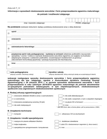 Załącznik T_14 Informacja o sposobach dostosowania warunków i form przeprowadzania egzaminu maturalnego do potrzeb i możliwości zdającego imię i nazwisko zdającego PESEL zdającego Na podstawie (wskazać dokument, będący podstawą dostosowania wraz z datą złożenia): opinii ……………………………………………………………………………………………………………………… ……………………………………………………………………………………………………………………………… orzeczenia ………………………………………………………………………………………………………………… ……………………………………………………………………………………………………………………………… zaświadczenia lekarskiego …………………………………………………………………………………………… ……………………………………………………………………………………………………………………………… pozytywnej opinii rady pedagogicznej – wydanej na wniosek (właściwe podkreślić) nauczyciela / specjalisty / ucznia / rodzica w sprawie dostosowania warunków egzaminu ze względu na trudności adaptacyjne związane z (właściwe podkreślić): wcześniejszym kształceniem za granicą / zaburzeniami komunikacji językowej / sytuacją kryzysową lub traumatyczną. inne: …………………………………….………………………………………………………………………………… ……………………………………………………………………………………………………………………………… rada pedagogiczna dyrektor szkoły (dotyczy uczniów i słuchaczy szkoły) (dotyczy absolwentów, którzy ukończyli szkołę we wcześniejszych latach) wskazuje następujące sposoby dostosowania warunków i form przeprowadzania egzaminu maturalnego dla ww. zdającego, zgodne z Komunikatem dyrektora Centralnej Komisji Egzaminacyjnej z 29 sierpnia 2014 r. w sprawie sposobów dostosowania warunków i form przeprowadzania w roku szkolnym 2014/2015 egzaminu maturalnego do potrzeb absolwentów ze specjalnymi potrzebami edukacyjnymi, w tym niepełnosprawnych, niedostosowanych społecznie oraz zagrożonych niedostosowaniem społecznym A. Rodzaj arkuszy egzaminacyjnych 1. drukowane alfabetem Braille’a (wraz z czarnodrukiem) 5. dla osób słabosłyszących 2. w czarnodruku 6. dla osób z autyzmem, w tym z zespołem Aspergera 3. drukowane powiększoną czcionką (16 pkt) 7. na płycie CD w formacie*……………………… 4. dla osób niesłyszących 8. inne: …………………………………………………… * albo MS Word, albo w formie plików .pdf (w porozumieniu z OKE) B. Urządzenia techniczne 1. komputer 2. odtwarzacz CD ze słuchawkami C. Urządzenia i środki specjalistyczne 1. maszyna do pisania alfabetem Braille’a 4. dodatkowe oświetlenie 2. linijka brajlowska 5. płyta CD z dostosowanym nagraniem (j. obce nowoż.) 3. specjalistyczne oprogramowanie komputerowe 6. inne ……………………………………….…………… D. Obecność specjalisty 1. surdopedagoga 4. pedagoga resocjalizacji/socjoterapeuty 2. tłumacza języka migowego 5. inny: …………………………………………………… 3. tyflopedagoga E. Dostosowanie kryteriów oceniania ze względu na 1. dysleksję rozwojową 4. trudności adaptacyjne związane z wcześniejszym kształceniem za granicą 2. autyzm (w tym zespół Aspergera) 5. zaburzenia komunikacji językowej 3. afazję F. Pozostałe dostosowania 1. nauczyciel wspomagający w czytaniu w pisaniu 2. przystąpienie do egzaminu w osobnej sali 3. przedłużenie czasu przeprowadzania egzaminu ustnego z języka 4. przedłużenie czasu trwania egzaminu pisemnego o polskiego obcego o 15 minut minut 5. dostosowanie miejsca pracy do dysfunkcji zdającego (jakie? …………………………………………………) 6. inne: …………………………………………………………………………………………………………………… Dodatkowo rada pedagogiczna dyrektor szkoły wnioskuje o ustalenie następujących warunków egzaminu nieujętych w Komunikacie dyrektora Centralnej Komisji Egzaminacyjnej (w porozumieniu z dyrektorem komisji okręgowej): ....................................................................................................................................................................................... ....................................................................................................................................................................................... ze względu na ............................................................................................................................................................... ....................................................................................................................................................................................... Wypełnić po otrzymaniu pisma z OKE Na podstawie uzgodnień z dyrektorem OKE (pismo nr, data) ........………………………........................................ ustala się następujące warunki nieujęte w komunikacie dyrektora CKE: ....................................................................................................................................................................................... ....................................................................................................................................................................................... .............................................. miejscowość ......................... data ............................................................................................. podpis