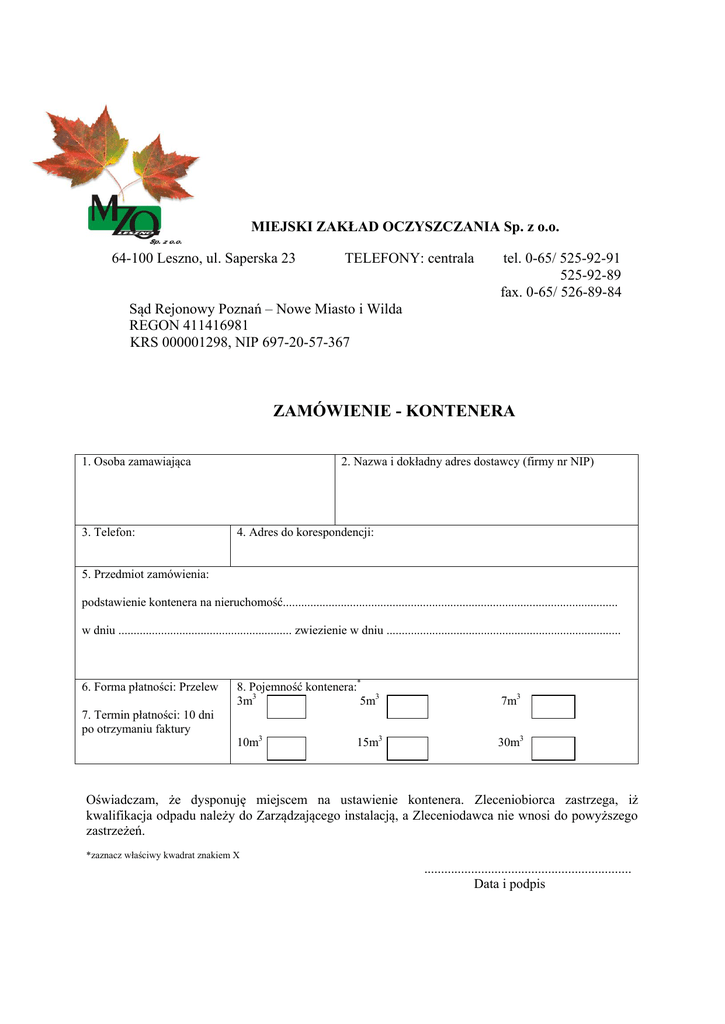 MIEJSKI ZAKŁAD OCZYSZCZANIA Sp. z o.o. 64-100 Leszno, ul. Saperska 23 TELEFONY: centrala tel. 0-65/ 525-92-91 525-92-89 fax. 0-65/ 526-89-84 Sąd Rejonowy Poznań – Nowe Miasto i Wilda REGON 411416981 KRS 000001298, NIP 697-20-57-367 ZAMÓWIENIE - KONTENERA 1. Osoba zamawiająca 3. Telefon: 2. Nazwa i dokładny adres dostawcy (firmy nr NIP) 4. Adres do korespondencji: 5. Przedmiot zamówienia: podstawienie kontenera na nieruchomość.............................................................................................................. w dniu ......................................................... zwiezienie w dniu ............................................................................. 6. Forma płatności: Przelew 8. Pojemność kontenera:* 3m3 5m3 7m3 10m3 30m3 7. Termin płatności: 10 dni po otrzymaniu faktury 15m3 Oświadczam, że dysponuję miejscem na ustawienie kontenera. Zleceniobiorca zastrzega, iż kwalifikacja odpadu należy do Zarządzającego instalacją, a Zleceniodawca nie wnosi do powyższego zastrzeżeń. *zaznacz właściwy kwadrat znakiem X .............................................................. Data i podpis