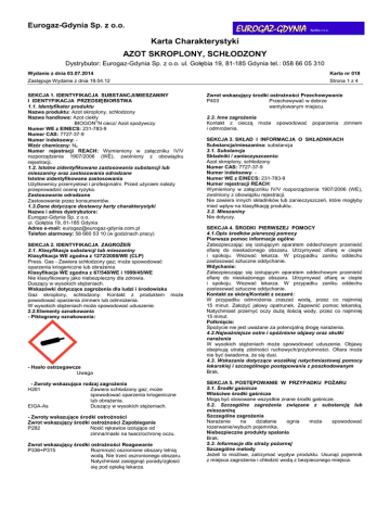 Eurogaz-Gdynia Sp. z o.o. Karta Charakterystyki AZOT SKROPLONY, SCHŁODZONY Dystrybutor: Eurogaz-Gdynia Sp. z o.o. ul. Gołębia 19, 81-185 Gdynia tel.: 058 66 05 310 Wydanie z dnia 03.07.2014 Karta nr 018 Zastępuje Wydanie z dnia 19.04.12 Strona 1 z 4 SEKCJA 1. IDENTYFIKACJA SUBSTANCJI/MIESZANINY I IDENTYFIKACJA PRZEDSIĘBIORSTWA 1.1. Identyfikator produktu Nazwa produktu: Azot skroplony, schłodzony Nazwa handlowa: Azot ciekły BIOGONN ciecz/ Azot spożywczy Numer WE z EINECS: 231-783-9 Numer CAS: 7727-37-9 Numer indeksowy: Wzór chemiczny: N2 Numer rejestracji REACH: Wymieniony w załączniku IV/V rozporządzenia 1907/2006 (WE), zwolniony z obowiązku rejestracji. 1.2. Istotne zidentyfikowane zastosowania substancji lub mieszaniny oraz zastosowania odradzane Istotne zidentyfikowane zastosowania Użytkownicy przemysłowi i profesjonalni. Przed użyciem należy przeprowadzić ocenę ryzyka. Zastosowanie odradzane Zastosowanie przez konsumentów. 1.3.Dane dotyczące dostawcy karty charakterystyki Nazwa i adres dystrybutora: Eurogaz-Gdynia Sp. z o.o. ul. Gołębia 19, 81-185 Gdynia Adres e-mail: [email protected] Telefon alarmowy: 58 660 53 10 (w godzinach pracy) SEKCJA 2. IDENTYFIKACJA ZAGROŻEŃ 2.1. Klasyfikacja substancji lub mieszaniny Klasyfikacja WE zgodna z 1272/2008/WE (CLP) Press. Gas - Zawiera schłodzony gaz; może spowodować oparzenia kriogeniczne lub obrażenia. Klasyfikacja WE zgodna z 67/548/WE i 1999/45/WE Nie klasyfikowany jako niebezpieczny dla zdrowia. Duszący w wysokich stężeniach. Wskazówki dotyczące zagrożenia dla ludzi i środowiska Gaz skroplony, schłodzony. Kontakt z produktem może powodować oparzenia zimnem lub odmrożenia. W wysokich stężeniach może spowodować uduszenie. 2.2.Elementy oznakowania - Piktogramy oznakowania: - Hasło ostrzegawcze Uwaga - Zwroty wskazujące rodzaj zagrożenia H281 Zawiera schłodzony gaz; może spowodować oparzenia kriogeniczne lub obrażenia. EIGA-As Duszący w wysokich stężeniach. - Zwroty wskazujące środki ostrożności Zwrot wskazujący środki ostrożności Zapobieganie P282 Nosić rękawice izolujące od zimna/maski na twarz/ochronę oczu. Zwrot wskazujący środki ostrożności Reagowanie P336+P315 Rozmrozić oszronione obszary letnią wodą. Nie trzeć oszronionego obszaru. Natychmiast zasięgnąć porady/zgłosić się pod opiekę lekarza. Zwrot wskazujący środki ostrożności Przechowywanie P403 Przechowywać w dobrze wentylowanym miejscu. 2.3. Inne zagrożenia Kontakt z cieczą może i odmrożenia. spowodować poparzenia zimnem SEKCJA 3. SKŁAD I INFORMACJA O SKŁADNIKACH Substancja/mieszanina: substancja 3.1. Substancja Składniki / zanieczyszczenia: Azot skroplony, schłodzony Numer CAS: 7727-37-9 Numer indeksowy: Numer WE z EINECS: 231-783-9 Numer rejestracji REACH: Wymieniony w załączniku IV/V rozporządzenia 1907/2006 (WE), zwolniony z obowiązku rejestracji. Nie zawiera innych składników lub zanieczyszczeń, które mogłyby mieć wpływ na klasyfikację produktu. 3.2. Mieszaniny Nie dotyczy. SEKCJA 4. ŚRODKI PIERWSZEJ POMOCY 4.1.Opis środków pierwszej pomocy Pierwsza pomoc informacje ogólne Zabezpieczając się izolującym aparatem oddechowym przenieść ofiarę do nieskażonego obszaru. Utrzymywać ofiarę w cieple i spokoju. Wezwać lekarza. W przypadku zaniku oddechu zastosować sztuczne oddychanie. Wdychanie: Zabezpieczając się izolującym aparatem oddechowym przenieść ofiarę do nieskażonego obszaru. Utrzymywać ofiarę w cieple i spokoju. Wezwać lekarza. W przypadku zaniku oddechu zastosować sztuczne oddychanie. Kontakt ze skórą/Kontakt z oczami: W przypadku odmrożenia zraszać wodą, przez co najmniej 15 minut. Założyć jałowy opatrunek. Zapewnić pomoc lekarską. Natychmiast przemyć oczy dużą ilością wody, przez co najmniej 15 minut. Połknięcie: Spożycie nie jest uważane za potencjalną drogę narażenia. 4.2.Najważniejsze ostre i opóźnione objawy oraz skutki narażenia W wysokich stężeniach może spowodować uduszenie. Objawy obejmują utratę zdolności ruchowych/przytomności. Ofiara może nie być świadoma, że się dusi. 4.3. Wskazania dotyczące wszelkiej natychmiastowej pomocy lekarskiej i szczególnego postępowania z poszkodowanym Brak. SEKCJA 5. POSTĘPOWANIE W PRZYPADKU POŻARU 5.1. Środki gaśnicze Właściwe środki gaśnicze Mogą być stosowane wszystkie znane środki gaśnicze. 5.2. Szczególne zagrożenia związane z substancją lub mieszaniną Szczególne zagrożenia Narażenie na działanie ognia może spowodować rozerwanie/wybuch pojemnika. Niebezpieczne produkty spalania Brak. 5.3. Informacje dla straży pożarnej Szczególne metody Jeżeli to możliwe, zatrzymać wypływ produktu. Usunąć pojemnik z miejsca zagrożenia i chłodzić wodą z bezpiecznego miejsca. Eurogaz-Gdynia Sp. z o.o. Karta Charakterystyki AZOT SKROPLONY, SCHŁODZONY Dystrybutor: Eurogaz-Gdynia Sp. z o.o. ul. Gołębia 19, 81-185 Gdynia tel.: 058 66 05 310 Wydanie z dnia 03.07.2014 Karta nr 018 Zastępuje Wydanie z dnia 19.04.12 Strona 2 z 4 Środki ochrony indywidualnej dla strażaków Gazoszczelna odzież ochronna przed chemikaliami (typ 1) w połączeniu z izolującym aparatem oddechowym. SEKCJA 6. POSTĘPOWANIE W PRZYPADKU NIEZAMIERZONEGO UWOLNIENIA DO ŚRODOWISKA 6.1. Indywidualne środki ostrożności, wyposażenie ochronne i procedury w sytuacjach awaryjnych Ewakuować obszar. Stosować odzież ochronną. Przy wchodzeniu w obszar stosować izolujący aparat oddechowy chyba, że stwierdzono, iż atmosfera jest bezpieczna. Zapewnić odpowiednią wentylację powietrza. Zapobiegać przedostawaniu się do kanalizacji, piwnic, zagłębień terenu oraz innych miejsc, gdzie gromadzenie się produktu może być niebezpieczne. EN 137 Sprzęt ochrony układu oddechowego - Aparaty powietrzne butlowe ze sprężonym powietrzem wyposażone w maskę - Wymagania, badanie, znakowanie.. 6.2. Środki ostrożności w zakresie ochrony środowiska Zapobiegać przedostawaniu