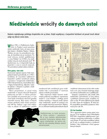 Ochrona przyrody Niedźwiedzie wróciły do dawnych ostoi Badania największego polskiego drapieżnika nie są łatwe. Dzięki współpracy z karpackimi leśnikami od ponad trzech dekad udaje się zbierać cenne dane. W lipcu 1982 r. w Nadleśnictwie Andrychów (w Porąbce) został zastrzelony młody niedźwiedź, który od maja wyrządzał szkody w Beskidzie Śląskim i Małym. Wysłano nas tam, by przeanalizować sytuację, ale dotarliśmy już po incydencie. Powstał wówczas artykuł opublikowany w „Lesie Polskim” (nr 2/1983) „Czy niedźwiedzie wrócą do swych dawnych ostoi?”. Spodziewano się, że drapieżniki będą się pojawiały w coraz to nowych miejscach. Nie prowadzono jednak żadnej ewidencji. Kto pyta, ten wie Konieczność napisania raportu i brak wiarygodnych danych spowodowała, że w 1982 r. wysłaliśmy do wszystkich nadleśnictw karpackich i parków narodowych ankietę z pytaniem o występowanie niedźwiedzia. Odzew był spontaniczny, otrzymaliśmy dane z bogatą korespondencją, zdjęciami i opisami zdarzeń, z relacjami ze spotkań z niedźwiedziami w terenie. Warto przypomnieć, że przed wojną niedźwiedzi w naszych obecnych Karpatach praktycznie nie było i w okresie powojennym zasiedlały one ponownie góry, a w tym czasie każde stwierdzenie obecności gatunku stanowiło sensację. Były rejony, w których ostatnie spotkania miały miejsce przed ponad 100 laty. Ankiety z tego czasu wskazywały, że jedynie 12 nadleśnictw i parków narodowych było zasiedlonych przez niedźwiedzie stale, w pozostałych 17 notowano jedynie osobniki przechodnie. Brak znajomości śladów bytności niedźwiedzia próbował zweryfikować wspomniany artykuł w „Lesie Polskim” i niedługo potem wydana instrukcja, w których zostały opisane tropy niedźwiedzi, sposób ich pomiaru oraz inne szczegóły obserwacji terenowych. Wpłynęło to na zbieranie bardziej jednorodnych danych i możliwość wykorzystania ich do celów naukowych, m.in. przy tworzeniu krajowego programu ochrony niedźwiedzia oraz w publikacjach. Sympatia i popularność, jaką zyskały sobie niedźwiedzie, spowodowała, że naszą ankietę, z podobnym zestawem pytań, zaczęliśmy wysyłać co roku. W wielu nadleśnictwach znalazły się osoby chętne do współpracy. W dużej liczbie przypadków gromadziły pojedyncze informacje przez cały rok. 35 lat badań Nadleśnictwa co krok otrzymują różne ankiety i zapytania. By w tym natłoku dokumentów wyróżnić formularze ankiety dotyczącej niedźwiedzi, jej twórcy dodali do niej sylwetkę obiektu swoich zainteresowań. 22 Tak w ogromnym skrócie można opisać trwającą już 35 lat współpracę Stacji Dolnośląskiej IOP PAN z karpackimi nadleśnictwami i prowadzony monitoring niedźwiedzia w polskiej części Karpat. W tym roku rozesłaliśmy ankietę już 35 razy, co najlepiej świadczy o życzliwości leśników i daje wyobrażenie o ilości zgromadzonych danych. Las Polski 9/2016 Dane ankietowe dobrze przedstawiają aspekty obecności niedźwiedzi w terenie, np. zmiany zasiedlonego obszaru czy rejony występowania samic z młodymi. Od samego początku ujawniły się dwie główne ostoje: Bieszczady i Tatry. W Bieszczadach w 1982 r. osobniki osiadłe zasiedlały południową i wschodnią część pasma (tereny nadleśnictw: Cisna, Lutowiska, Wetlina, Komańcza, Brzegi Dolne oraz Bieszczadzkiego Parku Narodowego), natomiast w strefie Pogórza (nadleśnictwa: Baligród, Lesko, Krasiczyn i Bircza) notowane były sporadycznie jako osobniki przechodnie. Kolejne ankiety wskazują na sukcesywne zasiedlanie tych terenów, najpierw są tam notowane osobniki osiadłe, potem obserwowane są niedźwiedzice z młodymi, a w końcu przypadki gawrowania. Podobne informacje na podstawie ankiet można udokumentować z innych pasm górskich. Obecnie niedźwiedź zasiedla praktycznie cały obszar naszych Karpat, a niemal każdego roku zdarzają się dalekie wędrówki na Pogórze Karpackie, w Sudety i w inne rejony. Wieloletnie dane ankietowe pozwalają też na dokonywanie innych podsumowań, jeżeli na mapę naniesie się wszystkie informacje o gawrach, udaje się wyznaczyć rejony najczęstszego zimowania zwierząt, a podobna analiza w odniesieniu do samic z młodymi pozwala na określenie najcenniejszych części ostoi. Liczebność niedźwiedzi w Bieszczadach zmieniała się. W oparciu o całoroczne obserwacje szacowano ją początkowo na 50, a ostatnio na ponad 100 osobników. W tym samym okresie w Bieszczadach każdego roku obserwowano ok. 16 samic prowadzących łącznie 27 młodych (średnio 1,69). Oczywiście nasze zainteresowania niedźwiedziami nie ograniczały się tylko do zbierania danych ankietowych – wyjeżdżaliśmy w teren i odwiedzaliśmy przy różnych okazjach chyba wszystkie karpackie nadleśnictwa. Temat niedźwiedzi zawsze budził zainteresowanie i sympatię, a na miejscu wielokrotnie korzystaliśmy z różnych form bezinteresownej pomocy. Nawiązaliśmy wiele kontaktów i znajomości trwających do dziś. Niestety wśród wielu osób życzliwych trzeba wspomnieć również tych, którzy odeszli, m.in. Jana Szafrańskiego czy Tadeusza Zająca. Niepewna przyszłość Przyszłość niedźwiedzia w Polsce nie jest jednak w pełni zabezpieczona. Wprawdzie podlega on ochronie gatunkowej i cieszy się sympatią ludzi, a wypłata odszkodowań rekompensuje ponoszone straty, ale nadal pozostają problemy z zabezpieczeniem niezbędnej mu przestrzeni oraz przeciwdziałaniem synantropizacji. Ten ostatni problem spowodował, że w Tatrach realizowany jest od lat specjalny program ochrony niedźwiedzia, ale istnieje realne zagrożenie w innych rejonach Karpat. Ważne jest, aby problemy współwystępowania i ewentualnych konfliktów człowieka z niedźwiedziem były szybko i skutecznie likwidowane i to w taki sposób, aby nie powodować istotnych ograniczeń potrzeb życiowych niedźwiedzi. Drapieżniki, choć ostrożne, jednak nie są płochliwe i 