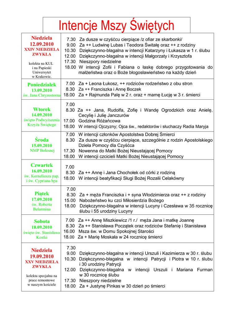Intencje Mszy Świętych Niedziela 12.09.2010 XXIV NIEDZIELA ZWYKŁA kolekta na KUL i na Papieski Uniwersytet w Krakowie. 7.30 9.00 10.30 12.00 17.30 18.00 Za dusze w czyśćcu cierpiące /z ofiar ze skarbonki/ Za ++ Ludwinę Lubas i Teodora Świtałę oraz ++ z rodziny Dziękczynno-błagalna w intencji Katarzyny i Łukasza w 1 r. ślubu Dziękczynno-błagalna w intencji Małgorzaty i Krzysztofa Nieszpory niedzielne W intencji Zofii i Fabiana o łaskę dobrego przygotowania do małżeństwa oraz o Boże błogosławieństwo na każdy dzień 7.00 Za + Leona Łukosz, ++ rodziców rodzeństwo z obu stron 8.30 Za ++ Franciszka i Annę Boczek 13.09.2010 św. Jana Chryzostoma 18.00 Za + Rajmunda Palę w 2 r. oraz + mamę Łucję w 3 r. śmierci Poniedziałek 7.00 8.30 Za ++ Jana, Rudolfa, Zofię i Wandę Ogrodzkich oraz Anielę, 14.09.2010 Cecylię i Julię Janczurów święto Podwyższenia 17.00 Godzina Różańcowa Krzyża Świętego 18.00 W intencji Ojczyzny; Ojca św., redaktorów i słuchaczy Radia Maryja Wtorek Środa 15.09.2010 NMP Bolesnej 7.00 W intencji członków Apostolstwa Dobrej Śmierci 8.30 Za dusze w czyśćcu cierpiące, szczególnie z rodzin Apostolskiego Dzieła Pomocy dla Czyśćca 17.30 Nowenna do Matki Bożej Nieustającej Pomocy 18.00 W intencji czcicieli Matki Bożej Nieustającej Pomocy Czwartek 7.00 8.30 Za ++ Annę i Jana Chochołek od córki z rodziną św. Korneliusza pap. 18.00 W intencji beatyfikacji Sługi Bożej Rozalii Celakówny 16.09.2010 i św. Cypriana bpa Piątek 17.09.2010 św. Roberta Belarmina 7.00 8.30 Za + męża Franciszka i + syna Włodzimierza oraz ++ z rodziny 15.00 Nabożeństwo ku czci Miłosierdzia Bożego 18.00 Dziękczynno-błagalna w intencji Lucyny i Czesława w 35 rocznicę ślubu i 55 urodziny Lucyny 7.00 8.30 18.09.2010 16.00 święto św. Stanisława 18.00 Kostki Sobota \ Niedziela 19.09.2010 XXV NIEDZIELA ZWYKŁA kolekta specjalna na prace remontowe w naszym kościele Za ++ Annę Miszkiewicz /1 r./ męża Jana i matkę Joannę Za ++ Stanisława Początek oraz rodziców Stefanię i Stanisława Msza św. w Domu Spokojnej Starości Za + Marię Moskała w 24 rocznicę śmierci 7.30 9.00 Dziękczynno-błagalna w intencji Urszuli i Kazimierza w 30 r. ślubu 10.30 Dziękczynno-błagalna w intencji Patrycji i Piotra w 10 r. ślubu i 30 urodziny Patrycji 12.00 Dziękczynno-błagalna w intencji Urszuli i Mariana Furman w 30 rocznicę ślubu 17.30 Nieszpory niedzielne 18.00 Za + Justynę Pinkas w 30 dzień po śmierci