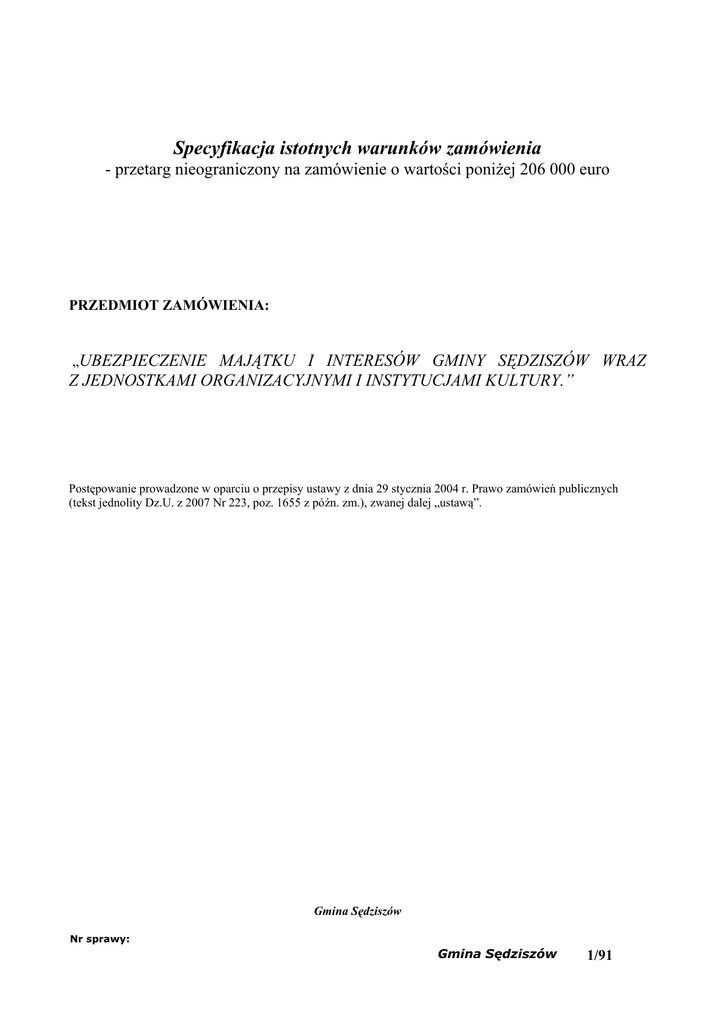 Specyfikacja istotnych warunków zamówienia - przetarg nieograniczony na zamówienie o wartości poniżej 206 000 euro PRZEDMIOT ZAMÓWIENIA: „UBEZPIECZENIE MAJĄTKU I INTERESÓW GMINY SĘDZISZÓW WRAZ Z JEDNOSTKAMI ORGANIZACYJNYMI I INSTYTUCJAMI KULTURY.” Postępowanie prowadzone w oparciu o przepisy ustawy z dnia 29 stycznia 2004 r. Prawo zamówień publicznych (tekst jednolity Dz.U. z 2007 Nr 223, poz. 1655 z późn. zm.), zwanej dalej „ustawą”. Gmina Sędziszów Nr sprawy: Gmina Sędziszów 1/91 DZIAŁ A. Informacje, o których mowa w art. 36 ust. 1 ustawy Prawo zamówień publicznych oraz opis części zamówienia I. Nazwa i adres zamawiającego Nazwa zamawiającego: Gmina Sędziszów Ulica: Dworcowa 20 Kod: 28-340 Miejscowość: Sędziszów fax: (041) 381 11 31 Strona: www.sedziszow.pl Rodzaj zamawiającego – administracja samorządowa Zamawiający, działając na podstawie art. 15, ust.2 ustawy Prawo zamówień publicznych, powierzył przygotowanie i przeprowadzenia postępowania o udzielenie niniejszego zamówienia w zakresie zgodnym z ustawą brokerowi ubezpieczeniowemu, Inter Broker Sp. z o.o. z siedzibą w Toruniu, działającej jako pełnomocnik zamawiającego. Adres pełnomocnika: ulica: Żeglarska 31 kod: 87-100 Toruń; miejscowość: Toruń Telefon: (056) 6584 260 Fax: (056) 6584 261 Dni i godziny pracy pełnomocnika: poniedziałek – piątek: 08:00 – 16:00 II. Tryb udzielenia zamówienia 1. Postępowanie o udzielenie zamówienia publicznego prowadzone jest w trybie przetargu nieograniczonego. 2.Podstawa prawna udzielenia zamówienia publicznego: art. 10 ust. 1 oraz art. 39-46 ustawy Prawo zamówień publicznych (tekst jednolity Dz.U. z 2007 Nr 223, poz. 1655 z późn. zm.). 3.Podstawa prawna opracowania specyfikacji istotnych warunków zamówienia: 3.1.Ustawa z dnia 29 stycznia 2004 r. Prawo zamówień publicznych (tekst jednolity Dz.U. z 2007 r., Nr 223, poz. 1655 z późn. zm.). 3.2.Rozporządzenie Prezesa Rady Ministrów z dnia 19 maja 2006 r. w sprawie rodzajów dokumentów, jakich może żądać zamawiający od wykonawcy oraz form, w jakich dokumenty te mogą być składane (Dz. U. z 2006 r., Nr 87, poz. 605 oraz z 2008r., Nr 188, poz.1155) III. Opis przedmiotu zamówienia 1. Część I: Przedmiotem zamówienia w części I jest ubezpieczenie majątku i odpowiedzialności cywilnej Gminy Sędziszów wraz z jednostkami organizacyjnymi i instytucjami kultury. Zakres zamówienia obejmuje: • ubezpieczenie mienia od ognia i innych zdarzeń losowych • ubezpieczenie mienia od kradzieży z włamaniem i rabunku • ubezpieczenie sprzętu elektronicznego • ubezpieczenie przedmiotów szklanych od stłuczenia • ubezpieczenie odpowiedzialności cywilnej • ubezpieczenia komunikacyjnych (AC, OC, NNW, Assistance) 2. Część II Nr sprawy: Gmina Sędziszów 2/91 Przedmiotem zamówienia w części II jest ubezpieczenie członków Ochotniczej Straży Pożarnej i Młodzieżowych Drużyn Pożarniczych Gminy Sędziszów. Zakres zamówienia obejmuje ubezpieczenie następstw nieszczęśliwych wypadków. 3. Zamawiający nie dopuszcza powierzenia podwykonawcom wykonania zamówienia. 4. Szczegółowy opis przedmiotu zamówienia zawierają załączniki do niniejszej specyfikacji: Załącznik nr 1 „Szczegółowy opis przedmiotu zamówienia, zawierający warunki wymagane oraz klauzule dodatkowe i inne postanowienia szczególne preferowane dla poszczególnych rodzajów ubezpieczeń”, Załącznik nr 1a „Szczegółowy opis przedmiotu zamówienia zawierający warunki wymagane dla ubezpieczenia NNW członków OSP i MDP” Załącznik nr 5 „Warunki wymagane – definicje pojęć i wymagana treść klauzul dodatkowych” Załącznik nr 6 „Klauzule dodatkowe i inne postanowienia szczególne preferowane”, Załącznik nr 8 „Wykaz pojazdów”, Załącznik nr 9 „Wykaz zabezpieczeń przeciwkradzieżowych i przeciwpożarowych w jednostkach” Załącznik Nr 10 – „Szkodowość” 4. Oznaczenie wg Wspólnego Słownika Zamówień (CPV): 66515100-4 (usługi ubezpieczenia od ognia), 66515400-7 (usługi ubezpieczenia od skutków żywiołów), 66515000-3 (usługi ubezpieczenia od uszkodzenia lub utraty), 66516400-4 (usługi ubezpieczenia od ogólnej odpowiedzialności cywilnej), 66516000-0 (usługi ubezpieczenia od odpowiedzialności cywilnej), 66516100-1 (usługi ubezpieczenia pojazdów mechanicznych od odpowiedzialności cywilnej), 66514110-0 (usługi ubezpieczeń pojazdów mechanicznych), 66512100-3 (usługi ubezpieczenia od następstw nieszczęśliwych wypadków). Wymienione usługi należą do kategorii usług CPC nr 6. IV. Termin wykonania zamówienia 1. Termin wykonania zamówienia: 36 miesięcy począwszy od dnia 01.01.2010 r., z możliwością: a) odstąpienia od umowy w trybie art. 145 ustawy z dnia 29 stycznia 2004 r. Prawo zamówień publicznych w terminie 30 dni od powzięcia wiadomości o zaistnieniu istotnej zmiany okoliczności powodującej, że wykonanie umowy nie leży w interesie publicznym, czego nie można było przewidzieć w chwili zawarcia umowy, b) rozwiązania umowy z uzasadnionych przyczyn przez każdą ze stron za wypowiedzeniem złożonym w formie pisemnej najpóźniej na 2 miesiące przed końcem każdego rocznego okresu ubezpieczenia; wypowiedzenie złożone w powyższym terminie wywołuje skutek na koniec danego roku ubezpieczenia. 2. Polisy ubezpieczeniowe będą wystawiane na okres roczny, zgodnie z terminem wykonania zamówienia, z wyjątkiem: • polis w pierwszym rocznym okresie dotyczących ubezpieczeń jeszcze aktualnych • polis dotyczących umów ubezpieczeń komunikacyjnych AUTO CASCO i NNW kierowcy i pasażerów pojazdów włączanych w trakcie wykonania niniejszego zamówienia, które będą zawierane od dnia zgłoszenia do ubezpieczenia do końca każdego rocznego okresu wykonywania zamówienia, tj. do dnia 31.12.2010 r., 31.12.2011 r. i 31.12.2012 r. (wyrównanie okresu ubezpieczenia), • obowiązkowego ubezpieczenia OC posia
