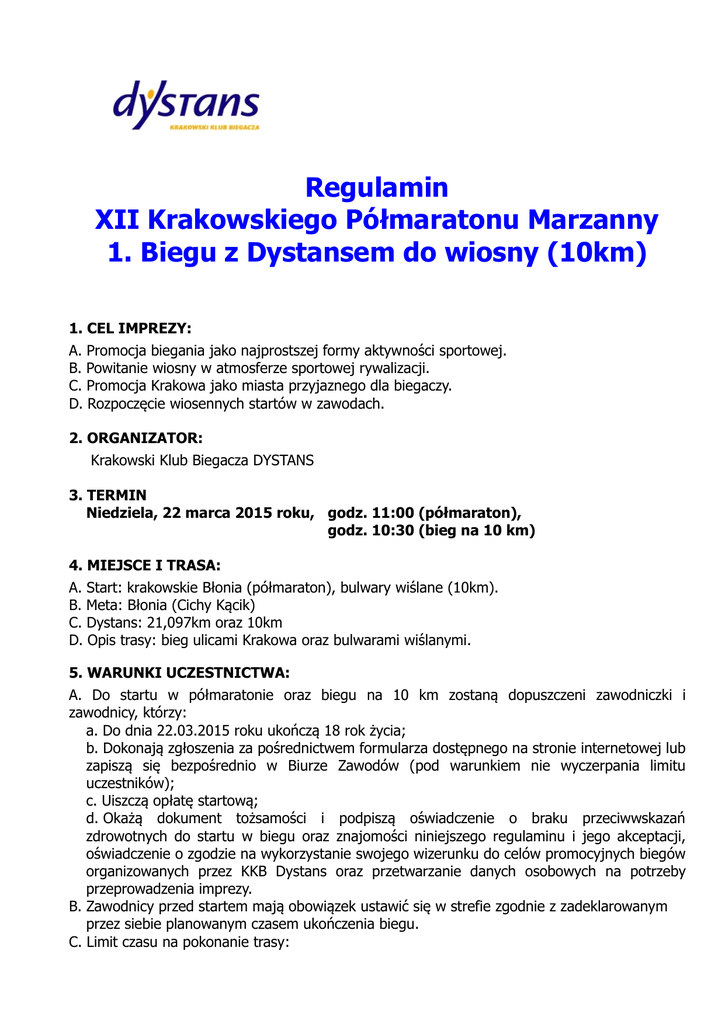 Regulamin XII Krakowskiego Półmaratonu Marzanny 1. Biegu z Dystansem do wiosny (10km) 1. CEL IMPREZY: A. Promocja biegania jako najprostszej formy aktywności sportowej. B. Powitanie wiosny w atmosferze sportowej rywalizacji. C. Promocja Krakowa jako miasta przyjaznego dla biegaczy. D. Rozpoczęcie wiosennych startów w zawodach. 2. ORGANIZATOR: Krakowski Klub Biegacza DYSTANS 3. TERMIN Niedziela, 22 marca 2015 roku, godz. 11:00 (półmaraton), godz. 10:30 (bieg na 10 km) 4. MIEJSCE I TRASA: A. Start: krakowskie Błonia (półmaraton), bulwary wiślane (10km). B. Meta: Błonia (Cichy Kącik) C. Dystans: 21,097km oraz 10km D. Opis trasy: bieg ulicami Krakowa oraz bulwarami wiślanymi. 5. WARUNKI UCZESTNICTWA: A. Do startu w półmaratonie oraz biegu na 10 km zostaną dopuszczeni zawodniczki i zawodnicy, którzy: a. Do dnia 22.03.2015 roku ukończą 18 rok życia; b. Dokonają zgłoszenia za pośrednictwem formularza dostępnego na stronie internetowej lub zapiszą się bezpośrednio w Biurze Zawodów (pod warunkiem nie wyczerpania limitu uczestników); c. Uiszczą opłatę startową; d. Okażą dokument tożsamości i podpiszą oświadczenie o braku przeciwwskazań zdrowotnych do startu w biegu oraz znajomości niniejszego regulaminu i jego akceptacji, oświadczenie o zgodzie na wykorzystanie swojego wizerunku do celów promocyjnych biegów organizowanych przez KKB Dystans oraz przetwarzanie danych osobowych na potrzeby przeprowadzenia imprezy. B. Zawodnicy przed startem mają obowiązek ustawić się w strefie zgodnie z zadeklarowanym przez siebie planowanym czasem ukończenia biegu. C. Limit czasu na pokonanie trasy: półmaratonu 3 godziny 15 minut, biegu na 10 km 1 godzina 30 minut. D. Biegacze, którzy nie dobiegną do linii mety w podanych powyżej czasach są zobowiązani do przerwania biegu. Osoby znajdujące się na trasie po zakończeniu biegu mają obowiązek stosowania się do przepisów ruchu drogowego. Powyższe zastrzeżenia odnoszą się także do zawodników, którzy na 16km trasy znajdą się po upływie 2 godzin i 40 minut. E. Organizator ustala limit startujących zawodników na 5000. F. Pomiar czasu: elektroniczny za pomocą chipów. G. Pomiar czasu netto. Dla 50 pierwszych zawodników pomiar czasu brutto. 6. PROGRAM ZAWODÓW: Sobota 21 III 2015 godz. 12:00 - otwarcie Biura Zawodów, godz. 21:00 - zamknięcie Biura Zawodów. Niedziela 22 III 2015 godz. 7:00 - otwarcie Biura Zawodów, godz. 9:45 - zakończenie przyjmowania zgłoszeń (10km), godz.10:15 - zakończenie przyjmowania zgłoszeń (półmaraton), godz.10:40 - symboliczne pożegnanie zimy – topienie Marzanny, godz.11:00 - start półmaratonu, godz.14:30 - oficjalne zakończenie zawodów. 7. BIURO ZAWODÓW I ZAPLECZE BIEGU: A. Biuro zawodów oraz zaplecze biegu (przebieralnie dla mężczyzn oraz kobiet, depozyt odzieży, natryski i toalety) znajdować się będą w okolicy mety – dokładna lokalizacja zostanie określona w późniejszym terminie. B. Biuro Zawodów czynne: w dniu 21.03.2015 r. w godzinach 12.00-21.00, w dniu 22.03.2015 r. w godzinach 7.00-9.45 (10km) i 10.15 (półmaraton). C. Depozyt odzieży czynny w godz. 8:30-14:30 (worki na odzież będą do pobrania przy depozycie). Organizator nie odpowiada za rzeczy wartościowe zdeponowane w przechowalni. D. Organizator zapewnia podręczny depozyt w okolicy startu biegu na 10km; który zostanie dostarczony do depozytu głównego (w okolicy mety). 8. ZGŁOSZENIA I OPŁATA STARTOWA: A. Zgłoszenia: - elektroniczne: przez formularz zgłoszeniowy na stronie internetowej biegu do dnia 15 marca 2015 roku; - w Biurze Zawodów w dniach 21-22 marca 2015r. B. Opłata startowa wynosi odpowiednio: Forma wpłaty przelewem Termin do dnia 2.11.2014 do dnia 31.12.2014 do dnia 1.03.2015 do dnia 15.03.2015 21km 45zł 60zł 75zł 90zł 10km 30zł 35zł 45zł 55zł gotówką w Biurze Zawodów (pod warunkiem niewyczerpania limitu w dniach 22-23.03.2015 110zł 65zł 5000 uczestników) Uwaga! Posiadaczom Karty Biegacza Festiwalu Biegów oraz karty prenumeratora Magazynu „Bieganie” przysługuje zniżka w wysokości 10%. Uwaga! Zniżki nie sumują się! Warunkiem uzyskania zniżki jest okazanie w biurze zawodów (przy odbiorze) pakietu startowego odpowiedniej karty. C. Opłatę startowa należy wpłacać na konto: KKB Dystans, ul. Zaczarowane Koło 5/8, 30-085 Kraków, Alior Bank nr konta: 68 2490 0005 0000 4500 7689 4352 Tytuł przelewu: Półmaraton Marzanny 2015, imię i nazwisko, miejscowość oraz data urodzenia zawodnika. D. Opłata raz wniesiona nie podlega zwrotowi. 9. ŚWIADCZENIA ORGANIZATORA: A. Każdy zawodnik otrzyma pakiet startowy, okolicznościową koszulkę techniczną, a po zakończeniu biegu pamiątkowy medal. B. Organizator zapewnia napoje na trasie biegu. UWAGA! Organizator nie przewiduje umieszczania na punktach z wodą własnych odżywek zawodników. C. Na trasie oraz na mecie biegów organizator zapewnia opiekę medyczną. D. Po zakończeniu biegu, zawodnicy na podstawie numeru startowego otrzymają ciepły posiłek. E. Po zakończeniu biegu, każdy zawodnik będzie miał możliwość skorzystania z szatni oraz natrysków. F. Organizator zapewnia bezpłatny transport uczestników z biura zawodów na linię startu biegu na 10km. G. Organizator zapewnia udział pacemakerów, którzy pomogą uczestnikom uzyskać czasy netto zgodnie z wybraną strefą czasową: 1:29, 1:39, 1:49, 1:59, 2:09 oraz 2:19. H. 10. KLASYFIKACJE: A. generalna kobiet i mężczyzn B. kategorie wiekowe kobiet i mężczyzn: Kobiety: K-18: 18-29 lat K-30: 30-39 lat K-40: 40-49 lat K-50: 50-59 lat K-60: 60 lat i powyżej Mężczyźni: M-18: 18-29 lat M-30: 30-39 lat M-40: 40-49 lat M-50: 50-59 lat M-60: 60-69 lat M-70: 70 lat i powyżej Uwaga! kategorie wiekowe obowiązują przy co najmniej 5 osobach w danej grupie wiekowej. 11. NAGRODY: Półmaraton: A. W klasyfikacji generalnej (kobiety i mężczyźni): za zajęcie I miejsca: za zajęcie II miejsca: za zajęcie III miejsca: za 