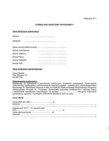 Załącznik Nr 1 FORMULARZ OFERTOWY WYKONAWCY Dane dotyczące wykonawcy Nazwa: ................................................ Siedziba: ................................................ Adres poczty elektronicznej: ................................................ Strona internetowa: ................................................ Numer telefonu: ................................................. Numer faksu: ................................................. Numer REGON: ................................................ Numer NIP: ................................................ Dane dotyczące zamawiającego Urząd Miasta Plac Staszica 10 64-920 Piła Zobowiązania wykonawcy Nawiązując do ogłoszenia o zamówieniu publicznym: przedmiot zamówienia „Opracowanie dokumentacji aplikacyjnej o dofinansowanie realizacji projektu rewaloryzacji zabytkowego Parku Miejskiego im. Stanisława Staszica w Pile ze środków Wielkopolskiego Regionalnego Programu Operacyjnego, Priorytet VI - Turystyka i Środowisko kulturowe, Działanie 6.2 - Rozwój kultury i zachowanie dziedzictwa kulturowego”, nr sprawy: ……………………., oferujemy wykonanie zamówienia, zgodnie z wymogami Warunków składania ofert za cenę: Cena oferty Cena ofertowa netto ....................................... zł (słownie:........................................................................................................................................... ........................................................................................................................................................) Stawka pod. VAT......%, wartość pod. VAT.....................................................................................zł Cena ofertowa brutto ......................................zł (słownie:........................................................................................................................................... ........................................................................................................................................................) 1 Oświadczam, Ŝe : Wykonam zamówienie publiczne w terminie do dnia: 31 grudnia 2008 r. Termin płatności: ................ dni ................ Inne: Inne Osoby do kontaktów z Zamawiającym Osoba / osoby do kontaktów z Zamawiającym odpowiedzialne za wykonanie zobowiązań umowy: • ......................................................................................................................... .......... .......... .......... .......... .......... .......... .......... .......... .......... tel. kontaktowy, faks: .......... .......... .......... zakres odpowiedzialności................................................................................... • ......................................................................................................................... .......... .......... .......... .......... .......... .......... .......... .......... .......... tel. kontaktowy, faks: .......... .......... .......... zakres odpowiedzialności Pełnomocnik w przypadku składania oferty wspólnej Nazwisko, imię ....................................................................................................... Stanowisko ............................................................................................................. Telefon .................................................. faks ......................................................... Zakres: - do reprezentowania w postępowaniu - do reprezentowania w postępowaniu i zawarcia umowy - do zawarcia umowy Oświadczenie dotyczące postanowień specyfikacji istotnych warunków zamówienia. 1. Oświadczamy, Ŝe zapoznaliśmy się z Warunkami składania ofert, nie wnosimy Ŝadnych zastrzeŜeń oraz uzyskaliśmy niezbędne informacje do przygotowania oferty. 2. Oświadczamy, Ŝe uwaŜamy się za związanych z ofertą przez czas wskazany w Warunkach składania ofert. 3. Wadium nie jest wymagane 4. Oświadczamy, Ŝe załączone do Warunków składania ofert wymagania stawiane wykonawcy oraz postanowienia umowy zostały przez nas zaakceptowane bez zastrzeŜeń i zobowiązujemy się w przypadku wyboru naszej oferty do zawarcia umowy w miejscu i terminie wyznaczonym przez Zamawiającego. Dokumenty Na potwierdzenie spełnienia wymagań do oferty załączam: .......... .......... .......... .......... .......... .......... .......... .......... .......... .......... .......... .......... .......... .......... .......... .......... .......... .......... .......... .......... .......... .......... .......... .......... .......... .......... .......... .......... .......... .......... .......... .......... .......... .......... .......... .......... .......... .......... .......... .......... .......... .......... .......... .......... .......... 2 Zabezpieczenie naleŜytego wykonania umowy: Nie jest wymagane ZastrzeŜenie wykonawcy NiŜej wymienione dokumenty składające się na ofertę nie mogą być ogólnie udostępnione: ……………………………………………………………………………………………………………… ……………………………………………………………………………………………………………… ………………………………………………………………………..................................................... Inne informacje wykonawcy: ……………………………………………………………………………………………………………… ……………………………………………………………………………………………………………… ………………………………………………………………………...................................................... ................................................................. ................................................................. I
