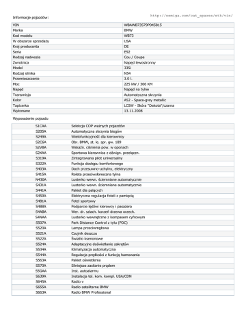 http://nemiga.com/cat_spares/etk/vin/ Informacje pojazdów: VIN WBAWB73579P045815 Marka BMW Kod modelu WB73 W obszarze sprzedaży USA Kraj producenta DE Seria E92 Rodzaj nadwozia Cou / Coupe Zwrotnica Napęd lewostronny Model 335i Rodzaj silnika N54 Przemieszczenie 3.0 l. Moc 225 kW / 306 KM Napęd Napęd na tylne Transmisja Automatyczna skrzynia Kolor A52 - Space-grey metallic Tapicerka LCSW - Skóra "Dakota"/czarna Wykonane 13.11.2008 Wyposażenie pojazdu S1CAA Selekcja COP ważnych pojazdów S205A Automatyczna skrzynia biegów S249A Wielofunkcyjność dla kierownicy S2C6A Obr. BMW, st. le. spr. gw. 189 S2VBA Wskaźn. ciśnienia pow. w oponach S2XAA Sportowa kierownica z dźwign. przełączn. S319A Zintegrowana pilot uniwersalny S322A Funkcja dostępu komfortowego S403A Dach przesuwno-uchylny, elektryczny S415A Roleta przeciwsłoneczna tylna N430A Lusterko wewn. ściemniane automatycznie S431A Lusterko wewn. ściemniane automatycznie S441A Pakiet dla palących S459A Elektryczna regulacja foteli z pamięcią S481A Fotel sportowy S488A Podparcie lędźwi kierowcy i pasażera S4ABA Wer. dr. szlach. korzeń drzewa orzech. S4NAA Lusterko wewnętrzne z kompasem cyfrowym S507A Park Distance Control z tyłu (PDC) S520A Lampa przeciwmgłowa S521A Czujnik deszczu S522A Światło ksenonowe S524A Adaptacyjne doświetlanie zakrętów S534A Klimatyzacja automatyczna S544A Regulacja prędkości z funkcją hamowania S563A Pakiet oświetlenia S570A Silniejsze zasilanie prądem S5GAA Inst. autoalarmu S639A Instalacja tel. kom. kompl. USA/CDN S645A Radio v S655A Radio satelitarne BMW S663A Radio BMW Professional S676A System głośników HiFi S697A Area-Code 1 do DVD N704A M Podwozie sportowe z obniż. zawiesz. S760A Wysoki połysk Shadow-Line S823A Wersja dla ciepłych krajów S840A Dostos. do wysokich prędkości S845A Akustyczne ostrzeżenie o pasach S850A Dummy-SALAPA S853A Wersja językowa, angielski S876A Częstotliwość radiowa 315 MHz S8SCA Aktywacja syst. telem. char. dla kraju S8SPA Sterowanie COP S925A Dummy-SALAPA Dokument przygotowany przez portal Automotive Nemiga.com. Informacje na temat VIN bezpłatnie!