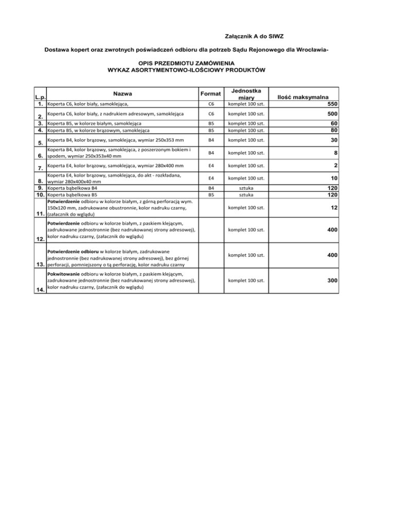 Załącznik A do SIWZ Dostawa kopert oraz zwrotnych poświadczeń odbioru dla potrzeb Sądu Rejonowego dla WrocławiaOPIS PRZEDMIOTU ZAMÓWIENIA WYKAZ ASORTYMENTOWO-ILOŚCIOWY PRODUKTÓW Nazwa L.p. 1. Koperta C6, kolor biały, samoklejąca, Koperta C6, kolor biały, z nadrukiem adresowym, samoklejąca 2. 3. Koperta B5, w kolorze białym, samoklejąca 4. Koperta B5, w kolorze brązowym, samoklejąca 5. Koperta B4, kolor brązowy, samoklejąca, wymiar 250x353 mm Koperta B4, kolor brązowy, samoklejąca, z poszerzonym bokiem i 6. spodem, wymiar 250x353x40 mm 7. Koperta E4, kolor brązowy, samoklejąca, wymiar 280x400 mm Koperta E4, kolor brązowy, samoklejąca, do akt - rozkładana, 8. wymiar 280x400x40 mm 9. Koperta bąbelkowa B4 10. Koperta bąbelkowa B5 Potwierdzenie odbioru w kolorze białym, z górną perforacją wym. 150x120 mm, zadrukowane obustronnie, kolor nadruku czarny, 11. (załacznik do wglądu) 12. Potwierdzenie odbioru w kolorze białym, z paskiem klejącym, zadrukowane jednostronnie (bez nadrukowanej strony adresowej), kolor nadruku czarny, (załacznik do wglądu) Potwierdzenie odbioru w kolorze białym, zadrukowane jednostronnie (bez nadrukowanej strony adresowej), bez górnej 13. perforacji, pomniejszony o tą perforację, kolor nadruku czarny 14. Pokwitowanie odbioru w kolorze białym, z paskiem klejącym, zadrukowane jednostronnie (bez nadrukowanej strony adresowej), kolor nadruku czarny, (załacznik do wglądu) Format Jednostka miary C6 komplet 100 szt. Ilość maksymalna 550 C6 komplet 100 szt. 500 B5 B5 komplet 100 szt. komplet 100 szt. 60 80 B4 komplet 100 szt. 30 B4 komplet 100 szt. 8 E4 komplet 100 szt. 2 E4 komplet 100 szt. 10 B4 B5 sztuka sztuka 120 120 komplet 100 szt. 12 komplet 100 szt. 400 komplet 100 szt. 400 komplet 100 szt. 300