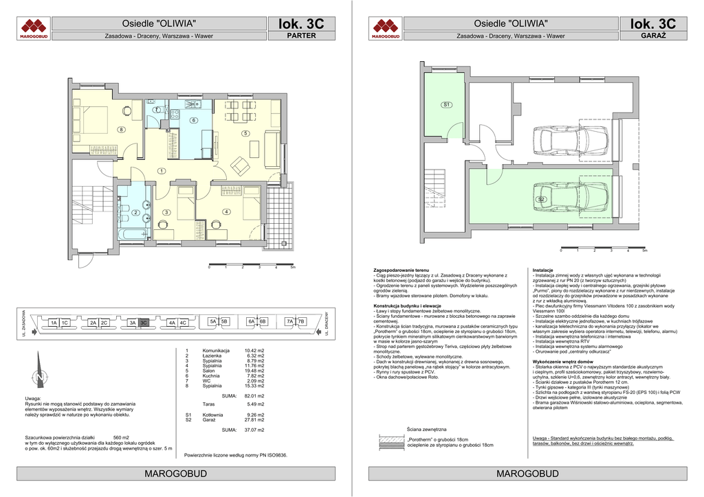 lok. 3C Osiedle "OLIWIA" PARTER Zasadowa - Draceny, Warszawa - Wawer lok. 3C Osiedle "OLIWIA" GARAŻ Zasadowa - Draceny, Warszawa - Wawer S1 7 6 8 5 1 S2 4 3 2 0 1A 1C 2A 2C 3A 3C 4A 5A 4C 1 2 3 4 5 6 7 8 1 5B Komunikacja Łazienka Sypialnia Sypialnia Salon Kuchnia WC Sypialnia SUMA: Uwaga: Rysunki nie mogą stanowić podstawy do zamawiania elementów wyposażenia wnętrz. Wszystkie wymiary należy sprawdzić w naturze po wykonaniu obiektu. Taras S1 S2 2 3 6A 6B 5m 4 7A 10.42 m2 6.32 m2 8.79 m2 11.76 m2 19.48 m2 7.82 m2 2.09 m2 15.33 m2 Zagospodarowanie terenu - Ciąg pieszo-jezdny łączący z ul. Zasadową z Draceny wykonane z kostki betonowej (podjazd do garażu i wejście do budynku). - Ogrodzenie terenu z paneli systemowych. Wydzielenie poszczególnych ogrodów zielenią. - Bramy wjazdowe sterowane pilotem. Domofony w lokalu. 7B UL. DRACENY UL. ZASADOWA 0 Konstrukcja budynku i elewacje - Ławy i stopy fundamentowe żelbetowe monolityczne. - Ściany fundamentowe - murowane z bloczka betonowego na zaprawie cementowej. - Konstrukcja ścian tradycyjna, murowana z pustaków ceramicznych typu „Porotherm” o grubości 18cm, ocieplenie ze styropianu o grubości 18cm, pokrycie tynkiem mineralnym silikatowym cienkowarstwowym barwionym w masie w kolorze jasno-szarym - Strop nad parterem gęstożebrowy Teriva, częściowo płyty żelbetowe monolityczne. - Schody żelbetowe, wylewane monolityczne. - Dach w konstrukcji drewnianej, wykonanej z drewna sosnowego, pokrytej blachą panelową „na rąbek stojący” w kolorze antracytowym. - Rynny i rury spustowe z PCV. - Okna dachowe/połaciowe Roto. 82.01 m2 5.49 m2 Kotłownia Garaż SUMA: 2 3 4 5m Instalacje - Instalacja zimnej wody z własnych ujęć wykonana w technologii zgrzewanej z rur PN 20 (z tworzyw sztucznych) - Instalacja ciepłej wody i centralnego ogrzewania, grzejniki płytowe „Purmo”, piony do rozdzielaczy wykonane z rur nierdzewnych, instalacje od rozdzielaczy do grzejników prowadzone w posadzkach wykonane z rur z wkładką aluminiową. - Piec dwufunkcyjny firmy Viessmann Vitodens 100 z zasobnikiem wody Viessmann 100l - Szczelne szambo oddzielnie dla każdego domu - Instalacje elektryczne jednofazowe, w kuchniach trójfazowe - kanalizacja teletechniczna do wykonania przyłączy (lokator we własnym zakresie wybiera operatora internetu, telewizji, telefonu, alarmu) - Instalacja wewnętrzna telefoniczna i internetowa - Instalacja wewnętrzna RTV - Instalacja wewnętrzna systemu alarmowego - Orurowanie pod „centralny odkurzacz” Wykończenie wnętrz domów - Stolarka okienna z PCV o najwyższym standardzie akustycznym i cieplnym, profil sześciokomorowy, pakiet trzyszybowy, rozwiernouchylna, szklenie U=0,6, zewnętrzny kolor antracyt, wewnętrzny biały. - Ścianki działowe z pustaków Porotherm 12 cm. - Tynki gipsowe - kategoria III (tynki maszynowe) - Szlichta na podłogach z warstwą styropianu FS-20 (EPS 100) i folią PCW - Drzwi wejściowe pełne, izolowane akustycznie - Brama garażowa Wiśniowski stalowo-aluminiowa, ocieplona, segmentowa, otwierana pilotem 9.26 m2 27.81 m2 37.07 m2 560 m2 Szacunkowa powierzchnia działki w tym do wyłącznego użytkowania dla każdego lokalu ogródek o pow. ok. 60m2 i służebność przejazdu drogą wewnętrzną o szer. 5 m Ściana zewnętrzna „Porotherm” o grubości 18cm ocieplenie ze styropianu o grubości 18cm Uwaga - Standard wykończenia budynku bez białego montażu, podłóg, tarasów, balkonów, bez drzwi i ościeżnic wewnątrz. Powierzchnie liczone według normy PN ISO9836. MAROGOBUD 1 MAROGOBUD