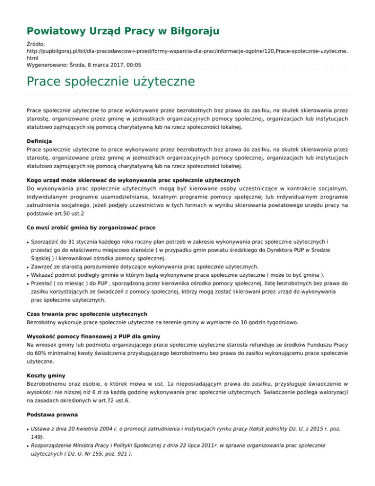 Powiatowy Urząd Pracy w Biłgoraju Źródło: http://pupbilgoraj.pl/bil/dla-pracodawcow-i-przed/formy-wsparcia-dla-prac/informacje-ogolne/120,Prace-spolecznie-uzyteczne. html Wygenerowano: Środa, 8 marca 2017, 00:05 Prace społecznie użyteczne Prace społecznie użyteczne to prace wykonywane przez bezrobotnych bez prawa do zasiłku, na skutek skierowania przez starostę, organizowane przez gminę w jednostkach organizacyjnych pomocy społecznej, organizacjach lub instytucjach statutowo zajmujących się pomocą charytatywną lub na rzecz społeczności lokalnej. Definicja Prace społecznie użyteczne to prace wykonywane przez bezrobotnych bez prawa do zasiłku, na skutek skierowania przez starostę, organizowane przez gminę w jednostkach organizacyjnych pomocy społecznej, organizacjach lub instytucjach statutowo zajmujących się pomocą charytatywną lub na rzecz społeczności lokalnej. Kogo urząd może skierować do wykonywania prac społecznie użytecznych Do wykonywania prac społecznie użytecznych mogą być kierowane osoby uczestniczące w kontrakcie socjalnym, indywidulanym programie usamodzielniania, lokalnym programie pomocy społęcznej lub indywidualnym programie zatrudnienia socjalnego, jeżeli podjęły uczestnictwo w tych formach w wyniku skierowania powiatowego urzędu pracy na podstawie art.50 ust.2 Co musi zrobić gmina by zorganizować prace ● Sporządzić do 31 stycznia każdego roku roczny plan potrzeb w zakresie wykonywania prac społecznie użytecznych i przesłać go do właściwemu miejscowo staroście ( w przypadku gmin powiatu średzkiego do Dyrektora PUP w Środzie Śląskiej ) i kierownikowi ośrodka pomocy społecznej. ● Zawrzeć ze starostą porozumienie dotyczące wykonywania prac społecznie użytecznych. ● Wskazać podmiot podległy gminie w którym będą wykonywane prace społecznie użyteczne ( może to być gmina ). ● Przesłać ( co miesiąc ) do PUP , sporządzoną przez kierownika ośrodka pomocy społecznej, listę bezrobotnych bez prawa do zasiłku korzystających ze świadczeń z pomocy społecznej, którzy mogą zostać skierowani przez urząd do wykonywania prac społecznie użytecznych. Czas trwania prac społecznie użytecznych Bezrobotny wykonuje prace społecznie użyteczne na terenie gminy w wymiarze do 10 godzin tygodniowo. Wysokość pomocy finansowej z PUP dla gminy Na wniosek gminy lub podmiotu organizującego prace społecznie użyteczne starosta refunduje ze środków Funduszu Pracy do 60% minimalnej kwoty świadczenia przysługującego bezrobotnemu bez prawa do zasiłku wykonującemu prace społecznie użyteczne. Koszty gminy Bezrobotnemu oraz osobie, o którek mowa w ust. 1a nieposiadającym prawa do zasiłku, przysługuje świadczenie w wysokości nie niższej niż 6 zł za każdą godzinę wykonywania prac społecznie użytecznych. Świadczenie podlega waloryzacji na zasadach określonych w art.72 ust.6. Podstawa prawna ● Ustawa z dnia 20 kwietnia 2004 r. o promocji zatrudnienia i instytucjach rynku pracy (tekst jednolity Dz. U. z 2015 r. poz. 149). ● Rozporządzenie Ministra Pracy i Polityki Społecznej z dnia 22 lipca 2011r. w sprawie organizowania prac społecznie użytecznych ( Dz. U. Nr 155, poz. 921 ). Metryka strony Data publikacji 14 grudnia 2012 Data modyfikacji 03 lutego 2015Rejestr zmian Osoba publikująca: JSK Internet 2 Autor: JSK Internet 2 Liczba wejść: 956 Drukuj Generuj PDF Powiadom znajomego Wstecz