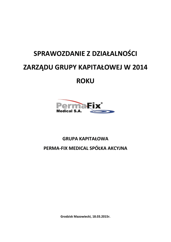 SPRAWOZDANIE Z DZIAŁALNOŚCI ZARZĄDU GRUPY KAPITAŁOWEJ W 2014 ROKU GRUPA KAPITAŁOWA PERMA-FIX MEDICAL SPÓŁKA AKCYJNA Grodzisk Mazowiecki, 18.03.2015r. 1. PODSTAWOWE INFORMACJE NA TEMAT SPÓŁKI Nazwa firmy: Perma-Fix Medical Spółka Akcyjna Forma prawna: Spółka Akcyjna Siedziba: Grodzisk Mazowiecki Adres: Ul. Lecha Zondka 3 lok. 7, 05-825 Grodzisk Mazowiecki Numer telefonu: +48 (22) 212 87 51 Fax: +48 (22) 378 24 99 E-mail: [email protected] Adres strony internetowej: www.medical-isotope.com NIP: 8943022798 REGON: 021527509 KRS: 0000392945 Źródło: Spółka ZARZĄD SPÓŁKI: Na dzieo przygotowania niniejszego sprawozdania, Zarząd Spółki składa się z Prezesa Zarządu, którym jest pan Louis F. Centofanti. W dniu 23 września 2014 r. Rada Nadzorcza Spółki na posiedzeniu odwołała ze składu Zarządu Spółki pana Dominika Dymeckiego ze skutkiem na dzieo 23 września 2014 r. Na tym samym posiedzeniu Rada Nadzorcza Spółki powołała do składu Zarządu na stanowisko Prezesa Zarządu pana Louis F. Centofanti ze skutkiem na dzieo 24 września 2014 r. RADA NADZORCZA SPÓŁKI: Ze skutkiem na dzieo 4 kwietnia 2014 r. nastąpiła zmiana w składzie Rady Nadzorczej Spółki. Na dzieo sporządzenia niniejszego sprawozdania w skład Rady Nadzorczej Spółki wchodzą: Robert Schreiber, Jr. Larry M. Shelton, James A. Blankenhorn, SPRAWOZDANIE Z DZIAŁALNOŚCI ZARZĄDU GRUPY KAPITAŁOWEJ STRONA 2 Robert L. Ferguson, David K. Waldman. OPIS DZIAŁALNOŚCI SPÓŁKI: Perma-Fix Medical S.A. jest spółką zależną spółki giełdowej Perma-Fix Environmental Services notowanej na rynku NASDAQ. Spółka powstała w celu dalszego rozwoju opracowanej przez spółkę zależną Perma-Fix Medical Corporation nowej technologii wytwarzania Technetu-99 (Tc-99m), najczęściej stosowanego izotopu medycznego na świecie, uzyskania dla niej zatwierdzenia Amerykaoskiej Agencji ds. Żywności i Leków („FDA”) oraz innych formalnych pozwoleo, oraz komercjalizacji tej technologii. Przewiduje się, że nowy proces umożliwi rozwiązanie problemu światowych niedoborów Tc-99m ze względu na niższy koszt, brak konieczności wykorzystania materiałów stosowanych do produkcji broni masowego rażenia dotowanych przez rządy oraz fakt, że może byd łatwo wdrażany na całym świecie przy wykorzystaniu standardowych i komercyjnych reaktorów badawczych, eliminując potrzebę wykorzystywania reaktorów specjalnego przeznaczenia. Spółka zależna Perma-Fix Medical Corp. posiada umowę patentową ze spółką Perma-Fix Environmental Services Inc. na produkcję i dalszy rozwój Tc-99m. STRUKTURA AKCJONARIATU: Akcjonariusz Liczba akcji Liczba głosów Udział w KZ Udział w głosach na WZ Perma-Fix Environmental Services, Inc. 800 000 800 000 64,00% 64,00% Astoria Capital S.A.* 133 277 133 277 10,66% 10,66% TFI PZU S.A.** 120 000 120 000 9,60% 9,60% Pozostali (każdy posiada <5%) 196 723 196 723 15,74% 15,74% RAZEM 1 250 000 1 250 000 100,00% 100,00% Źródło: Spółka * łącznie bezpośrednio oraz pośrednio poprzez podmiot zależny ** działając w imieniu i na rzecz PZU Fundusz Inwestycyjny Otwarty Parasolowy oraz PZU Fundusz Inwestycyjny Zamknięty Medyczny. 2. PODSTAWOWA CHARAKTERYSTYKA GRUPY KAPITAŁOWEJ PERMA-FIX MEDICAL S.A. Pod koniec I kwartału 2014 r. Spółka zawarła umowę ze spółką Perma-Fix Environmental Services Inc. na zakupu 100% akcji spółki Perma-Fix Medical Corporation. W związku z powyższym na dzieo SPRAWOZDANIE Z DZIAŁALNOŚCI ZARZĄDU GRUPY KAPITAŁOWEJ STRONA 3 sporządzenia niniejszego sprawozdania Emitent posiada podmiot zależny spółkę Perma-Fix Medical Corporation i wraz z nią tworzy grupę kapitałową. Poniżej znajdują się podstawowe dane na temat podmiotu zależnego od Emitenta: Nazwa firmy: Perma-Fix Medical Corporation Forma prawna: Corporation Siedziba: Atlanta, USA Adres: 8302 Dunwoody Place, Suite 250, Atlanta, GA 30350 Przedmiot działalności: Spółka stworzyła oraz rozwinęła przełomową technologię wytwarzania izotopów medycznych, głównie izotopu Technetu99 (najbardziej znanego i najczęściej stosowanego izotopu medycznego na świecie) w celu wyeliminowania światowego niedoboru tego izotopu w medycynie jądrowej Udział Spółki w kapitale zakładowym: 100,00% Udział Spółki w głosach na walnym zgromadzeniu: 100,00% Źródło: Spółka 3. ZDARZENIA ISTOTNIE WPŁYWAJĄCE NA DZIAŁALNOŚD JEDNOSTKI, JAKIE NASTĄPIŁY W ROKU OBROTOWYM, A TAKŻE PO JEGO ZAKOOCZENIU, DO DNIA ZATWIERDZENIA SPRAWZODANIA FINANSOWEGO Na działalnośd samej Spółki jak i Grupy Kapitałowej wpływ miały następujące istotne zdarzenia: Zmiana nazwy Spółki W dniu 24 marca 2014 r. Nadzwyczajne Walne Zgromadzenie Spółki, na mocy uchwały nr 3 w sprawie zmiany Statutu w zakresie zmiany firmy Spółki i upoważnienia Rady Nadzorczej do ustalenia jednolitego tekstu zmienionego Statutu Spółki, dokonało zmiany nazwy Spółki z CEE OPPORTUNITY PARTNERS POLAND S.A. na PERMA-FIX MEDICAL S.A. W tym samym dniu Spółka nabyła 100% akcji spółki Perma-Fix Medical Corporation z siedzibą w Atlancie, Georgia, USA. SPRAWOZDANIE Z DZIAŁALNOŚCI ZARZĄDU GRUPY KAPITAŁOWEJ STRONA 4 Zawiadomienie otrzymane od głównego akcjonariusza – spółki dominującej nad Perma-Fix Medical S.A. Emitent otrzymał zawiadomienie od spółki Perma-Fix Environmental Services, Inc. („PESI”) o zakupie przez nią 800.000 akcji Spółki. W wyniku zawartej transakcji PESI stała się podmiotem dominującym wobec Emitenta, która na tamten czas posiadała 80% udziału w kapitale zakładowym Spółki oraz 80% udziału w głosach na Walnym Zgromadzeniu Emitenta. Zmiana w składzie Rady Nadzorczej Spółki Ze skutkiem na dzieo 4 kwietnia 2014 r. nastąpiła zmiana w składzie Rady Nadzorczej Spółki. Na dzieo sporządzenia niniejszego sprawozdania w skład Rady Nadzorczej Spółki wchodzą: Robert Schreiber, Jr. Larry M. Shelton, James A. Blankenhorn, Robert L. Ferguson, David K. Waldman