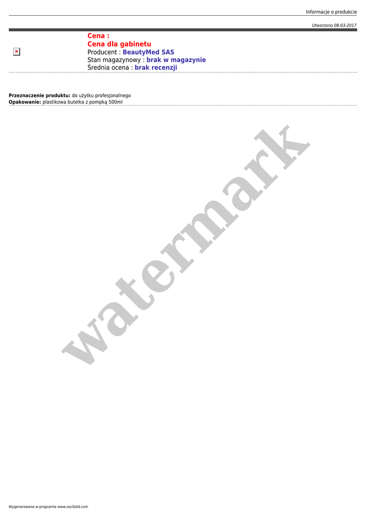 Informacje o produkcie Utworzono 08-03-2017 Cena : Cena dla gabinetu Producent : BeautyMed SAS Stan magazynowy : brak w magazynie Średnia ocena : brak recenzji w at er m ar k Przeznaczenie produktu: do użytku profesjonalnego Opakowanie: plastikowa butelka z pompką 500ml Wygenerowano w programie www.oscGold.com