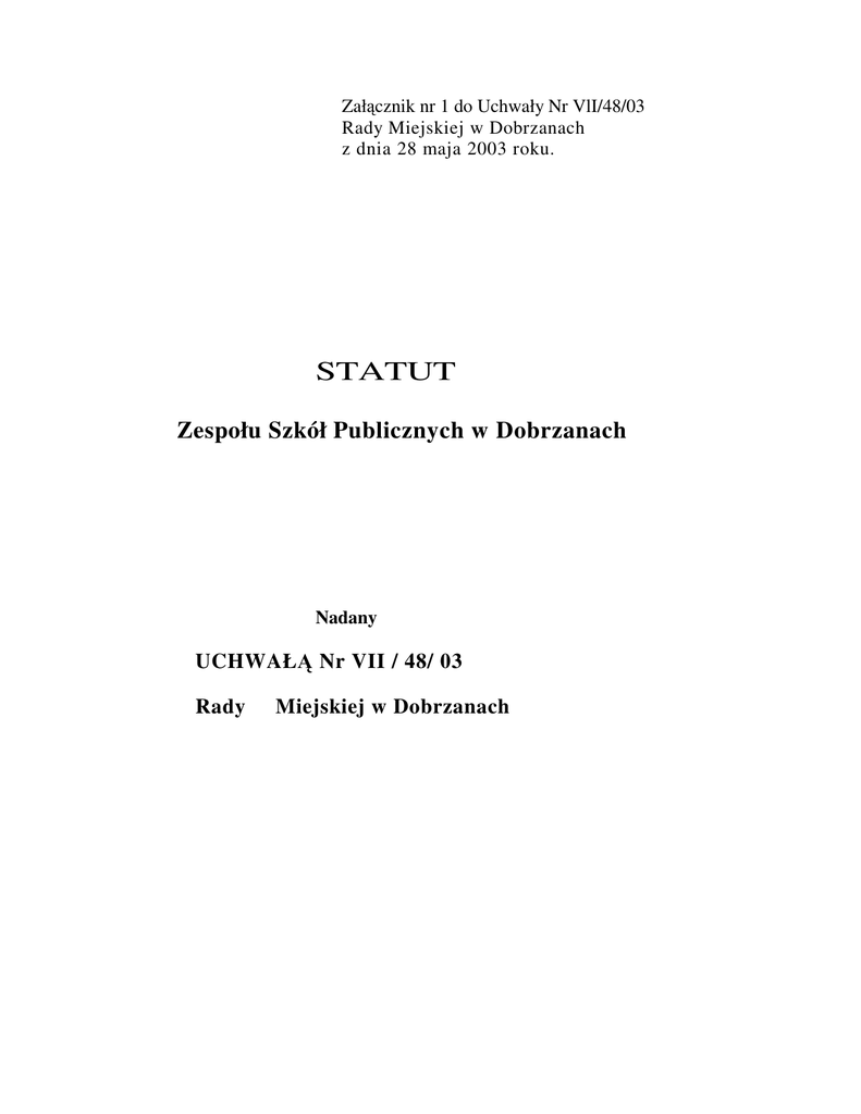 Zał cznik nr 1 do Uchwały Nr VlI/48/03 Rady Miejskiej w Dobrzanach z dnia 28 maja 2003 roku. STATUT Zespołu Szkół Publicznych w Dobrzanach Nadany UCHWAŁ Rady Nr VII / 48/ 03 Miejskiej w Dobrzanach POSTANOWIENIA OGÓLNE § 1 . 1 . W skład Zespołu Szkół Publicznych w Dobrzanach zwanym dalej „Zespołem Szkół" wchodz : 1. Szkoła Podstawowa im. Tadeusza Ko ciuszki w Dobrzanach 2. Gimnazjum w Dobrzanach 3. Przedszkole w Dobrzanach 2. Siedzib Zespołu Szkół jest budynek przy ulicy Mickiewicza Nr 43. § 2. Zespół Szkół u ywa piecz ci o tre ci; Zespól Szkól Publicznych 73-130 Dobrzany ul. Mickiewicza 43 § 3. Zespołowi Szkół nadaje imi organ prowadz cy, na wspólny wniosek Rady Szkoły Podstawowej, Rady Gimnazjum i Rady Przedszkola lub wspólny wniosek Rad Pedagogicznych, Rad Rodziców i Samorz dów Uczniowskich szkół wchodz cych w skład zespołu. § 4. 1. Organem prowadz cym Zespół Szkół jest Gmina Dobrzany. 2. Nadzór pedagogiczny nad Zespołem Szkół sprawuje Zachodniopomorski Kurator O wiaty w Szczecinie. 3. Czas rozpocz cia i ko czenia zaj dydaktycznych oraz ferii okre la Minister Edukacji i Sportu w drodze rozporz dzenia w sprawie organizacji roku szkolnego. CELE I ZADANIA ZESPOŁU SZKÓL § 5. Zespół Szkół realizuje cele i zadania okre lone w Ustawie z dnia 07 wrze nia 1991 r. o systemie o wiaty (Dz. U. Nr 67, poz. 329 ze zm.) oraz w przepisach wykonawczych wydanych na jej podstawie, a w szczególno ci: 1. Umo liwia zdobycie wiedzy i umiej tno ci niezb dnych do uzyskania wiadectwa uko czenia szkoły poprzez: 1) atrakcyjny i nowatorski proces nauczania 2) udział w warsztatach j zykowych. 2. Umo liwia absolwentom dokonanie wiadomego wyboru dalszego kierunku kształcenia lub wykonywania wybranego zawodu poprzez: 1) organizowanie zaj z pracownikami biura pracy, firm marketingowych; 2) poradnictwo psychologiczno-pedagogiczne; 3) rozwijanie zainteresowa na zaj ciach pozalekcyjnych. 2 3. Kształtuje rodowisko wychowawcze sprzyjaj ce realizowaniu celów i zasad okre lonych w ustawie, stosownie do warunków Zespołu Szkoły i wieku ucznia poprzez: 1) zapewnienie odpowiedniej bazy dla uczniów; 2) systematyczne diagnozowanie i monitorowanie zachowa uczniów. 4. Sprawuje opiek nad uczniami odpowiednio do ich potrzeb poprzez: 1) organizowanie zaj wietlicowych; 2) system zapomóg; 3) prowadzenie zaj dydaktyczno - wychowawczych. ORGANY ZESPOŁU SZKÓŁ § 6. 1. Organem Zespołu Szkół jest dyrektor. 2. Rada Pedagogiczna, Rada Rodziców i Samorz d Uczniowski funkcjonuj oddzielnie w Szkole Podstawowej w Dobrzanach, w Gimnazjum w Dobrzanach oraz w Przedszkolu. Kompetencje tych organów okre lone s w odr bnych statutach. § 7. 1. Zespołem Szkół kieruje osoba, której powierzono stanowisko dyrektora. 2. Dyrektor Zespołu Szkół w szczególno ci: 1) kieruje bie c działalno ci dydaktyczno-wychowawcz i opieku cz Zespołu Szkół; 2) sprawuje nadzór pedagogiczny nad działalno ci nauczycieli i wychowawców; 3) przewodniczy Radom Pedagogicznym; 4) realizuje uchwały Rad Pedagogicznych, je eli s zgodne z prawem o wiatowym, niezgodne za wstrzymuje i powiadamia o tym fakcie organ prowadz cy; 5) zatrudnia i zwalnia nauczycieli oraz pracowników niepedagogicznych zgodnie z odr bnymi przepisami; 6) przyznaje nagrody i wymierza kary pracownikom Zespołu Szkół; 7) dysponuje rodkami finansowymi; 8) opracowuje arkusz organizacyjny; 9) dba o powierzone mienie; 10) wydaje polecenia słu bowe; 11) dokonuje oceny pracy nauczycieli; 12) nadaje stopie awansu zawodowego nauczycielom; 13) realizuje pozostałe zadania dyrektora wynikaj ce z ustawy; 14) kontroluje spełnianie obowi zku szkolnego i wydaje decyzje administracyjne w zakresie zezwolenia na realizacje obowi zku szkolnego poza szkoł i przeprowadzenie 3 egzaminu klasyfikacyjnego; 15) reprezentuje Zespół Szkół na zewn trz; 16) współpracuje z Rad Rodziców, Rad Pedagogiczn i Samorz dem Uczniowskim Szkoły Podstawowej w Dobrzanach, Gimnazjum w Dobrzanach i Przedszkolu w Dobrzanach; 17) rozstrzyga sprawy sporne i konfliktowe mi dzy organami wymienionymi w § 6 ust.2; 18) przestrzega postanowie Statutu Szkoły Podstawowej, Gimnazjum i Przedszkola w Dobrzanach w sprawie rodzaju nagród i kar stosowanych wobec uczniów; 19) podejmuje decyzje o zawieszeniu zaj dydaktycznych z zachowaniem warunków okre lonych odr bnymi przepisami; 20) prowadzi dokumentacj pedagogiczn zgodnie z odr bnymi przepisami; 21) na podstawie odr bnych przepisów mo e utworzy stanowisko dwóch wicedyrektorów. POSTANOWIENIA KO COWE §8. 1. Ka da ze szkół wchodz ca w skład Zespołu Szkół posiada własny statut, mo e równie posiada własny sztandar, godło oraz ceremoniał szkolny. 2. Organizacj szkoły, zakres zada nauczycieli oraz innych pracownikówszkoły, zasad rekrutacji uczniów oraz prawa i obowi zki uczniów, w tym przypadki w których ucze mo e zosta skre lony z listy uczniów okre lone s w odr bnych statutach szkół. 3. Zespół Szkół u ywa piecz ci urz dowych zgodnie z odr bnymi przepisami. 4. Zespół Szkół prowadzi i przechowuje dokumentacj zgodnie z odr bnymi przepisami. 5. Zasady prowadzenia przez Zespół Szkół gospodarki finansowej i materiałowej okre laj odr bne przepisy. 6. Organem kompetentnym do uchwalania zmian w Statucie Zespołu Szkół jest Rada Pedagogiczna Szkoły Podstawowej w Dobrzanach, Rada Pedagogiczna Gimnazjum w Dobrzanach oraz Rada Pedagogiczna Przedszkola w Dobrzanach. Zmiana w statucie Zespołu wymaga podj cia zgodnych uchwał przez wszystkie rady. 4