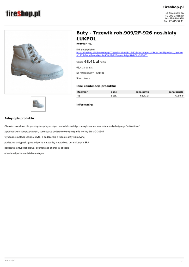 Fireshop.pl ul. Traugutta 9A 49-200 Grodków tel: 888 444 998 fax: 77 415 37 11 Buty - Trzewik rob.909/2F-926 nos.biały ŁUKPOL Rozmiar: 43, link do produktu: http://fireshop.pl/obuwie/Buty-Trzewik-rob-909-2F-926-nos-bialy-LUKPOL-.html?product_rewrite =1916-Buty-Trzewik-rob-909-2F-926-nos-bialy-LUKPOL--521401 Cena: 63,41 zł netto 63,41 zł za szt. Nr referencyjny: 521401 Stan: Nowy Inne kombinacje produktu: Rozmiar ilość cena netto cena brutto 43 3 szt. 63,41 zł 77,99 zł Informacje: Pełny opis produktu Obuwie zawodowe dla przemysłu spożywczego , antyelektrostatyczne,wykonane z materiału oddychającego "mikrofibra" z podnoskiem kompozytowym, spełniajace podstawowe wymagania normy EN ISO 20347 wykonane metodą klejono-szytą, z podszewką z tkaniny antywibracyjnej podeszwa antyposlizgowa,odporna na poślizg na podłozu ceramicznym SRA podeszwa antyprzebiciowa, pochłaniacz energii w obcasie obuwie odporne na działanie olejów 8-03-2017 1/1