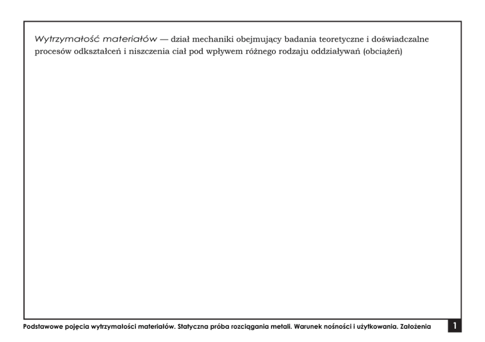 Wytrzymałość materiałów — dział mechaniki obejmujący badania teoretyczne i doświadczalne procesów odkształceń i niszczenia ciał pod wpływem różnego rodzaju oddziaływań (obciążeń) Podstawowe pojęcia wytrzymałości materiałów. Statyczna próba rozciągania metali. Warunek nośności i użytkowania. Założenia 1 Podstawowe pojęcia wytrzymałości materiałów — naprężenia Rozpatrzmy ciało stałe, odkształcalne sprężyście, znajdujące się w równowadze statycznej Rozważmy małą powierzchnię ΔA wokół punktu B. Zgodnie z prawem akcji i reakcji Newtona, jeśli część prawa działa na część lewą siłą ΔS na powierzchni ΔA , to część lewa działa na część prawą siłą ΔS na tej samej powierzchni ΔA Siły ΔS i ΔS są kolinearne, o jednakowych wartościach i przeciwnych zwrotach Siły ΔS i ΔS są reakcją przenoszoną przez więzy na małej powierzchni ΔA przekroju ciała Podstawowe pojęcia wytrzymałości materiałów. Statyczna próba rozciągania metali. Warunek nośności i użytkowania. Założenia 2 Podstawowe pojęcia wytrzymałości materiałów — naprężenia Określmy wektor naprężenia s w następujący sposób s lim ΔA 0 ΔS ΔA (2.1) Wektor naprężenia w możemy rozłożyć na dwie składowe sστ σ τ — składowa normalna (wzdłuż osi normalnej n) — składowa styczna (wzdłuż osi stycznej t) Wartość naprężenia w punkcie B jest równa modułowi wektora s s |s | Naprężenie normalne σ s cos (2.2) τ s sin (2.3) s2 σ 2 τ 2 (2.4) Naprężenie styczne Spełnione jest zatem Podstawowe pojęcia wytrzymałości materiałów. Statyczna próba rozciągania metali. Warunek nośności i użytkowania. Założenia 3 Podstawowe pojęcia wytrzymałości materiałów — naprężenia Jednostki naprężeń s lim ΔA 0 ΔS ΔA — podstawowa jednostka naprężenia — [Pa] paskal N 1 2 1[Pa ] m — wielokrotności kilopaskal 1[kPa ] 10 3 [Pa] megapaskal 1[MPa ] 10 6 [Pa] gigapaskal 1[GPa ] 10 9 [Pa] N 1[MPa ] 10 6 2 10 6 m N N 1 3 2 2 (10 mm) mm Podstawowe pojęcia wytrzymałości materiałów. Statyczna próba rozciągania metali. Warunek nośności i użytkowania. Założenia 4 Podstawowe pojęcia wytrzymałości materiałów — przemieszczenia i odkształcenia Rozważmy bryłę odkształcalną w układzie xyz Wprowadźmy trzy punkty A, B i C, tak aby odcinki AB (o długości b) i AC (o długości c) były małe i prostopadłe do siebie w konfiguracji nieodkształconej Przeanalizujmy odkształcenia w punkcie A. W konfiguracji odkształconej mamy r — wektor przemieszczenia punktu A, Δb — wydłużenie odcinka b ( b b Δb ) Δc — wydłużenie odcinka c ( c c Δc ) γ — kąt określający zmniejszenie kąta prostego BAC. Podstawowe pojęcia wytrzymałości materiałów. Statyczna próba rozciągania metali. Warunek nośności i użytkowania. Założenia 5 Podstawowe pojęcia wytrzymałości materiałów — przemieszczenia i odkształcenia Przemieszczenie punktu A r rx ex ry ey rz ez rx , ry , rz [m] (2.5) Odkształcenie normalne (kierunkowe) ε lim b 0 Δb b (2.6) wydłużenie względne odcinka AB, gdy jego długość dąży do zera Odkształcenie styczne (postaciowe) γ lim (BAC BA C) b 0 c 0 (2.7) zmniejszeniem kąta prostego BAC, gdy długości odcinków AB, AC, dążą do zera Podstawowe pojęcia wytrzymałości materiałów. Statyczna próba rozciągania metali. Warunek nośności i użytkowania. Założenia 6 Podstawowe pojęcia wytrzymałości materiałów Istnieje nieskończenie wiele konfiguracji kierunków AB, AC tworzących kąt prosty. Dlatego mówimy o stanie naprężenia i stanie odkształcenia w punkcie A. Stan naprężenia w punkcie A wektor naprężenia s dla wszystkich możliwych położeń normalnej n w punkcie A Stan odkształcenia w punkcie A odkształcenie ε dla wszystkich możliwych położeń odcinka AB odkształcenie γ dla wszystkich możliwych położeń kąta prostego BAC W klasycznej wytrzymałości materiałów przyjmuje się zasadę zesztywnienia przy formułowaniu równań równowagi, tzn. równania te zapisujemy w konfiguracji nieodkształconej. Przy obliczaniu naprężeń konieczne jest uwzględnienie odkształceń bryły, widocznych w konfiguracji odkształconej Podstawowe pojęcia wytrzymałości materiałów. Statyczna próba rozciągania metali. Warunek nośności i użytkowania. Założenia 7 Statyczna próba rozciągania metali Podstawowym urządzeniem do wyznaczania stałych materiałowych materiałów izotropowych jest maszyna wytrzymałościowa Maszyna wytrzymałościowa Instron 8802 Maszyna wytrzymałościowa Instron SATEC 1200KN Podstawowe pojęcia wytrzymałości materiałów. Statyczna próba rozciągania metali. Warunek nośności i użytkowania. Założenia 8 Statyczna próba rozciągania metali Próbki do badań mają unormowane wymiary W praktyce do badań na rozciąganie stosuje się próbki o kształcie wiosełkowym lub w postaci pręta okrągłego z główkami do chwytania Podstawowe pojęcia wytrzymałości materiałów. Statyczna próba rozciągania metali. Warunek nośności i użytkowania. Założenia 9 Statyczna próba rozciągania metali Rozpatrzmy próbkę wiosełkową rozciąganą osiowo Przeanalizujmy prostokąt pomiarowy o wymiarach b l W wyniku działania siły P próbka odkształca się następująco: — następuje wydłużenie odcinka l o wartość Δl Δl l l — następuje przewężenie odcinka b o wartość Δb Δb b b Podstawowe pojęcia wytrzymałości materiałów. Statyczna próba rozciągania metali. Warunek nośności i użytkowania. Założenia 10 Statyczna próba rozciągania metali Rozpatrzmy próbkę wiosełkową rozciąganą osiowo W przekrojach poprzecznych postaje tylko siła osiowa N równa co do wartości sile rozciągającej P N P (2.8) Rozważmy przekrój poprzeczny o polu A. Powierzchnia różniczkowa dA jest obciążona siłą różniczkową dN — w punkcie centralnym powierzchni dA występuje naprężenie określone 