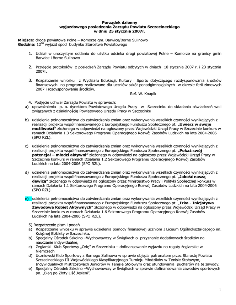Porządek dzienny wyjazdowego posiedzenia Zarządu Powiatu Szczecineckiego w dniu 25 stycznia 2007r. Miejsce: droga powiatowa Polne – Komorze gm. Barwice/Borne Sulinowo Godzina: 1200 wyjazd spod budynku Starostwa Powiatowego 1. Udział w uroczystym oddaniu do użytku odcinka drogi powiatowej Polne – Komorze na granicy gmin Barwice i Borne Sulinowo 2. Przyjęcie protokołów z posiedzeń Zarządu Powiatu odbytych w dniach 18 stycznia 2007 r. i 23 stycznia 2007r. 3. Rozpatrzenie wniosku z Wydziału Edukacji, Kultury i Sportu dotyczącego rozdysponowania środków finansowych na programy realizowane dla uczniów szkół ponadgimnazjalnych w okresie ferii zimowych 2007 i rozdysponowanie środków. Ref. W. Knapik 4. Podjęcie uchwał Zarządu Powiatu w sprawach: a) upoważnienia p. o. dyrektora Powiatowego Urzędu Pracy w Szczecinku do składania oświadczeń woli związanych z działalnością Powiatowego Urzędu Pracy w Szczecinku b) udzielenia pełnomocnictwa do zatwierdzania zmian oraz wykonywania wszelkich czynności wynikających z realizacji projektu współfinansowanego z Europejskiego Funduszu Społecznego pt. „Uwierz w swoje możliwości” złożonego w odpowiedzi na ogłoszony przez Wojewódzki Urząd Pracy w Szczecinie konkurs w ramach Działania 1.3 Sektorowego Programu Operacyjnego Rozwój Zasobów Ludzkich na lata 2004-2006 (SPO RZL). c) udzielenia pełnomocnictwa do zatwierdzania zmian oraz wykonywania wszelkich czynności wynikających z realizacji projektu współfinansowanego z Europejskiego Funduszu Społecznego pt. „Pokaż swój potencjał – młodzi aktywni” złożonego w odpowiedzi na ogłoszony przez Wojewódzki Urząd Pracy w Szczecinie konkurs w ramach Działania 1.2 Sektorowego Programu Operacyjnego Rozwój Zasobów Ludzkich na lata 2004-2006 (SPO RZL). d) udzielenia pełnomocnictwa do zatwierdzania zmian oraz wykonywania wszelkich czynności wynikających z realizacji projektu współfinansowanego z Europejskiego Funduszu Społecznego pt. „Jakość naszą dewizą” złożonego w odpowiedzi na ogłoszony przez Ministerstwo Pracy i Polityki Społecznej konkurs w ramach Działania 1.1 Sektorowego Programu Operacyjnego Rozwój Zasobów Ludzkich na lata 2004-2006 (SPO RZL). e) udzielenia pełnomocnictwa do zatwierdzania zmian oraz wykonywania wszelkich czynności wynikających z realizacji projektu współfinansowanego z Europejskiego Funduszu Społecznego pt. „Izka - Inicjatywa Zawodowa Kobiet Aktywnych” złożonego w odpowiedzi na ogłoszony przez Wojewódzki Urząd Pracy w Szczecinie konkurs w ramach Działania 1.6 Sektorowego Programu Operacyjnego Rozwój Zasobów Ludzkich na lata 2004-2006 (SPO RZL). 5) Rozpatrzenie pism i podań a) Rozpatrzenie wniosku w sprawie udzielenia pomocy finansowej uczniom I Liceum Ogólnokształcącego im. Księżnej Elżbiety w Szczecinku. b) Specjalny Ośrodek Szkolno –Wychowawczy w Świątkach o przyznanie dodatkowych środków na nauczanie indywidualne, c) Żeglarski Klub Sportowy „Orlę” w Szczecinku – dofinansowanie wyjazdu na regaty żeglarskie w Niemczech d) Uczniowski Klub Sportowy z Bornego Sulinowa w sprawie objęcia patronatem przez Starostę Powiatu Szczecineckiego III Wojewódzkiego Klasyfikacyjnego Turnieju Młodzików w Tenisie Stołowym, Indywidualnych Mistrzostwach Juniorów w Tenisie Stołowym oraz ufundowania pucharów na te zawody, e) Specjalny Ośrodek Szkolno –Wychowawczy w Świątkach w sprawie dofinansowania zawodów sportowych pn. „Bieg po Złoty Liść Jesieni”, 1 f) DPS w Bornem Sulinowie – w sprawie wyrażenia zgody na zbycie dwóch samochodow: Renault Trafic i Renault Kango g) Opinia w sprawie uzgodnienia tekstu decyzji o lokalizacji inwestycji celu publicznego – inwestycji liniowych: budowa sieci wodociągowej dla terenów położonych w obrębach 03 i 05 Biały Bór oraz obrębie Sępolno Małe w gminie Biały Bór. h) DPS w Sulinowie – w sprawie - przekazania sprzętu z DPS na rzecz Gminy Borne Sulinowo na działalność Klubu Pracy, i) Polskie Stowarzyszenie Sportów Walki w Szczecinku o udostępnienie Sali gimnastycznej Zakładu Obsługi Nieruchomości. 6. Zapytania i wolne wnioski 7. Zamknięcie posiedzenia Zarządu 2