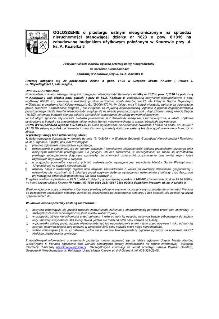 OGŁOSZENIE o przetargu ustnym nieograniczonym na sprzedaż nieruchomości stanowiącej działkę nr 1823 o pow. 0,1316 ha zabudowaną budynkiem użytkowym położonym w Knurowie przy ul. ks. A. Koziełka 8 Prezydent Miasta Knurów ogłasza przetarg ustny nieograniczony na sprzedaż nieruchomości położonej w Knurowie przy ul. ks. A. Koziełka 8 Przetarg odbędzie się 20 października ul. Niepodległości 7, sala sesyjna. 2009 r. o godz. 11.00 w Urzędzie Miasta Knurów ( Ratusz ), OPIS NIERUCHOMOŚCI Przedmiotem przetargu ustnego nieograniczonego jest nieruchomość stanowiąca działkę nr 1823 o pow. 0,1316 ha położoną w Knurowie ( woj. śląskie pow. gliwicki ) przy ul. ks.A. Koziełka 8, zabudowaną budynkiem niemieszkalnym o pow. użytkowej 680,85 m2, zapisaną w ewidencji gruntów m.Knurów, obręb Knurów, ark.22, dla której w Sądzie Rejonowym w Gliwicach prowadzona jest Księga wieczysta GL1G/00044701/1. W dziale I oraz III księgi wieczystej wpisane są ograniczone prawa rzeczowe ( służebności drogowe ) nie związane ze zbywaną nieruchomością. Zgodnie z planem zagospodarowania przestrzennego miasta Knurów nieruchomość znajduje się na terenie przeznaczonym pod usługi zdrowia i usług nieuciążliwych (1K.UZ), natomiast budynek stanowi obiekt o wartościach kulturowych chroniony prawem miejscowym. W aktualnym sposobie użytkowania budynku prowadzona jest działalność medyczna i farmaceutyczna, a lokale użytkowe usytuowane w budynku są przedmiotem najmu, wobec których nabywca wchodzi w prawa i obowiązki zbywającego. CENA WYWOŁAWCZA wynosi: 1.075.059,00 zł. Cena wylicytowana nieruchomości zwolniona z VAT-u na podst. art. 43 ust.1 pkt 10,10a ustawy o podatku od towarów i usług. Do ceny sprzedaży doliczone zostaną koszty przygotowania nieruchomości do zbycia. W przetargu mogą brać udział osoby, które: 1. złożą wymagane dokumenty w terminie do dnia 15.10.2009 r. w Wydziale Geodezji, Gospodarki Nieruchomości i Rolnictwa, ul. dr.F. Ogana 5, II piętro, pok.208 zawierające: a) pisemne zgłoszenie uczestnictwa w przetargu, b) oświadczenie o zapoznaniu się ze stanem prawnym i technicznym nieruchomości będącej przedmiotem przetargu oraz niniejszymi warunkami przetargowymi i o przyjęciu ich bez zastrzeżeń, w szczególności, że znane są uczestnikowi przetargu zabezpieczenia dotyczące sprzedaży nieruchomości, zmiany jej przeznaczenia oraz umów najmu lokali użytkowych usytuowanych w budynku, c) w przypadku podmiotów zagranicznych lub cudzoziemców wymagane jest zezwolenie Ministra Spraw Wewnętrznych i Administracji na nabycie nieruchomości, d) aktualny odpis z właściwego rejestru albo aktualne zaświadczenie o wpisie do ewidencji działalności gospodarczej wystawiony nie wcześniej niż 3 miesiące przed upływem złożenia wymaganych dokumentów ( dotyczy osób fizycznych prowadzących działalność gospodarczą lub osób prawnych ); 2. wpłacą wadium w pieniądzu w PLN ( polskich złotych ) w wymaganej wysokości 100.000 zł w terminie do dnia 15.10.2009 r. na konto Urzędu Miasta Knurów Nr konta : 67 1560 1081 2121 0517 3581 0006 z dopiskiem Wadium, ul. ks. Koziełka 8 . Wadium wpłacone przez uczestnika, który wygra przetarg zaliczone zostanie na poczet ceny sprzedaży nieruchomości. Wadium od pozostałych uczestników przetargu zwraca się niezwłocznie po zakończeniu przetargu ( bez odsetek) nie później niż przed upływem trzech dni. W umowie kupna-sprzedaży zostaną zastrzeżone: a) b) c) d) nabywca zobowiązuje się przejąć wszelkie zobowiązania związane z nieruchomością powstałe przed datą sprzedaży, w szczególności roszczenia najemców, jakie mieliby wobec zbywcy w przypadku zbycia nieruchomości przed upływem 1 roku od daty jej nabycia, nabywca będzie zobowiązany do zapłaty kary umownej w wysokości 50% kwoty zbycia, jednak nie mniej niż 50% ceny nabycia od Gminy, w przypadku zmiany przeznaczenia nieruchomości lub lub wypowiedzenia umów najmu przed upływem 1 roku od daty jej nabycia, nabywca zapłaci karę umowną w wysokości 50% ceny nabycia przez niego nieruchomości, wobec zobowiązań ( lit. b, c) nabywca podda się w umowie kupna-sprzedaży rygorowi egzekucji na podstawie art.777 Kodeksu postępowania cywilnego. Z dodatkowymi informacjami o warunkach przetargu można zapoznać się na tablicy ogłoszeń Urzędu Miasta Knurów, ul.dr.F.Ogana 5. Ponadto ogłoszenie oraz warunki przetargowe zostały zamieszczone na stronie internetowej Biuletynu Informacji Publicznej www.knurow.bip.info.pl.. Szczegółowych informacji na temat przetargu udziela Wydział Geodezji, Gospodarki Nieruchomościami i Rolnictwa, Urząd Miasta Knurów, ul. dr.F.Ogana 5, tel. 032-339-22-05 .