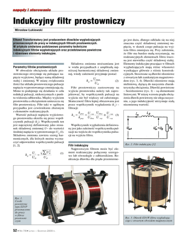 Indukcyjny filtr prostowniczy Mirosław Łukiewski Elhand Transformatory jest producentem dławików wygładzających przeznaczonych do pracy w indukcyjnych filtrach prostowniczych. W artykule omówiono podstawowe parametry techniczne indukcyjnych filtrów wygładzających oraz przedstawiono powietrzne i rdzeniowe elementy indukcyjne. Parametry filtrów prostowniczych W obwodzie obciążenia układu prostowniczego otrzymuje się pulsujące napięcie wyjściowe, będące sumą składowej stałej i zmiennej. W miarę zwiększania ilości faz układu prostowniczego pulsacje napięcia wyprostowanego zmniejszają się. Mimo to podejmuje się działania w celu redukcji pulsacji, niekorzystnych z punktu widzenia odbiornika. Między wyjściem prostownika a obciążeniem umieszcza się filtr prostowniczy. Filtr taki w ogólnym przypadku jest czwórnikiem złożonym z elementów reaktancyjnych. Wartość pulsacji napięcia wyjściowego prostownika określa się przez współczynnik pulsacji (kp). Współczynnik ten jest najczęściej definiowany jako stosunek składowej zmiennej U~ do wartości średniej napięcia wyprostowanego UO (1). Składowa zmienna zawiera szereg harmonicznych, dla których można wyznaczyć odpowiednie współczynniki pulsacji [1, 2]. (1) Rys. 1. Cewki powietrzne typu ED1P przeznaczone do pracy w filtrze prostowniczym 52 l Nr 7/8 l Lipiec – Sierpień 2009 r. Składowa zmienna utożsamiana jest w wielu przypadkach z amplitudą najniższej harmonicznej składowej zmiennej, wtedy zależność przyjmuje postać: (2) Filtr prostowniczy zastosowany na wyjściu prostownika należy tak zaprojektować, by współczynnik pulsacji na wyjściu nie był większy od założonego. Skuteczność filtru lepiej obrazowana jest przez współczynnik wygładzenia (k w) – filtracji: go jest duża, dlatego odkłada się na niej znaczna część składowej zmiennej napięcia, w skutek czego pulsacja na wyjściu filtru zmniejsza się. Przy założeniu, że filtr ma bardzo małą rezystancję, na reaktancyjnych elementach filtru tracona jest niewielka część składowej stałej. Elementy indukcyjne pracujące w filtrach wygładzających mają różne własności wynikające głównie z różnic konstrukcyjnych. Stosowane są dławiki rdzeniowe z otwartym lub zamkniętym magnetowodem (rys. 3, 4). Dławiki rdzeniowe mają nieliniową, dążącą do nasycenia charakterystykę obciążenia. Dławiki powietrzne – bezrdzeniowe (rys. 1) – są elementami liniowymi. W miarę wzrostu prądu obciążenia dławik powietrzny nie ulega nasyceniu, a jego indukcyjność utrzymuje stałą niezmienną wartość. (3) Współczynnik wygładzenia definiowany jest jako zależność współczynnika pulsacji na wejściu do współczynnika pulsacji na wyjściu filtru. Filtr indukcyjny Najprostszym filtrem może być element reaktancyjny połączony szeregowo lub równolegle z odbiornikiem. Reaktancja dławika dla prądu przemienne- Rys. 2. Filtr indukcyjny [1] Rys. 3. Dławik ED1W filtru wygładzającego z otwartym obwodem magnetycznym reklama w yr Rys.5 Dławik ED1W filtru wygładzającego z rdzeniem zamkniętym typu EI (8) Rys. 4. Dławik ED1W filtru wygładzającego z rdzeniem zamkniętym typu UI Prosty filtr indukcyjny przedstawia rys. 2. Załóżmy, że do odbiornika przyłożono napięcie o składowej zmiennej Um1. Wówczas przez obciążenie RO popłynie prąd przemienny o amplitudzie określonej równaniem (4) [1]. Indukcyjność LO i rezystancja R D dławika oraz rezystancja obciążenia RO decydują o wartości współczynnika wygładzenia. Wartość współczynnika będzie przy małych obciążeniach dążyła do jedności. Wymagane zmniejszenie pulsacji napięcia na obciążeniu zapewnimy, dobierając odpowiednią wartość indukcyjności dławika [1]: (4) (9) Przepływ prądu Im wywoła spadek napięcia Um na obciążeniu RO: Prąd na wyjściu prostownika będzie ciągły, jeśli współczynnik wygładzania k w będzie większy od współczynnika pulsacji na wejściu filtru kpwe. Zależność poniższa jest warunkiem ciągłości prądu, który należy brać pod uwagę podczas projektowania filtru. Współczynnik kh > 1 przedstawia udział wyższych harmonicznych w krzywej napięcia wyprostowanego [1]: (5) Rezystancja dławików przeznaczonych do pracy w filtrach powinna być bardzo mała w stosunku do jego reaktancji. W takim przypadku można przyjąć, że składowa stała napięcia na obciążeniu jest równa wartości średniej napięcia wyjściowego prostownika UO. Współczynniki pulsacji napięcia na wejściu oraz na wyjściu filtru można zapisać następująco: (6) ia na sj ak oÊ ç 42-700 Lubliniec ul. PCK 22 tel. (+48 34) 3531710, 3513220 fax (+48 34) 3564003 e-mail: [email protected] www.elhand.pl (10) TRANSFORMATORY Literatura [1] Lenart B.: Prostowniki stabilizowane. WMON, Warszawa 1972. [2] Lenart B., Sieradzan R.: Prostowanie i stabilizacja prądów i napięć. WMON, Warszawa 1960. (7) Możemy stąd wyznaczyć współczynnik wygładzenia filtru indukcyjnego. Dla większych obciążeń w obliczeniach należy uwzględnić również wartość rezystancji uzwojeń dławika RD: ó˝ n moc od 0,05 kVA do 1600 kVA DŁAWIKI silnikowe, sieciowe, filtracyjne, kompensacyjne, wygładzajàce, sprz´gajàce, specjalne ZASILACZE DC ELHAND TRANSFORMATORY ul. PCK 22 42-700 Lubliniec e-mail: [email protected] URZĄDZENIA SPECJALNE Nr 7/8 l Lipiec – Sierpień 2009 r. l 53
