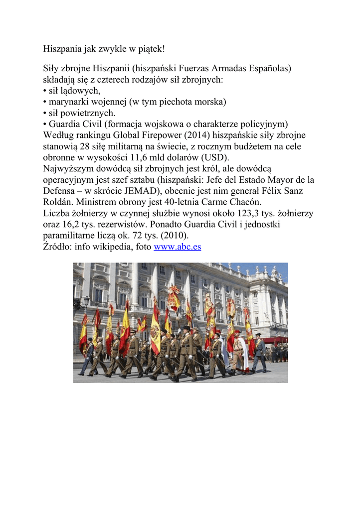 Hiszpania jak zwykle w piątek! Siły zbrojne Hiszpanii (hiszpański Fuerzas Armadas Españolas) składają się z czterech rodzajów sił zbrojnych: • sił lądowych, • marynarki wojennej (w tym piechota morska) • sił powietrznych. • Guardia Civil (formacja wojskowa o charakterze policyjnym) Według rankingu Global Firepower (2014) hiszpańskie siły zbrojne stanowią 28 siłę militarną na świecie, z rocznym budżetem na cele obronne w wysokości 11,6 mld dolarów (USD). Najwyższym dowódcą sił zbrojnych jest król, ale dowódcą operacyjnym jest szef sztabu (hiszpański: Jefe del Estado Mayor de la Defensa – w skrócie JEMAD), obecnie jest nim generał Félix Sanz Roldán. Ministrem obrony jest 40-letnia Carme Chacón. Liczba żołnierzy w czynnej służbie wynosi około 123,3 tys. żołnierzy oraz 16,2 tys. rezerwistów. Ponadto Guardia Civil i jednostki paramilitarne liczą ok. 72 tys. (2010). Źródło: info wikipedia, foto www.abc.es