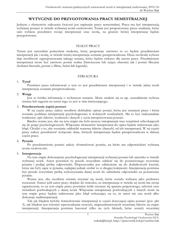 Osobowość: warsztat praktycznych zastosowań teorii w interpretacji zachowania, 2015/16 dr Wacław Bąk WYTYCZNE DO PRZYGOTOWANIA PRACY SEMESTRALNEJ Jednym z elementów zaliczenia ćwiczeń jest napisanie pracy semestralnej. Praca ma być interpretacją wybranej postaci w świetle wybranej teorii osobowości. Temat jest proponowany przez studenta, który sam wybiera przedmiot swojej interpretacji oraz teorię, na gruncie której interpretacja będzie przygotowana. TEMAT PRACY Temat jest autorskim pomysłem studenta, który proponuje zarówno to co będzie przedmiotem interpretacji jak i teorię, w świetle której interpretacja zostanie przeprowadzona. Duża swoboda wyboru daje możliwość zaproponowania takiego tematu, który będzie ciekawy dla autora pracy. Przedmiotem interpretacji może być zarówno postać realna (historyczna lub żyjąca obecnie) jak i postać fikcyjna (bohater literacki, postać z filmu, baśni lub legendy). STRUKTURA 1. Tytuł Powinien jasno informować o tym co jest przedmiotem interpretacji i w świetle jakiej teorii interpretacja zostanie przeprowadzona. 2. Wstęp Jest to krótka informacja o wybranym temacie. Może znaleźć się tu np. uzasadnienie wyboru tematu lub sugestia na temat tego co jest w nim interesującego. 3. Przedstawienie (opis) postaci W tej części pracy należy możliwie dokładnie opisać postać, która jest tematem pracy i która zostanie poddana interpretacji psychologicznej w kolejnych rozdziałach. Ma to być maksymalnie konkretny opis faktów, wydarzeń i danych z życia interpretowanej postaci. Bardzo ważne jest, aby na tym etapie nie było jeszcze interpretacji oraz wyjaśnień odwołujących się do pojęć psychologicznych. Włączanie elementów interpretacji do opisu będzie traktowane jako błąd. Chodzi o to, aby wyraźnie oddzielić warstwę faktów (danych) od ich interpretacji. W tej części pracy należy przedstawić wyłącznie dane, których interpretacja będzie przeprowadzona w dalszej części pracy. 4. Pytanie Po przedstawieniu postaci należy sformułować pytanie, na które ma odpowiedzieć wybrana teoria osobowości. 5. Interpretacja Na tym etapie dokonujemy psychologicznej interpretacji wybranej postaci lub zjawiska w świetle wybranej teorii. Autor powinien tu przede wszystkim odnieść się do postawionego wcześniej pytania i podjąć próbę odpowiedzi. Dopuszczalne jest odniesienie się do dodatkowych kwestii, które nie były ujęte w pytaniu, najlepiej jednak zrobić to w drugiej kolejności. Interpretacja powinna być przede wszystkim próbą wykorzystania danej teorii do udzielenia odpowiedzi na postawione pytanie. Ważne jest, aby możliwie wiernie trzymać się teorii, która została wybrana jako podstawa rozważań. Nawet jeśli autor pracy dojdzie do wniosku, że interpretacja w świetle tej teorii ma swoje ograniczenia, to na tym etapie pracy powinien ściśle trzymać się aparatu pojęciowego, założeń oraz twierdzeń pochodzących z danej teorii. Włączanie interpretacji pochodzących z innych teorii na tym etapie pracy będzie traktowane jako błąd wskazujący na to, że autor nie zna teorii albo dokonuje nadinterpretacji. Tak jak błędem byłoby formułowanie interpretacji w części dotyczącej opisu postaci (por. pkt 3), tak błędem jest również wprowadzanie nowych, nieprzedstawionych wcześniej faktów na etapie interpretacji. Interpretacja powinna bazować tylko na tych faktach, które zostały wcześniej 1 Wacław Bąk Katedra Psychologii Osobowości KUL [email protected], http://pracownik.kul.pl/waclaw.bak Osobowość: warsztat praktycznych zastosowań teorii w interpretacji zachowania, 2015/16 dr Wacław Bąk przedstawione. Można formułować też hipotezy interpretacyjne, na poparcie których nie ma pełnych dowodów w opisie postaci, powinno jednak być wyraźnie zaznaczone, że ma to status hipotezy. 6. Podsumowanie Na koniec należy krótko podsumować pracę formułując ogólne wnioski i konkluzje oraz przemyślenia autora. Powinno tu również znaleźć się syntetyczne podsumowanie odpowiedzi na pytanie postawione w pkt 4. Na tym etapie można też wskazać na ewentualne słabe strony teorii, która była podstawą interpretacji oraz przeprowadzić dyskusję z przedstawionym wcześniej sposobem myślenia. Można napisać z jakimi aspektami analizowanego zjawiska teoria „nie radzi” sobie najlepiej oraz wskazać na alternatywne możliwości interpretacji, odwołujące się do innych teorii. Te kierunki alternatywnych interpretacji nie muszą oczywiście być tak rozbudowane jak wcześniejsza właściwa interpretacja. 7. Spis literatury Jest to lista wszystkich źródeł, z jakich korzystano podczas przygotowywania pracy. Lista może uwzględniać zarówno źródła psychologiczne (podręczniki, rozdziały, artykuły naukowe) jak i „pozapsychologiczne” (np. biografie, artykuły prasowe, źródła filmowe, itp.). Źródła „pozapsychologiczne” będę podstawą opisu interpretowanej postaci lub zjawiska. Natomiast źródła psychologiczne będą potrzebne Autorowi do pogłębienia znajomości teorii, która jest podstawą interpretacji. Dobrze widziane jest sięganie nie tylko do podstawowych podręczników z psychologii osobowości. Skorzystanie z dodatkowych źródeł w postaci tekstów źródłowych, opracowań monograficznych, książek, rozdziałów, artykułów itp., w których dana teoria jest opisana dokładniej niż w podstawowym podręczniku, może pozytywnie wpłynąć na jakość pracy i w efekcie na jej ocenę. Wszystkie tego typu dodatkowe źródła należy zamieścić w spisie literatury, ale mogą znaleźć się tu oczywiście wyłącznie te pozycje, z których autor rzeczywiście korzystał. Spis literatury powinien być sporządzony według standardów APA. Można tu opierać się na wytycznych opisanych w: Harasimczuk, J., Cieciuch, J. (2012). Podstawowe standardy edytorskie naukowych tekstów psychologicznych w języku polskim na pods