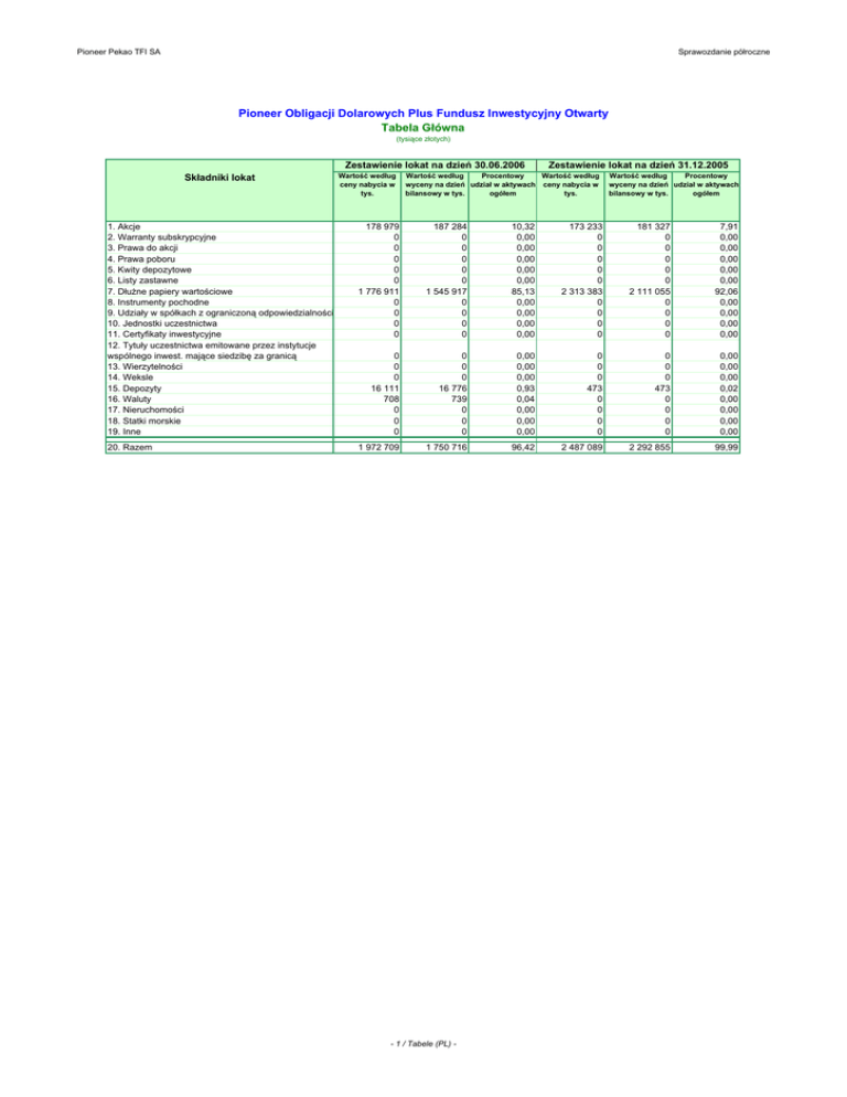 Pioneer Pekao TFI SA Sprawozdanie półroczne Pioneer Obligacji Dolarowych Plus Fundusz Inwestycyjny Otwarty Tabela Główna (tysiące złotych) Zestawienie lokat na dzień 30.06.2006 Składniki lokat Wartość według ceny nabycia w tys. Zestawienie lokat na dzień 31.12.2005 Wartość według Procentowy Wartość według wyceny na dzień udział w aktywach ceny nabycia w bilansowy w tys. ogółem tys. Procentowy Wartość według wyceny na dzień udział w aktywach ogółem bilansowy w tys. 1. Akcje 2. Warranty subskrypcyjne 3. Prawa do akcji 4. Prawa poboru 5. Kwity depozytowe 6. Listy zastawne 7. Dłużne papiery wartościowe 8. Instrumenty pochodne 9. Udziały w spółkach z ograniczoną odpowiedzialności 10. Jednostki uczestnictwa 11. Certyfikaty inwestycyjne 12. Tytuły uczestnictwa emitowane przez instytucje wspólnego inwest. mające siedzibę za granicą 13. Wierzytelności 14. Weksle 15. Depozyty 16. Waluty 17. Nieruchomości 18. Statki morskie 19. Inne 178 979 0 0 0 0 0 1 776 911 0 0 0 0 187 284 0 0 0 0 0 1 545 917 0 0 0 0 10,32 0,00 0,00 0,00 0,00 0,00 85,13 0,00 0,00 0,00 0,00 173 233 0 0 0 0 0 2 313 383 0 0 0 0 181 327 0 0 0 0 0 2 111 055 0 0 0 0 7,91 0,00 0,00 0,00 0,00 0,00 92,06 0,00 0,00 0,00 0,00 0 0 0 16 111 708 0 0 0 0 0 0 16 776 739 0 0 0 0,00 0,00 0,00 0,93 0,04 0,00 0,00 0,00 0 0 0 473 0 0 0 0 0 0 0 473 0 0 0 0 0,00 0,00 0,00 0,02 0,00 0,00 0,00 0,00 20. Razem 1 972 709 1 750 716 96,42 2 487 089 2 292 855 99,99 - 1 / Tabele (PL) - Pioneer Pekao TFI SA Sprawozdanie półroczne Pioneer Obligacji Dolarowych Plus Fundusz Inwestycyjny Otwarty Zestawienie lokat - Tabele uzupełniające (tysiące złotych) Akcje Akcje - RAZEM US0130681010 (Alberto-Culver Co) US03937R1023 (Arch Chemicals Inc) US0758111092 (Beckman Coulter Inc) US0905722072 (Bio-Rad Laboratories Inc) US1101221083 (Bristol-Myers Squibb Co) US30241L1098 (FEI Co) US6293775085 (NRG Energy Inc) US69329Y1047 (PDL BioPharma Inc) US7496851038 (RPM International Inc) US8460482057 (Sovereign Capital Trust) US8824911031 (Texas Industries Inc) US5311721048 (Liberty Property Trust) Rodzaj rynku Nazwa rynku Liczba Wartość według ceny nabycia w tys. Kraj siedziby emitenta 178 979 Aktywny rynek - rynek regulowany Aktywny rynek - rynek regulowany Aktywny rynek - rynek regulowany Aktywny rynek - rynek regulowany Aktywny rynek - rynek regulowany Aktywny rynek - rynek regulowany Aktywny rynek - rynek regulowany Aktywny rynek - rynek regulowany Aktywny rynek - rynek regulowany Aktywny rynek - rynek regulowany Aktywny rynek - rynek regulowany Aktywny rynek - rynek regulowany NYSE, Stany Zjednoczone NYSE, Stany Zjednoczone NYSE, Stany Zjednoczone American Stock Exchange NYSE, Stany Zjednoczone NASDAQ, Stany Zjednoczone NYSE, Stany Zjednoczone NASDAQ, Stany Zjednoczone NYSE, Stany Zjednoczone OTC - FTID NYSE, Stany Zjednoczone NYSE, Stany Zjednoczone 167 300 5 400 60 200 135 400 296 400 33 100 253 200 81 200 425 800 90 000 24 228 73 000 Stany Zjednoczone Stany Zjednoczone Stany Zjednoczone Stany Zjednoczone Stany Zjednoczone Stany Zjednoczone Stany Zjednoczone Stany Zjednoczone Stany Zjednoczone Stany Zjednoczone Stany Zjednoczone Stany Zjednoczone Wartość według Procentowy udział wyceny na dzień w aktywach ogółem bilansowy w tys. 187 284 10,32 25 156 478 10 636 26 565 25 114 2 532 30 305 5 424 25 287 13 418 3 956 10 108 25 933 619 10 640 27 975 24 387 2 388 38 813 4 756 24 385 13 029 4 093 10 266 1,43 0,03 0,59 1,54 1,34 0,13 2,14 0,26 1,34 0,72 0,23 0,57 178 979 0 0 187 284 0 0 10,32 0,00 0,00 III. Podsumowania Aktywny rynek - rynek regulowany Inny aktywny rynek Nienotowane na rynku aktywnym Warranty subskrypcyjne Warranty subskrypcyjne - RAZEM Prawa do akcji Prawa do akcji - RAZEM Prawa poboru Prawa poboru - RAZEM Rodzaj rynku Nazwa rynku Liczba Wartość według ceny nabycia w tys. Kraj siedziby emitenta 0 Rodzaj rynku Nazwa rynku Liczba Wartość według ceny nabycia w tys. Kraj siedziby emitenta Wartość według Procentowy udział wyceny na dzień w aktywach ogółem bilansowy w tys. 0 0,00 Wartość według wyceny na dzień bilansowy w tys. 0 Rodzaj rynku Nazwa rynku Liczba 2 3 4 5 6 Wartość według ceny nabycia w tys. Kraj siedziby emitenta 0 0 0 0 0 Rodzaj rynku Nazwa rynku Liczba 2 3 4 Rodzaj rynku Nazwa rynku Emitent Kraj siedziby emitenta Wartość według wyceny na dzień bilansowy w tys. 0,00 Procentowy udział w aktywach ogółem 0 0 0,00 0 0 0 0 0 0 0 0 0 0 0,00 0,00 0,00 0,00 0,00 Wartość według ceny nabycia w tys. Kraj siedziby emitenta Kwity depozytowe Kwity depozytowe - RAZEM Procentowy udział w aktywach ogółem 0 Wartość według wyceny na dzień bilansowy w tys. Procentowy udział w aktywach ogółem 0 0 0,00 0 0 0 0 0 0 0,00 0,00 0,00 Termin wykupu Warunki oprocentowania Rodzaj listu Podstawa emisji Wartość nominalna Listy zastawne Listy zastawne - RAZEM Wartość według wyceny Procentowy udział na dzień w aktywach ogółem bilansowy w tys. 0 0 0,00 Wartość według ceny nabycia w tys. Liczba 0 Odsetki naliczone od listów zastawnych notowanych na rynku aktywnym Odsetki naliczone od listów zastawnych nienotowanych na rynku aktywnym Dłużne papiery wartościowe Dłużne papiery wartościowe - RAZEM Rodzaj rynku 0 Nazwa rynku Emitent Kraj siedziby emitenta Termin wykupu Warunki oprocentowania Wartość Nominalna Wartość według ceny nabycia w tys. Liczba Wartość według wyceny na dzień bilansowy w tys. Procentowy udział w aktywach ogółem 1. O terminie wykupu do 1 roku a) Obligacje 0 0 1 776 911 0 0 1 522 807 0 0 83,86 0,00 0,00 b) Bony skarbowe 0 0 0 0,00 c) Bony pieniężne 0 0 0 0,00 d) Inne 0 0 0 0,00 501 393 501 393 1 776 911 1 776 911 1 522 807 1 522 807 83,86 83,86 2. O terminie wykupu powyżej 1 roku a) Obligacje US832724AB40 (MDPAC 7 1/2 11/20/25) US003924AG25 (ABY 8.55 08/01/10) US003669AC28 (ABY 6 06/20/13) US003924AB38 (ABY 7.4 04/01/18) US003924AH08 (ABY 8.85 08/01/30) US102175AB26 (BOW 7.95 11/15/11) US453258AR66 (N 3 1/2 03/14/52) US669936AA41 (NCX 7.4 04/01/