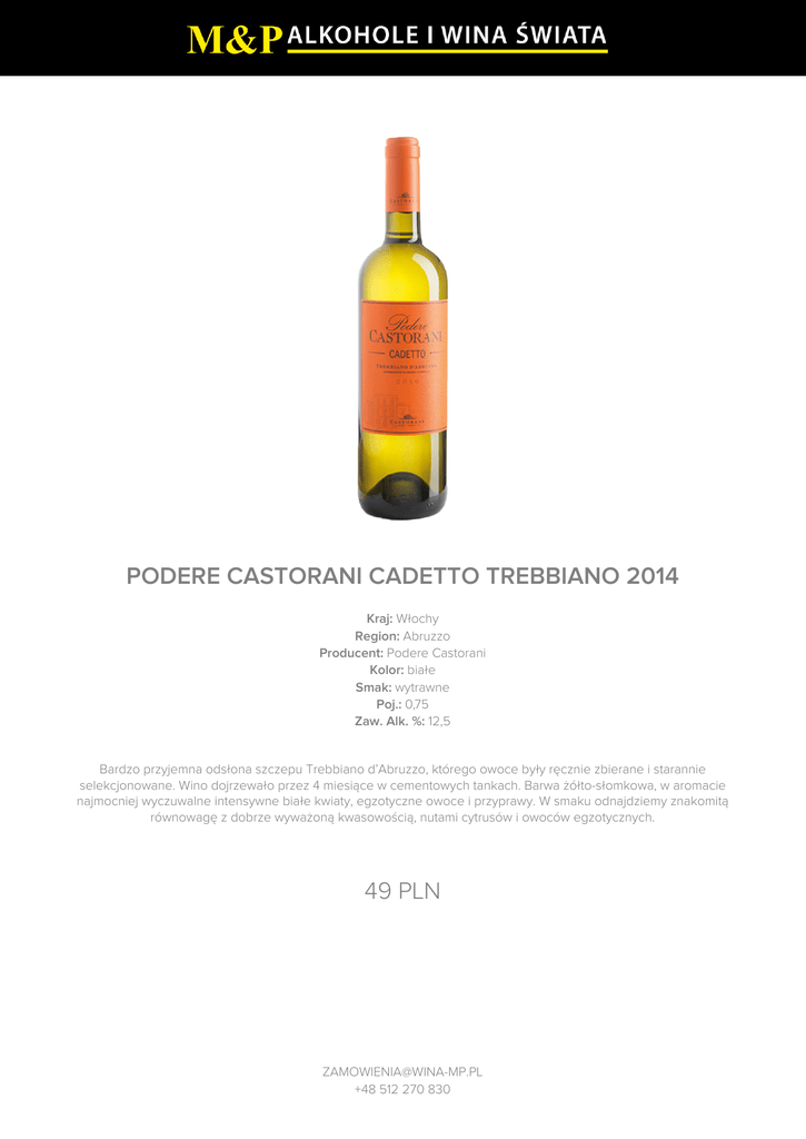 PODERE CASTORANI CADETTO TREBBIANO 2014 Kraj: Włochy Region: Abruzzo Producent: Podere Castorani Kolor: białe Smak: wytrawne Poj.: 0,75 Zaw. Alk. %: 12,5 Bardzo przyjemna odsłona szczepu Trebbiano d’Abruzzo, którego owoce były ręcznie zbierane i starannie selekcjonowane. Wino dojrzewało przez 4 miesiące w cementowych tankach. Barwa żółto-słomkowa, w aromacie najmocniej wyczuwalne intensywne białe kwiaty, egzotyczne owoce i przyprawy. W smaku odnajdziemy znakomitą równowagę z dobrze wyważoną kwasowością, nutami cytrusów i owoców egzotycznych. 49 PLN [email protected] +48 512 270 830