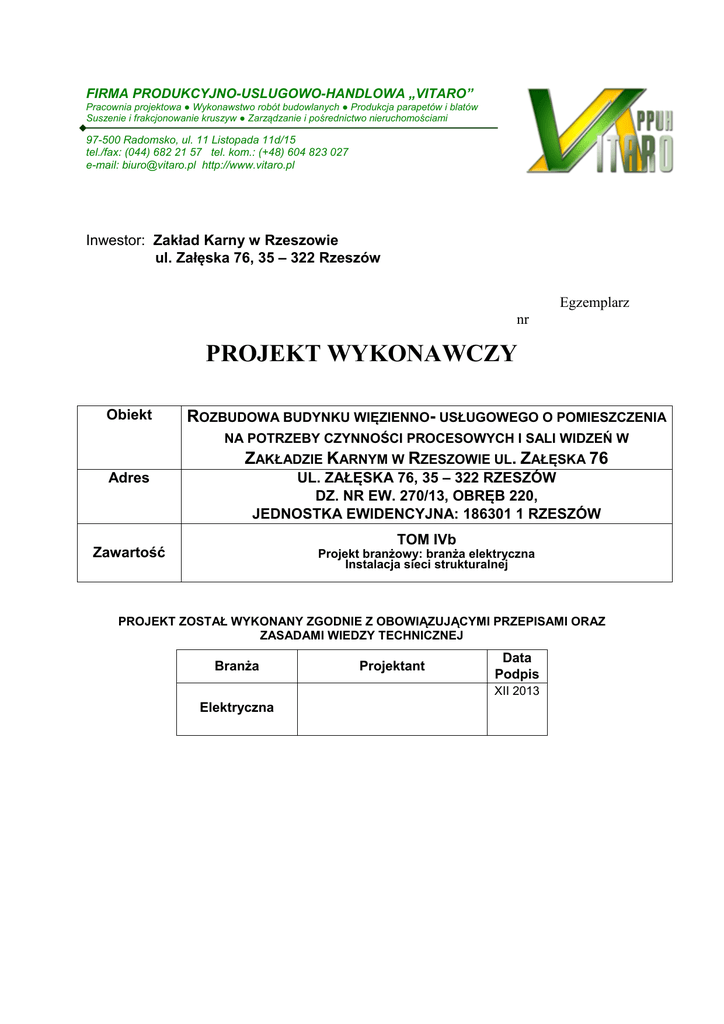 FIRMA PRODUKCYJNO-USLUGOWO-HANDLOWA „VITARO” Pracownia projektowa ● Wykonawstwo robót budowlanych ● Produkcja parapetów i blatów Suszenie i frakcjonowanie kruszyw ● Zarządzanie i pośrednictwo nieruchomościami 97-500 Radomsko, ul. 11 Listopada 11d/15 tel./fax: (044) 682 21 57 tel. kom.: (+48) 604 823 027 e-mail: [email protected] http://www.vitaro.pl Inwestor: Zakład Karny w Rzeszowie ul. Załęska 76, 35 – 322 Rzeszów Egzemplarz nr PROJEKT WYKONAWCZY Obiekt ROZBUDOWA BUDYNKU WIĘZIENNO- USŁUGOWEGO O POMIESZCZENIA NA POTRZEBY CZYNNOŚCI PROCESOWYCH I SALI WIDZEŃ W ZAKŁADZIE KARNYM W RZESZOWIE UL. ZAŁĘSKA 76 Adres UL. ZAŁĘSKA 76, 35 – 322 RZESZÓW DZ. NR EW. 270/13, OBRĘB 220, JEDNOSTKA EWIDENCYJNA: 186301 1 RZESZÓW Zawartość Projekt branżowy: branża elektryczna Instalacja sieci strukturalnej TOM IVb PROJEKT ZOSTAŁ WYKONANY ZGODNIE Z OBOWIĄZUJĄCYMI PRZEPISAMI ORAZ ZASADAMI WIEDZY TECHNICZNEJ Branża Projektant Data Podpis XII 2013 Elektryczna OŚWIADCZENIE (zgodne z art. 20 ust. 4 ustawy z dn. 7 lipca 1994r. Prawo Budowlane Dz. U. nr 89/94 poz. 414 z późniejszymi zmianami) Praca projektowa p.t. „rozbudowa budynku więzienno- usługowego o pomieszczenia na potrzeby czynności procesowych i sali widzeń w zakładzie karnym w Rzeszowie ul. Załęska 76” jest sporządzona prawidłowo, zgodnie z obowiązującymi przepisami, zawartymi umową i jest kompletna z punktu widzenia celu, któremu ma służyć. Wszelkie odstępstwa od rozwiązań typowych przyjętych w dokumentacji projektowej dokonane bez zgody zwalniają projektanta od odpowiedzialności prawnej z tytułu skutku wynikłego z dokonanej zmiany. Projektant: SPIS ZAWARTOŚCI PROJEKTU 1. Strona tytułowa. 2. Oświadczenie. 3. Spis zawartości projektu. 4. Uprawnienia budowlane i wpis do ŁOIIB. 5. Opis techniczny. SPIS RYSUNKÓW Rysunek nr 1 – rzut parteru – rozmieszczenie poszczególnych elementów instalacji, Rysunek nr 2 – rzut I piętra – rozmieszczenie poszczególnych elementów instalacji, Rysunek nr 3 – rzut II piętra – rozmieszczenie poszczególnych elementów instalacji Rysunek nr 4 - przebudowa kanalizacji teletechnicznej. Rysunek nr 5 - schemat instalacji okablowania strukturalnego. Rysunek nr 6 - schemat rozwinięty kanalizacji teletechnicznej. 1. OPIS TECHNICZNY 1.1 Zakres opracowania Projekt obejmuje swoim zakresem przebudowę istniejącej kanalizacji teletechnicznej, budowę Punktu Dystrybucyjnego oraz budowę okablowania strukturalnego. 1.1.1 Przebudowa kanalizacji teletechnicznej W związku z kolizją projektowanej inwestycji z istniejącą kanalizacją teletechniczną konieczna jest jej przebudowa. Trasa i lokalizacja poszczególnych elementów przedstawiona jest na rysunku nr 4. Projektowana przebudowa polegała będzie na rozbudowie istniejącej kanalizacji o dodatkowe rury PCW 110/3,2mm oraz studzienki teletechniczne SKR-2. Projektowaną kanalizację należy ułożyć na głębokości 0,6m do górnej rzędnej terenu. Przy zbliżeniach z istniejącymi sieciami uzbrojenia terenu prace należy wykonywać ręcznie z zachowaniem obowiązujących norm związanych z odległościami poszczególnych sieci od siebie. Projektowaną kanalizację należy prowadzić zgodnie z planem sytuacyjnym. Projektuje się dwie dodatkowe rury PCW 110/3,2mm we wspólnym wykopie o długości trasy 176m. Po trasie istniejącej kanalizacji należy doprowadzić rury do istniejących studzienek. Wykopy należy wykonywać ręcznie aby wyeliminować możliwość uszkodzenia istniejącej sieci. Przejście pod istniejąca drogą przejazdową należy wykonać metodą przecisku w rurze ochronnej HDPE 110/6,3mm dł. 9m na głębokości 1m. Na całej długości trasy należy ułożyć folię oznacznikową pomarańczową szerokości 25cm. Po wykonaniu prac teren należy przywrócić do stanu pierwotnego. Prace należy prowadzić bez odłączenia istniejących kabli teletechnicznych. W celu odnowienia połączenia punktów dystrybucji należy użyć dwóch kabli F-YAY 50x2x0,8 oraz światłowodu SM uniwersalny U-DQ(ZN)BH, 12J (6x2), 4.0kN. Kable należy prowadzić z wykorzystaniem projektowanej kanalizacji teletechnicznej oraz w budynku w korytach kablowych oraz szachtach teletechnicznych. Po przeprowadzeniu kabla 50-cio parowego kabel z dwóch stron należy zakończyć w łączówkach LSA 10 par. Łączówki należy umieścić w gniezdnikach. Kable światłowodowe mają być terminowane w światłowodowych panelach krosowych LC duplex o wysokości montażowej 1U. Prace te należy wykonać tak aby nie przerywać istniejących połączeń między punktami dystrybucji. Dodatkowo w celu powiązania systemów łączności telefonicznych, alarmowych oraz sygnalizacyjnych projektuje się dodatkowe kable wieloparowe. Kable należy prowadzić w szachtach teletechnicznych, kotytach kablowych oraz z wykorzystaniem kanalizacji teletechnicznej. Projektuje się dwa kable F-YAY 50x2x0,8 pomiędzy serwerownią a łącznikiem oraz dwa kable F-YAY 50x2x0,8 pomiędzy serwerownią a końcem korytarza za łącznikiem. Dodatkowo należy poprowadzić kable F-YAY 50x2x0,8 pomiędzy pomieszczeniem monitoringu a łącznikiem. Projektowane kable należy zakończyć identyczny sposób jak wyżej. 1.2 Założenia ogólne System okablowania strukturalnego ma zapewnić niezawodną i wydajną warstwę fizyczną sieci teleinformatycznej, która zagwarantuje wystarczający zapas parametrów transmisyjnych dla działania dzisiejszych i przyszłych aplikacji transmisyjnych. W celu spełnienia najwyższych wymogów jakościowych i wydajnościowych należy zapewnić: · Okablowanie miedziane przewyższające wymagania kategorii 6A (klasy EA). · Okablowanie skrętkowe w wersji ekranowanej. · Certyfikaty wydane przez międzynarodowe, renomowane laboratorium badawcze Delta, potwierdzające zgodność okablowania miedzianego z najnowszymi, aktualnymi normami okablowania strukturalnego ISO/IEC 11801:2011 (która zastępuje normy ISO/IEC 11801