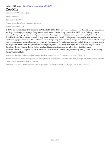 Adres URL strony http://www.emiasto.org/258676 Zoo Mix Cieszyn, 43-400, woj. śląskie Ulica: Liburnia Telefon: 784559343 Strona www: http://www.zoomixmarket.pl Email: [email protected] U NAS ZNAJDZIESZ TO CZEGO SZUKASZ ! ZOO-MIX sklep zoologiczno- wędkarski jest połączeniem zoologii, akwarystyki z pasją fascynatów wędkarstwa. Nasz sklep powstał w 2007 roku. Od tego czasu nawiązaliśmy współpracę z wiodącymi firmami działającymi w obrębie zoologii, akwarystyki i wędkarstwa . Dzięki tej współpracy stale powiększamy nasz asortyment oraz kształtujemy ceny produktów na bardzo konkurencyjnym poziomie. W 2010 roku powiększyliśmy powierzchnię sklepu do 280m2 oraz oddzieliliśmy asortyment zoologiczno-akwarystyczny od wędkarskiego. Dzięki temu powstał największy w regionie sklep zoologiczno-wędkarski. Bezpośrednio współpracujemy z takimi firmami jak Sera, Proplan, Royal Canin, Tropical, Tetra, Versele-Laga. Salon wędkarski zaopatrują natomiast takie firmy jak Shimano, Daiwa-Cormoran, Dragon, Jaxon, Robinson, hummenbird oraz w specjalistyczny asortyment dla karpiarzy firma Tandem Baits. Kategorie: Rozrywka i rekreacja Cieszyn, Wędkarstwo Cieszyn, Zoologiczne artykuły Cieszyn Słowa kluczowe: sklep zoologiczny, sklep wędkarski, wędakrstwo zoomix, zoo, mix, cieszyn, shimano, daiwa tandem baits, okuma, cormoran, jaxon, dragon Numer ID: 258676, liczba odsłon: 868, aktywacja: 21/03/2011 09:48:57, edycja: 21/03/2011 09:48:57 Strona 1 / 1