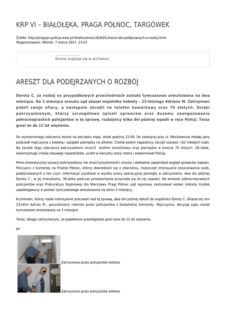 KRP VI – BIAŁOŁĘKA, PRAGA PÓŁNOC, TARGÓWEK Źródło: http://pragapn.policja.waw.pl/r6/aktualnosci/63620,Areszt-dla-podejrzanych-o-rozboj.html Wygenerowano: Wtorek, 7 marca 2017, 23:57 Strona znajduje się w archiwum. ARESZT DLA PODEJRZANYCH O ROZBÓJ Dorota C. za rozbój na przypadkowych przechodniach została tymczasowo aresztowana na dwa miesiące. Na 3 miesiące aresztu sąd skazał wspólnika kobiety - 23-letniego Adriana M. Zatrzymani pobili swoje ofiary, a następnie ukradli im telefon komórkowy oraz 70 złotych. Dzięki pokrzywdzonym, którzy szczegółowo opisali sprawców oraz dużemu zaangażowaniu północnopraskich policjantów w tę sprawę, rozbójnicy kilka dni później wpadli w ręce Policji. Teraz grozi im do 12 lat więzienia. Do wymienionego zdarzenia doszło na początku maja, około godziny 23.00. Do siedzącej przy ul. Mackiewicza młodej pary podszedł mężczyzna z kobietą i zażądali pieniędzy na alkohol. Chwilę potem napastnicy zaczęli szarpać i bić młodych ludzi. Na skutek tego zdarzenia pokrzywdzeni utracili telefon komórkowy oraz pieniądze w kwocie 70 złotych. 28-latek, wykorzystując chwilę nieuwagi napastników, uciekł w kierunku stacji metra i zaalarmował Policję. Mimo dramatycznej sytuacji pokrzywdzony nie stracił przytomności umysłu i dokładnie zapamiętał wygląd sprawców napadu. Policjanci z komendy na Pradze Północ, którzy dowiedzieli się o zdarzeniu, rozpoczęli intensywne poszukiwania osób, podejrzewanych o ten czyn. Informacje uzyskane w wyniku pracy operacyjnej pomogły w zatrzymaniu, dwa dni później Doroty C., w jej mieszkaniu. 36-latka podczas przesłuchania przyznała się do tej napaści. Na wniosek północnopraskich policjantów oraz Prokuratury Rejonowej dla Warszawy Pragi Północ sąd rejonowy zastosował wobec kobiety środek zapobiegawczy w postaci tymczasowego aresztowania na okres 2 miesięcy. Kryminalni, którzy nadal intensywnie pracowali nad tą sprawą, dwa dni później dotarli do wspólnika Doroty C. Okazał się nim 23-letni Adrian M., poszukiwany również przez policjantów z bielańskiej komendy. Mężczyzna, decyzją sądu został tymczasowo aresztowany na 3 miesiące. Teraz, obojgu zatrzymanym, za popełnione przestępstwo grozi kara do 12 lat więzienia. po Zatrzymana przez policjantów kobieta Zatrzymana przez policjantów kobieta Ocena: 3/5 (1) Tweetnij